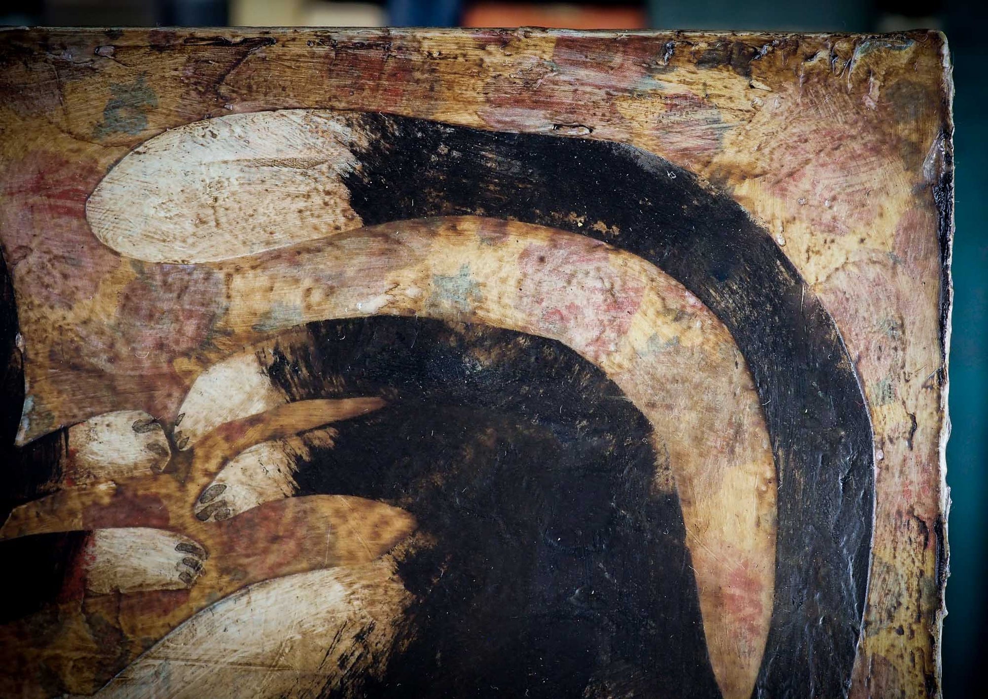 Created using paper collage techniques, combined with an alchemy of materials like acrylics, pastels, oil paint and many other materials over a wood panel in gallery style, with sides decorated with collage paper. Ready to hang on your favorite wall!