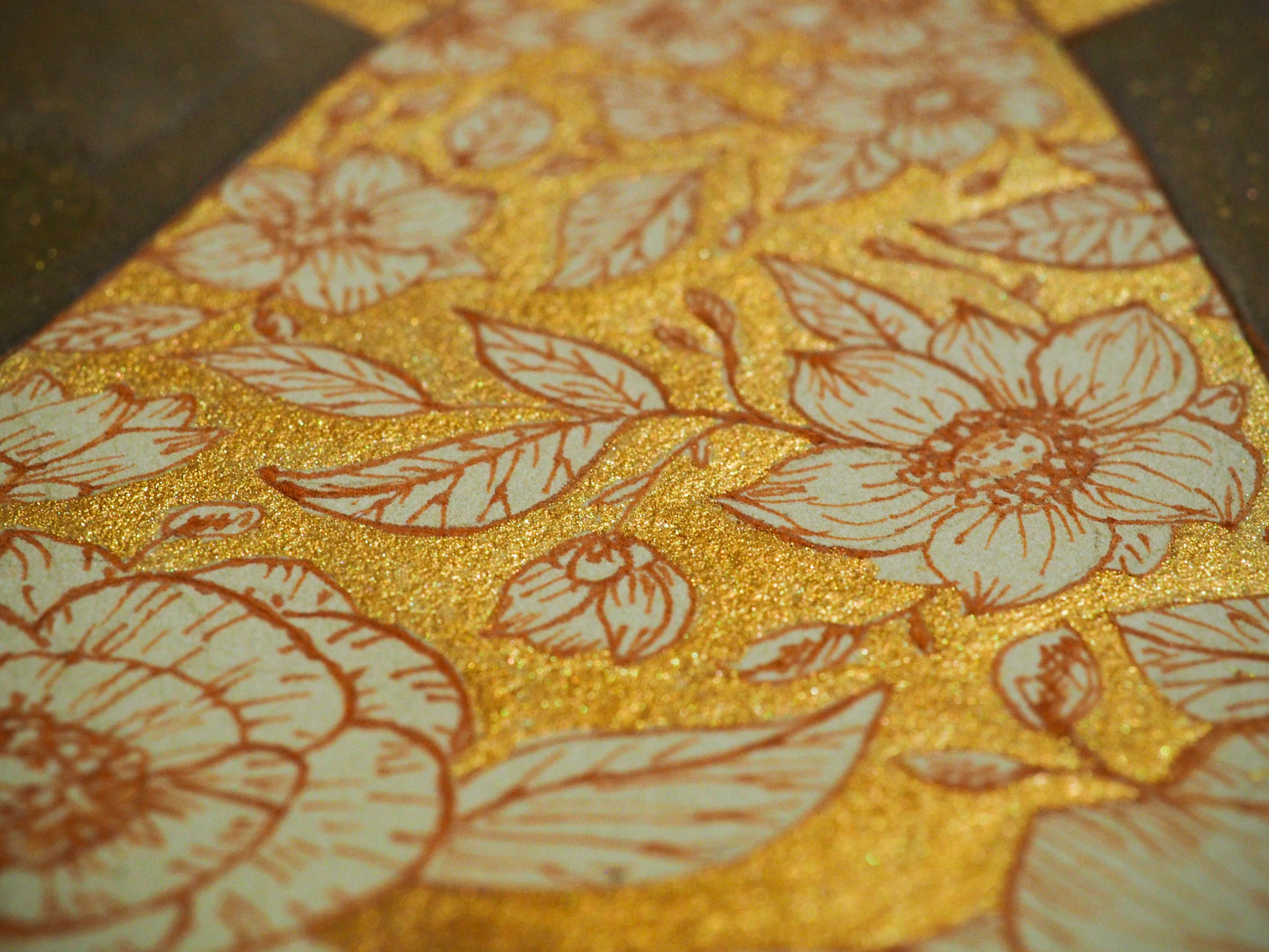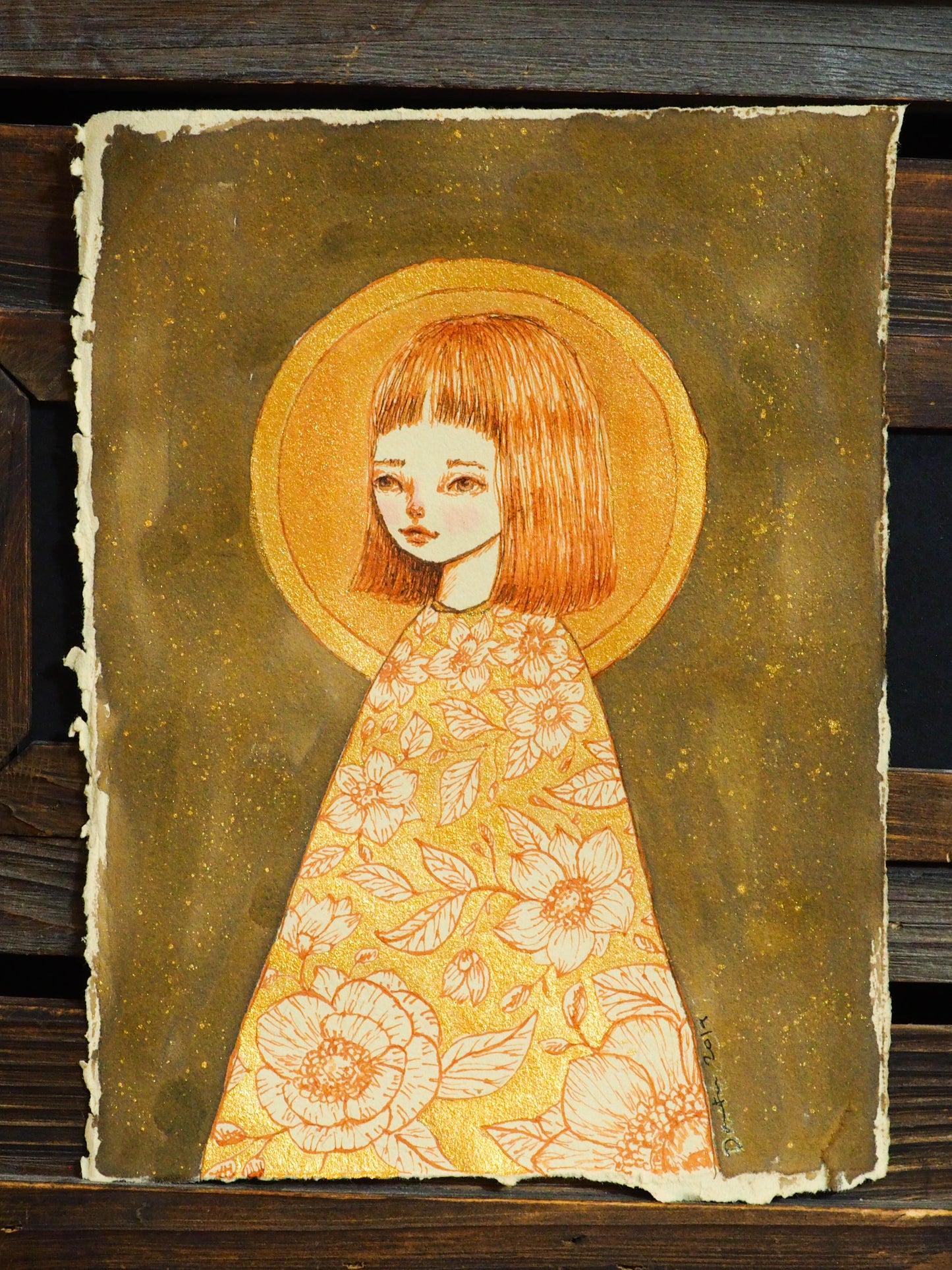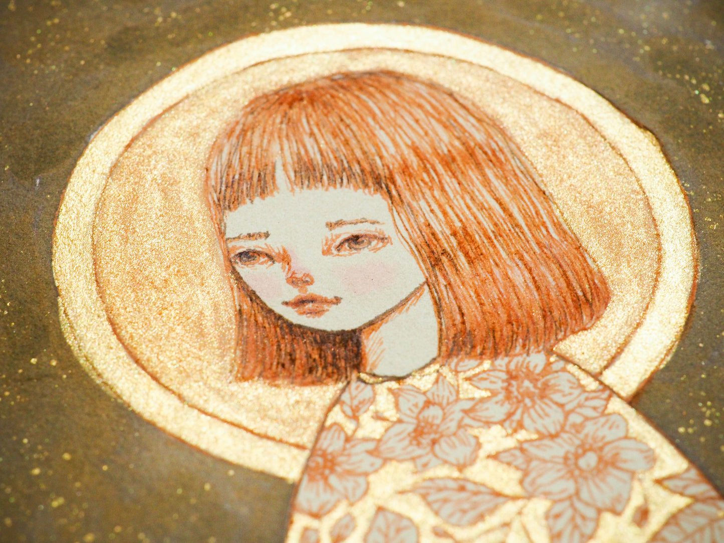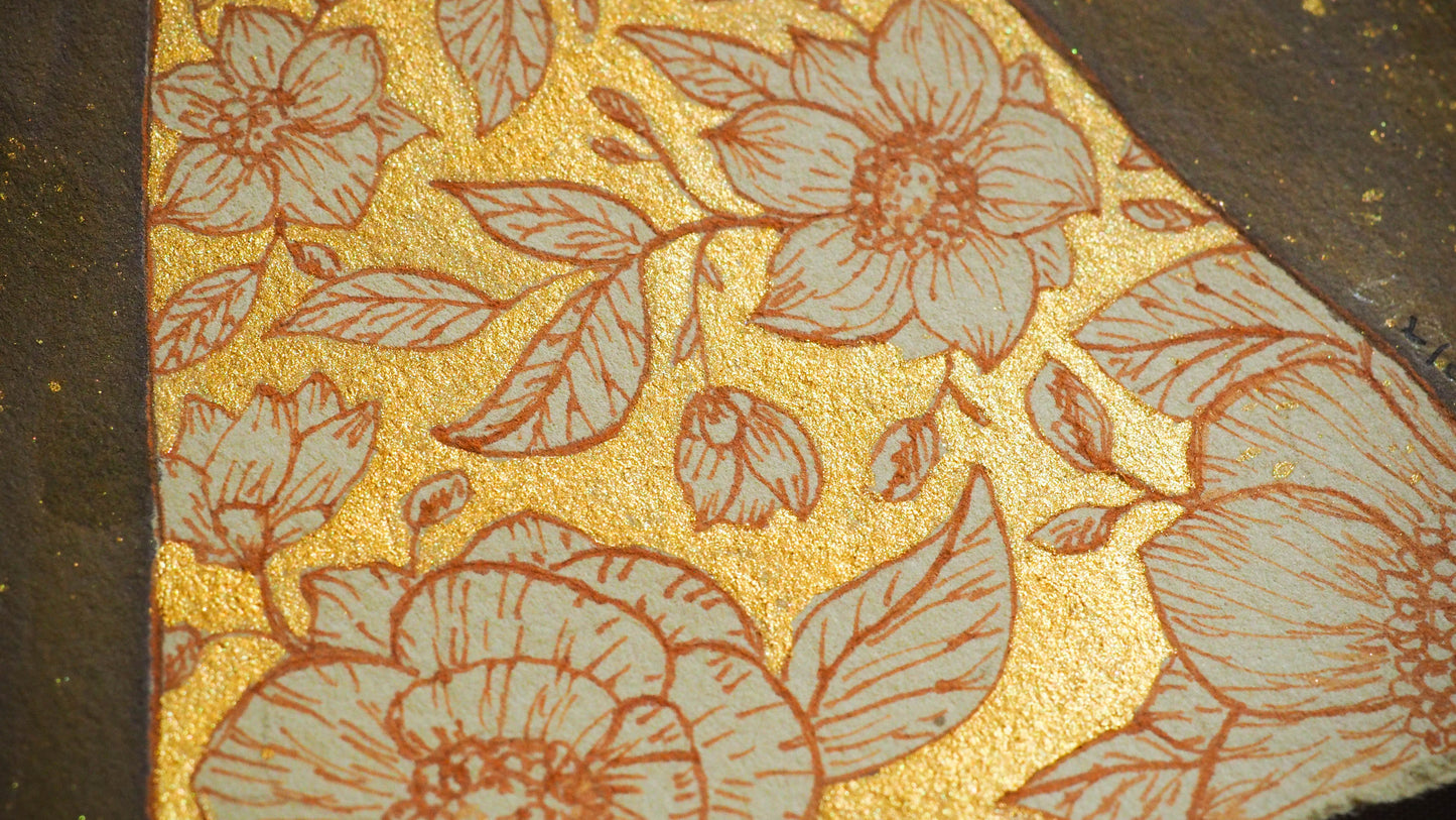 I love the golden swirls and flowers on this beautiful Watercolor, Gold Ink and pencil painting over paper. Everything has a special glimmer when the light hits it and you move it around.