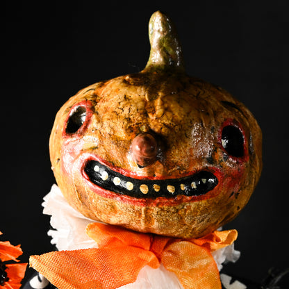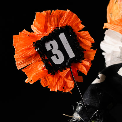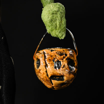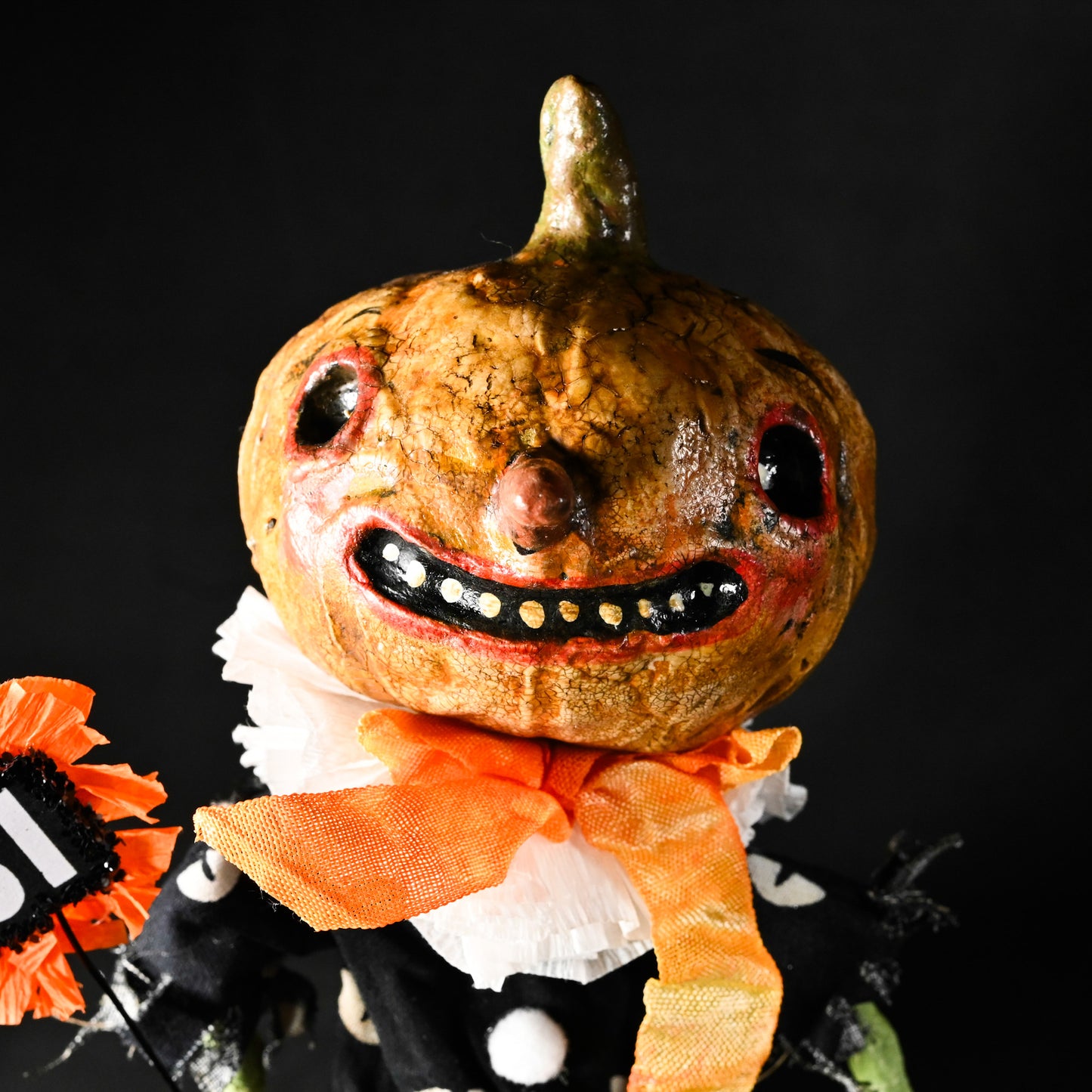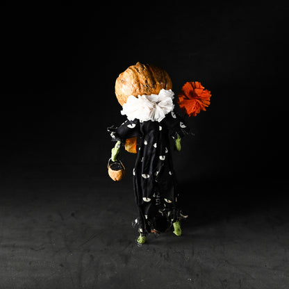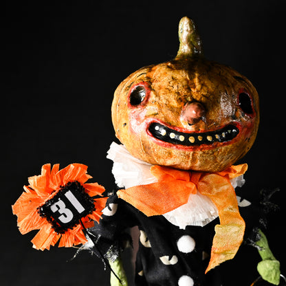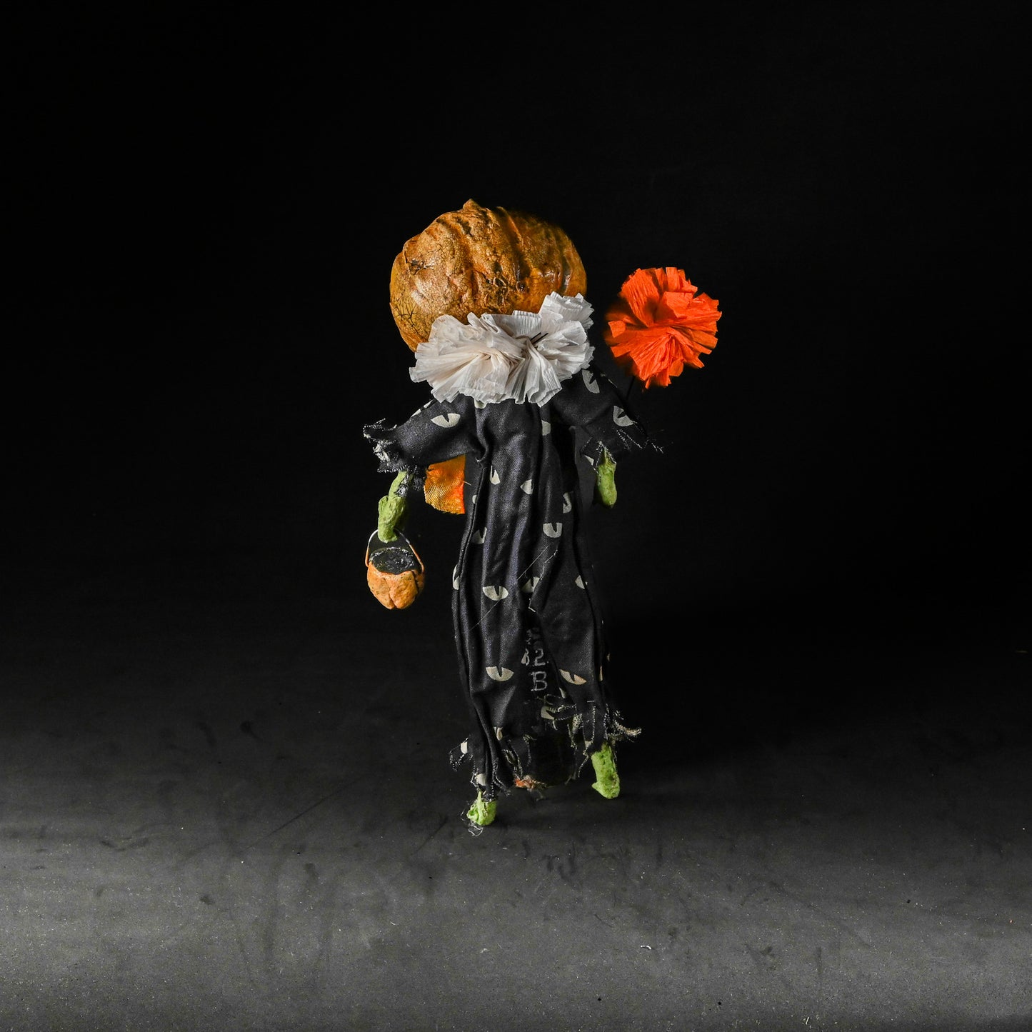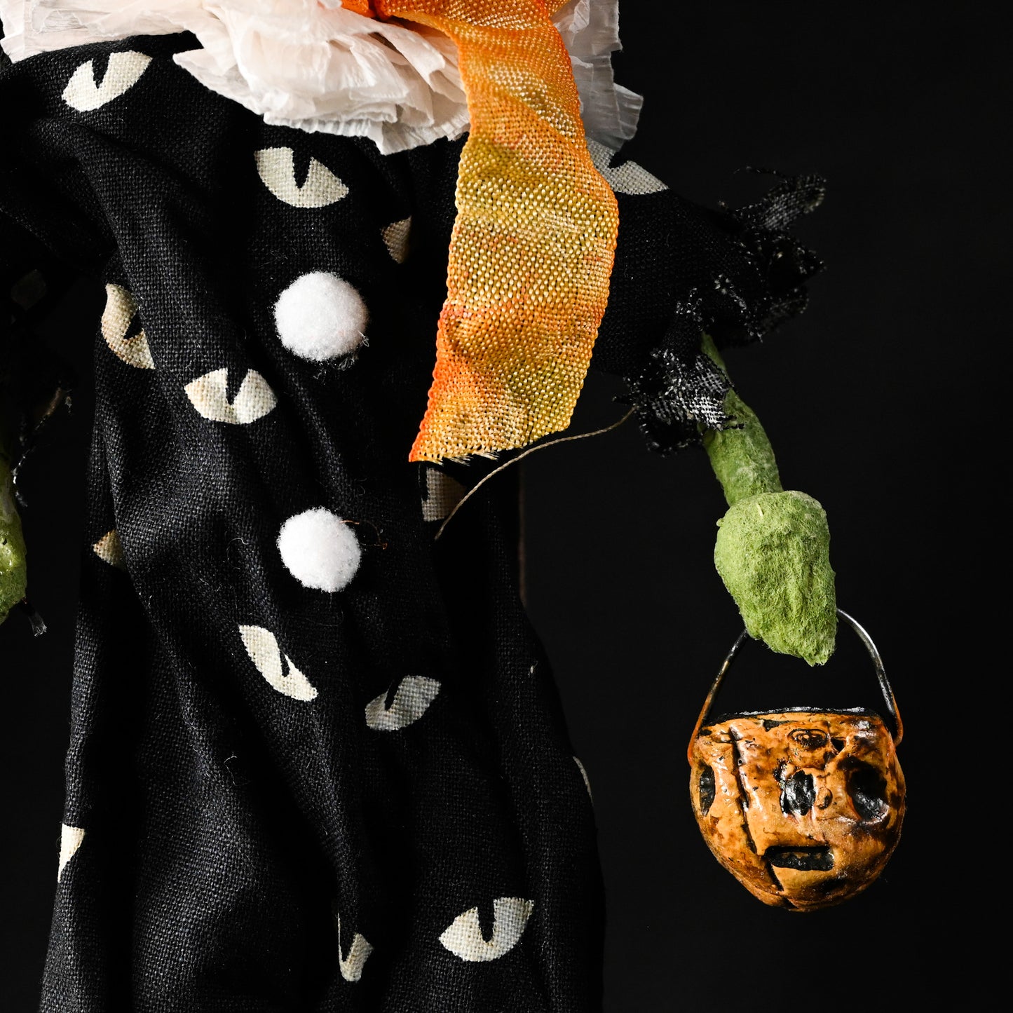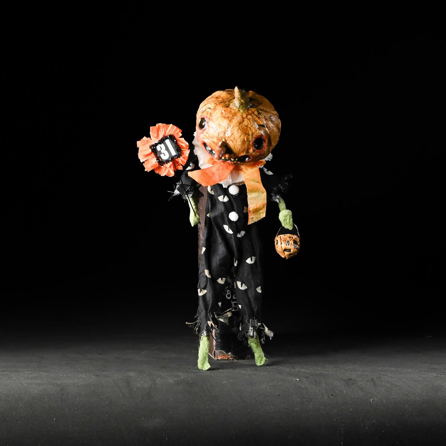 The Halloween art doll has a jack-o-lantern on its hand and it can be displayed sitting on a shelf, or hanging as an ornament from your Halloween or Christmas tree.