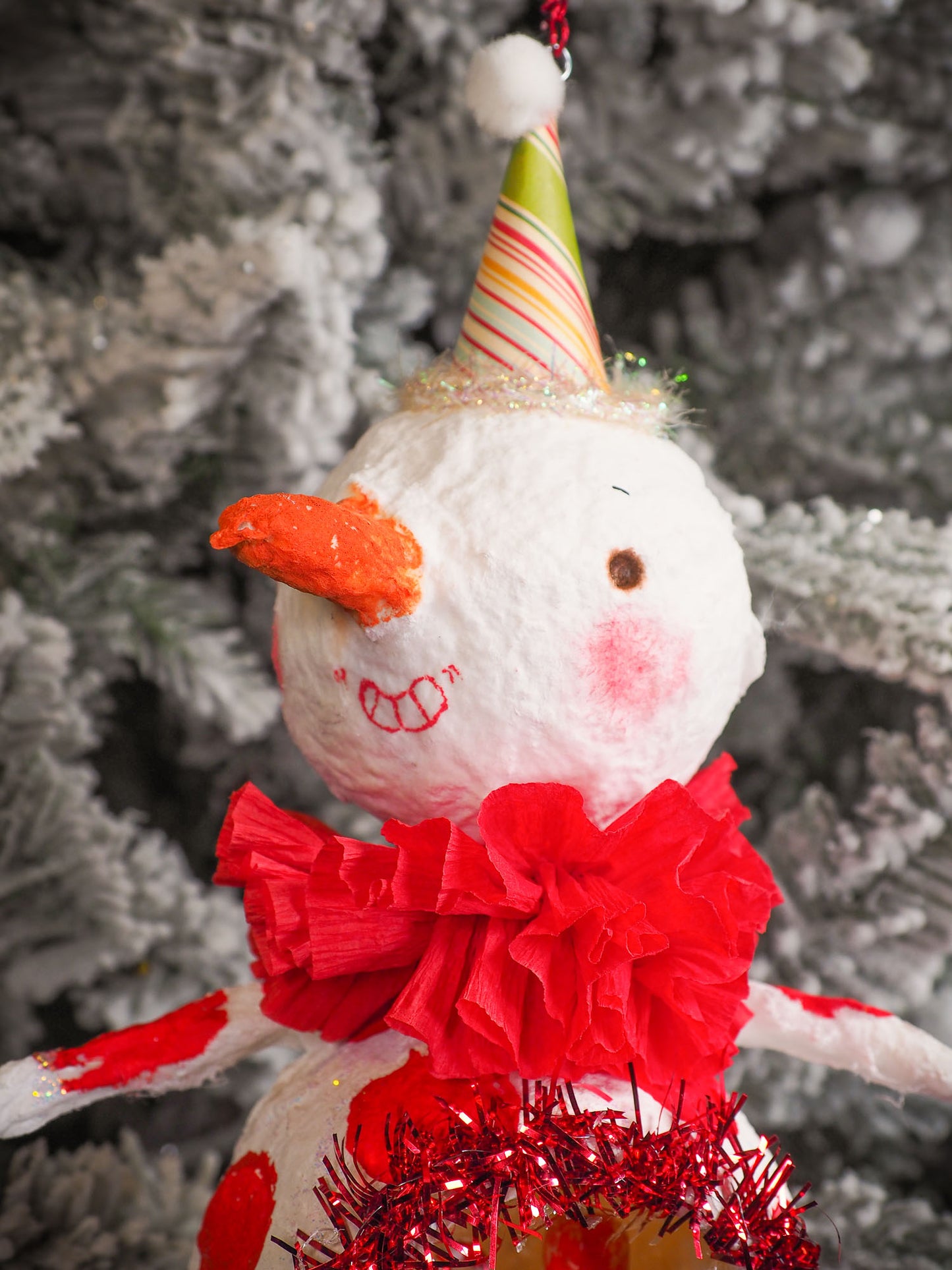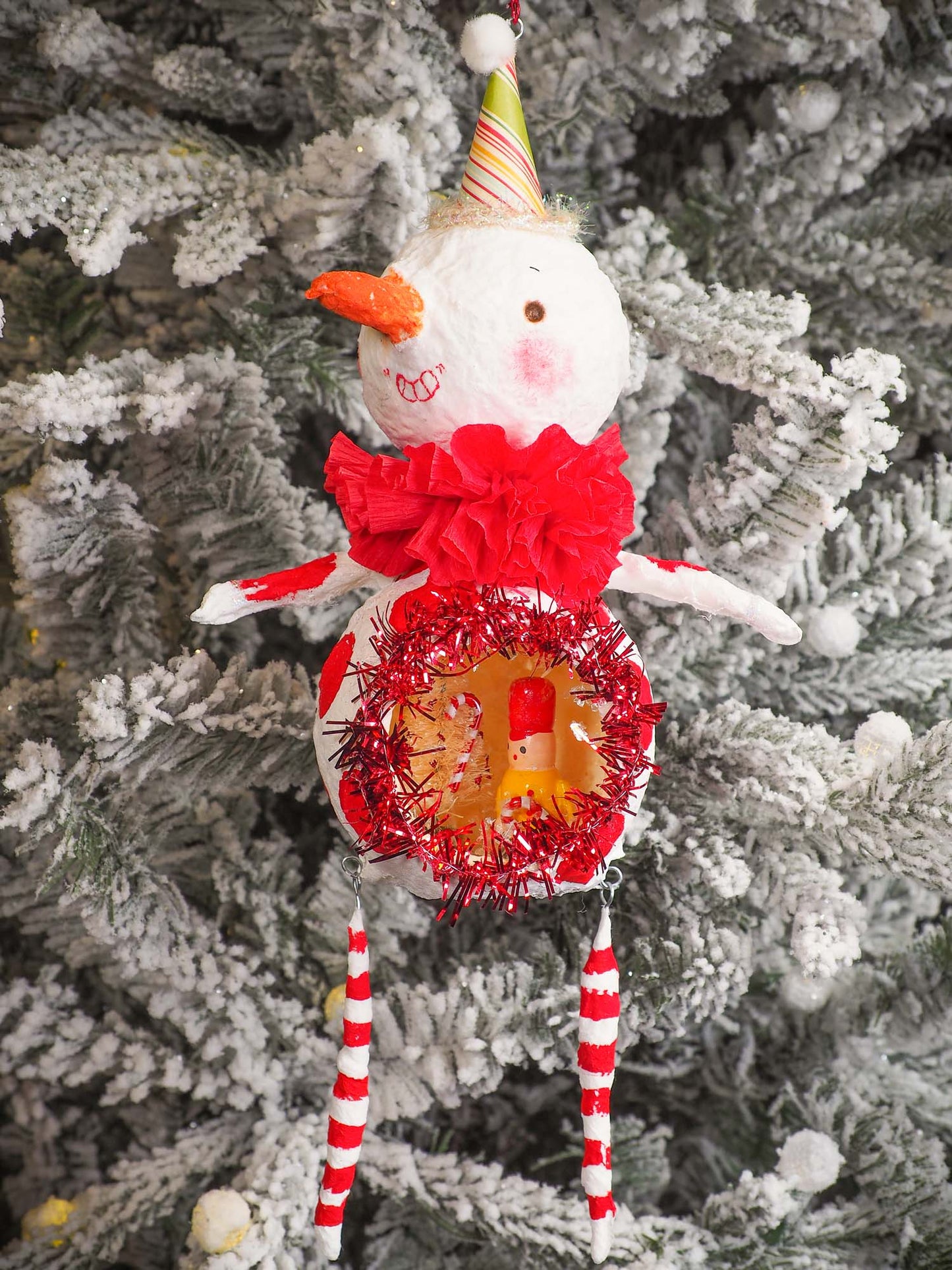 Adorable handmade spun cotton Art Doll Christmas tree ornament by Idania Salcido, the artist by Danita Art. Hand painted by the artist holiday figurine with paper hat with tinsel and vintage style garlands and a tiny Christmas tree. Hang this handmade ornament from your Christmas tree or use as Holiday decoration.