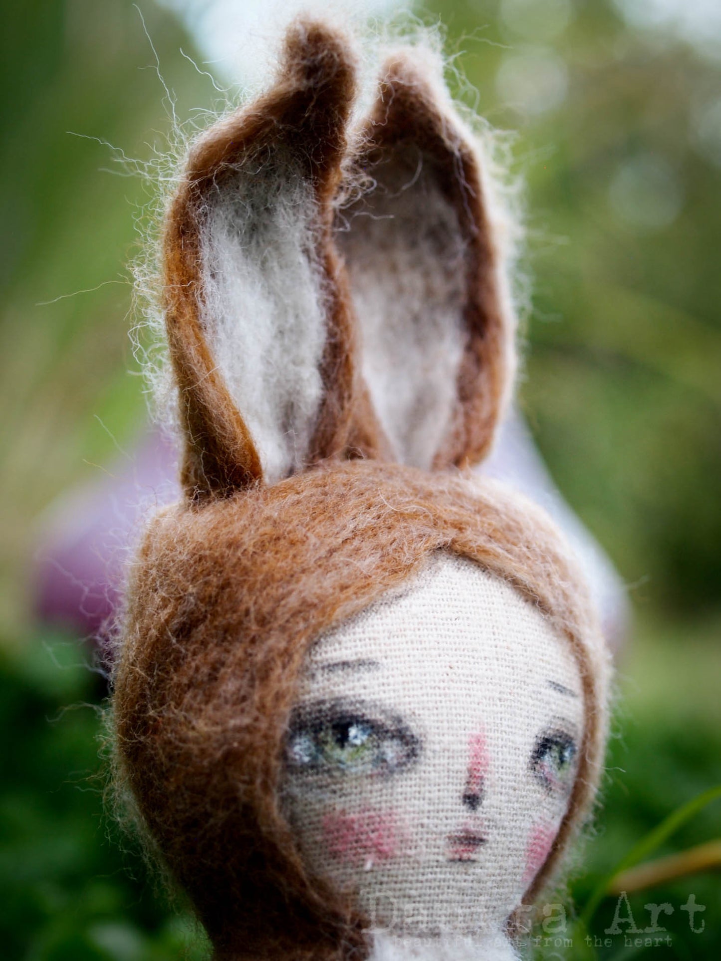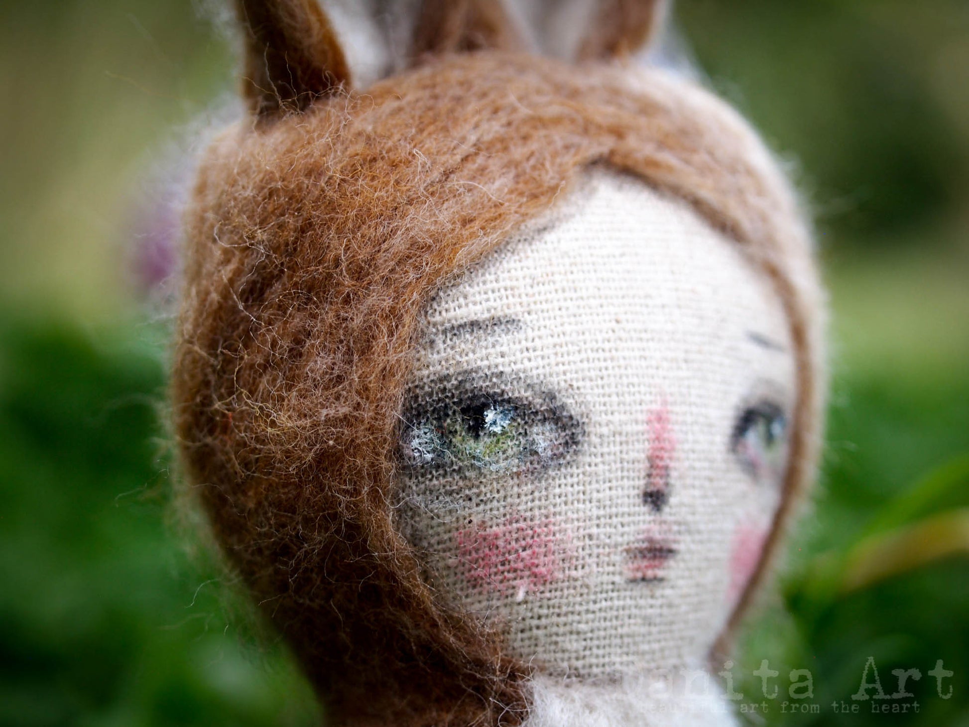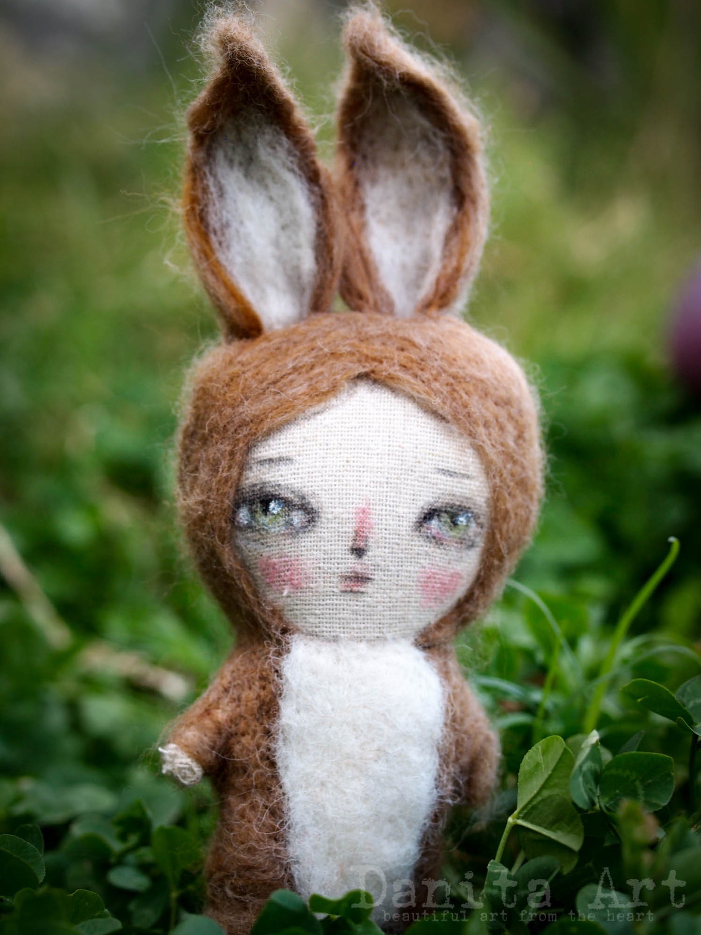 The dolls are made entirely by me, mixed media artist Danita. I start with a 7" handmade fabric doll, then I used needle felting techniques with real wool on their bodies to give them their super cure fur.