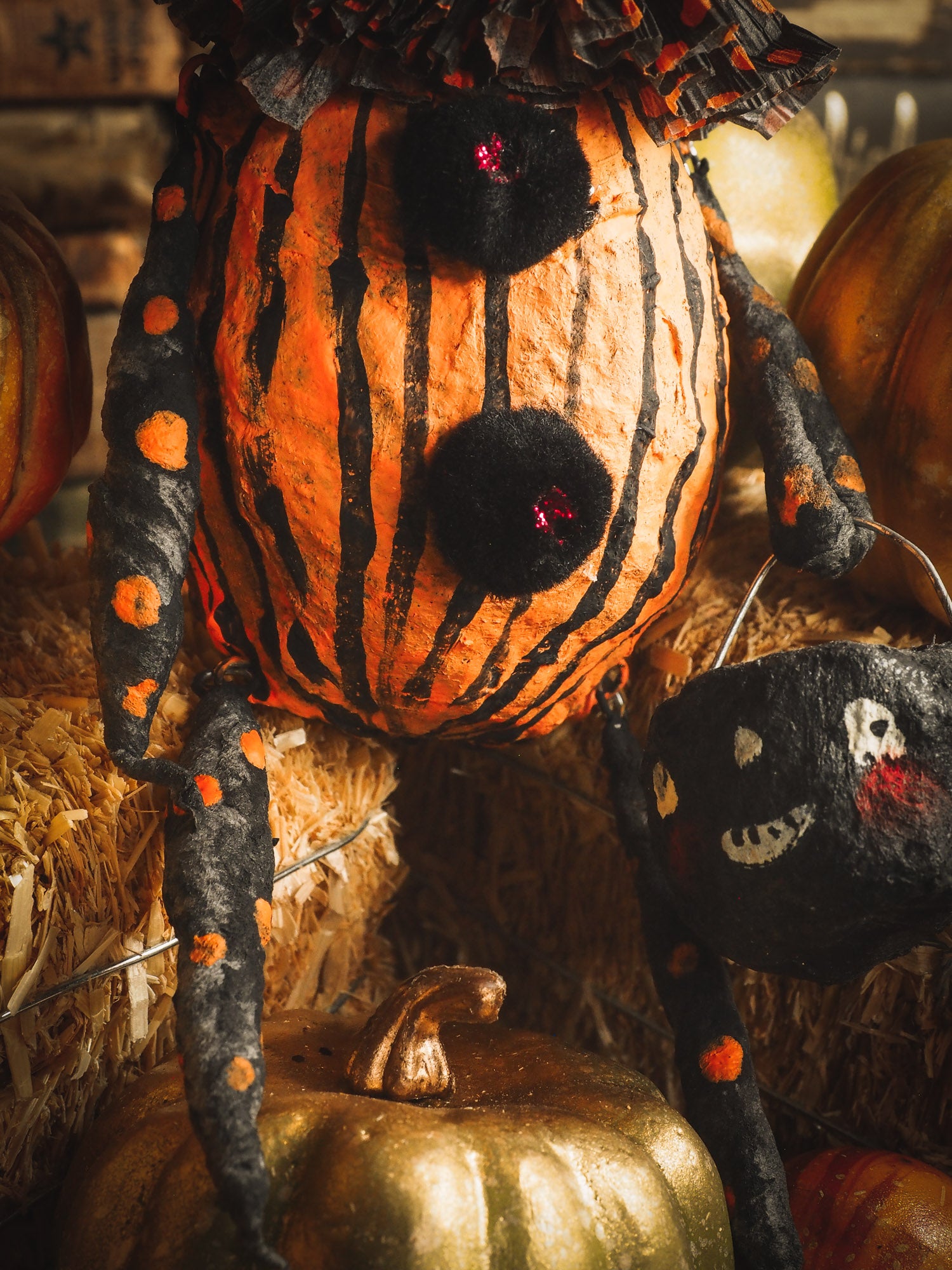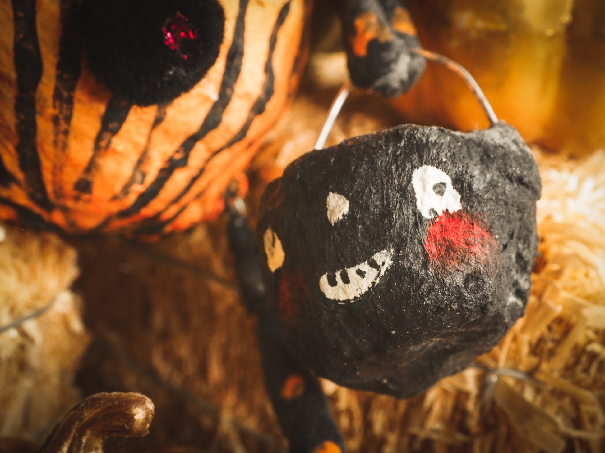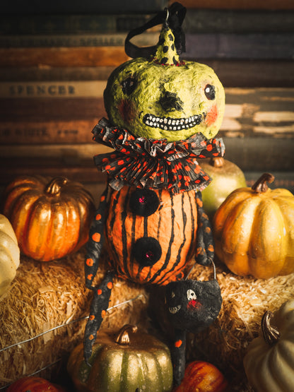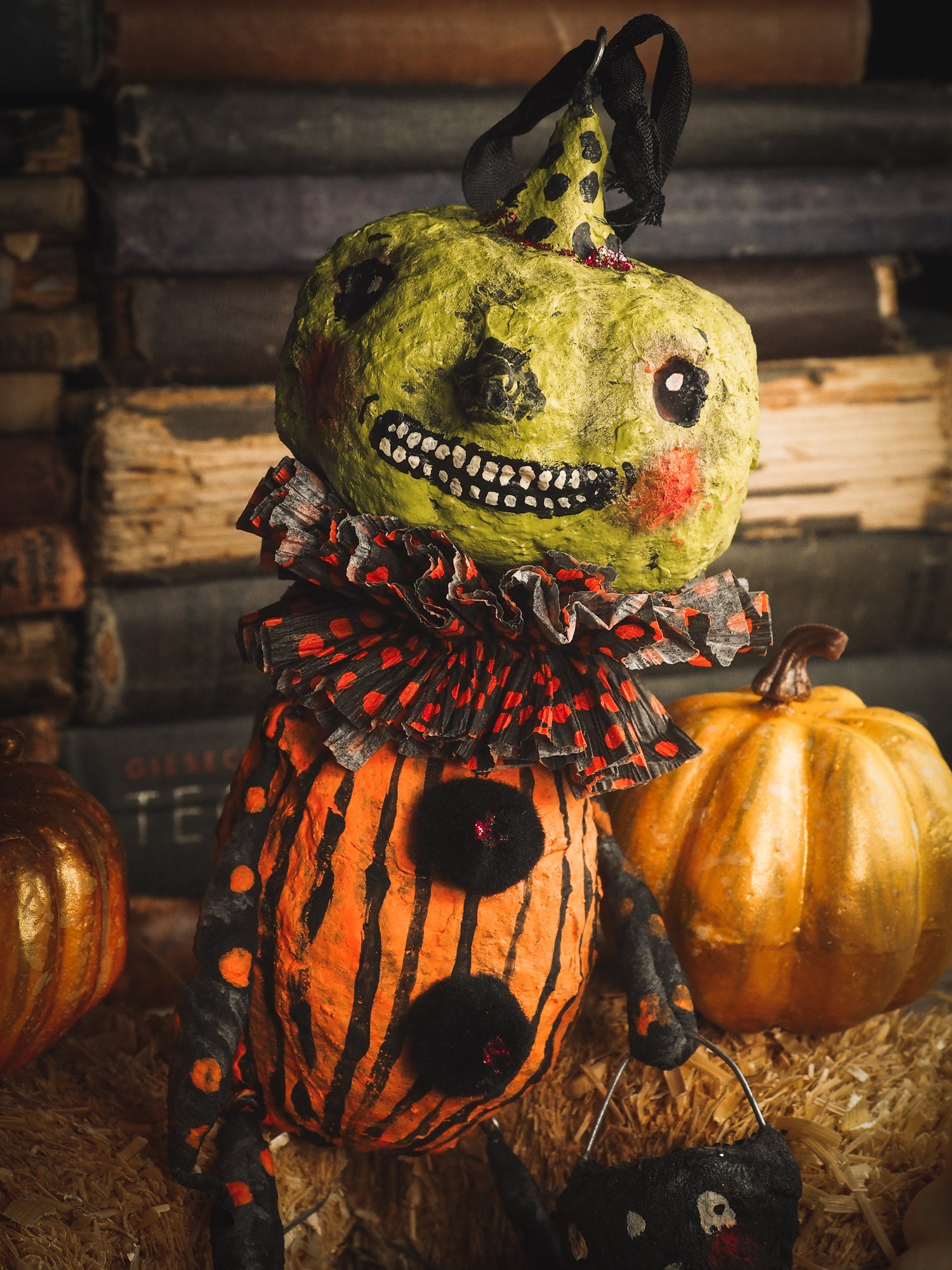 This time I created a collection of spun cotton jack-o-lantern pumpkin doll creatures with paper clothes. They have hand painted faces with super adorable details like little teeth, hand made jack-o-lantern pumpkins with glitter for their Halloween candy as they go trick-or-treat and matching collars and hats made out of paper.