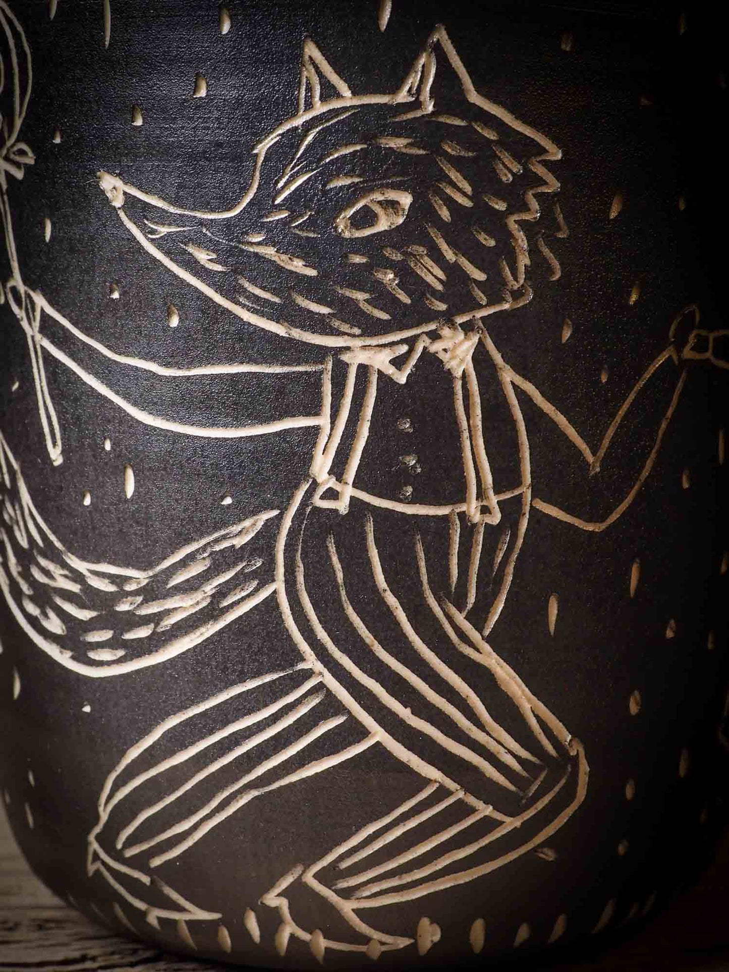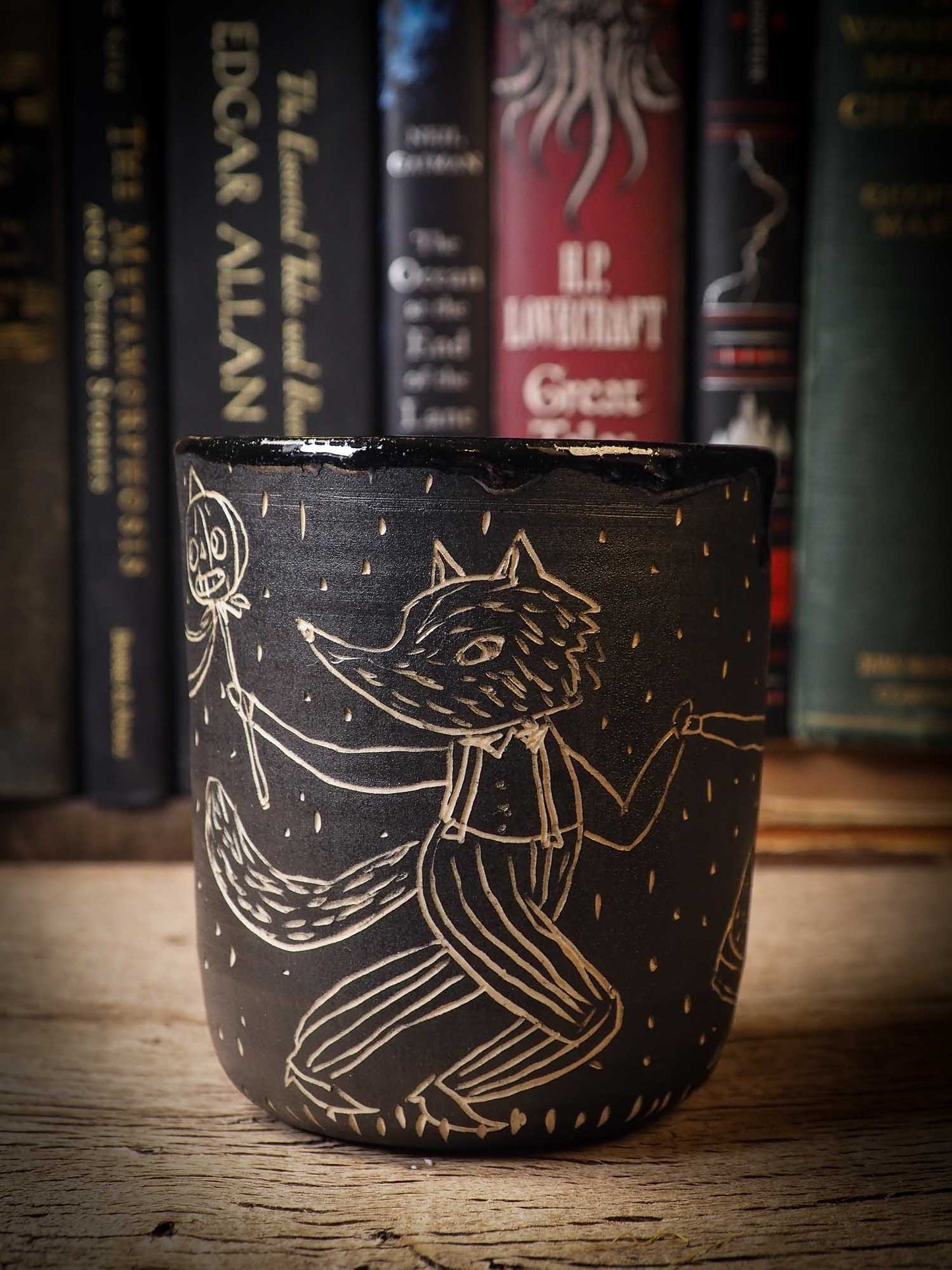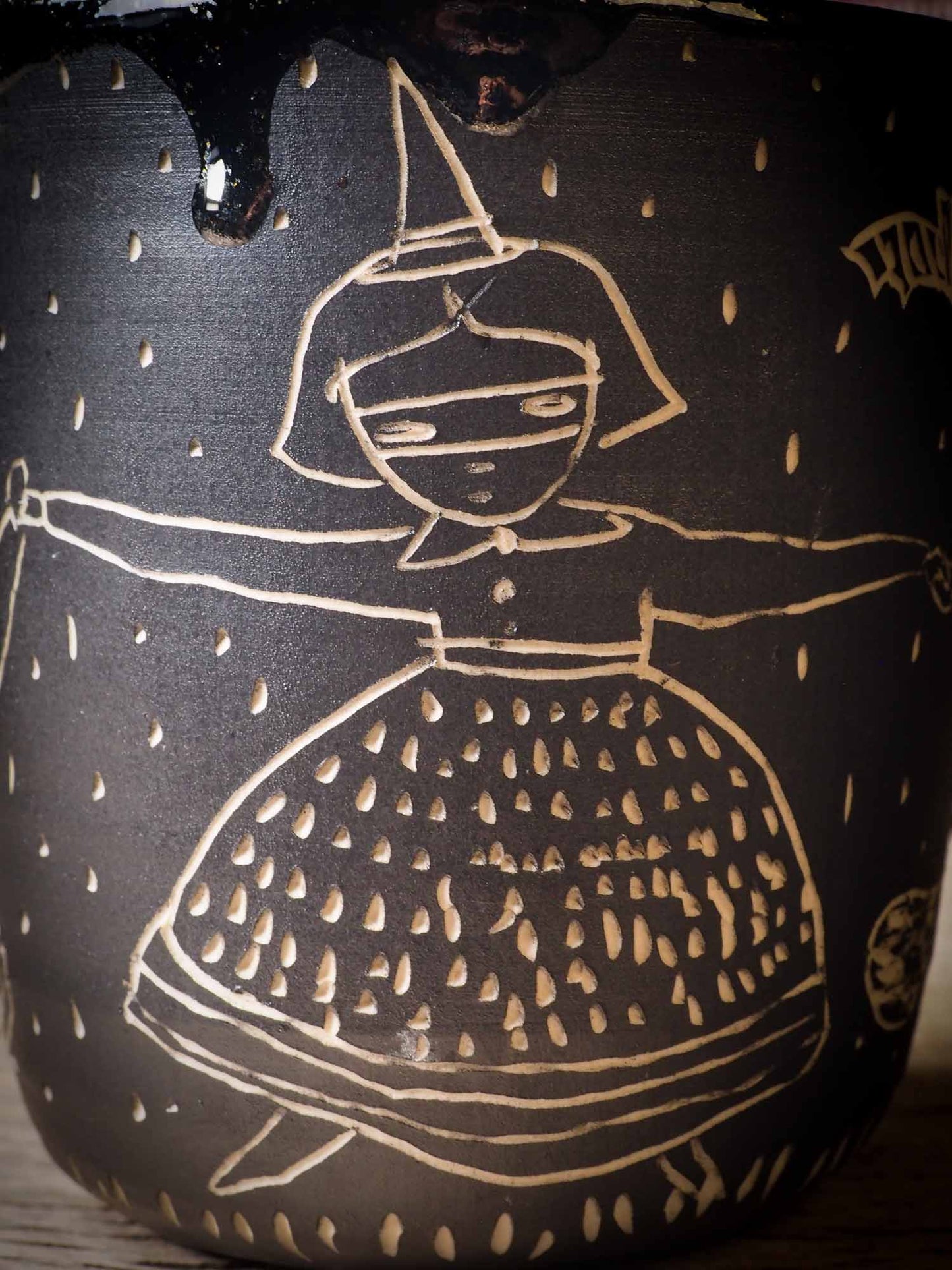 It measures 4 1/2 x 4 1/2 x 5 Inches, made with wheel thrown clay, hand carved and glazed by me with a dark, gooey glaze on the outside as well as the inside. The carved figures give it a nice, folk art primitive feel to it.