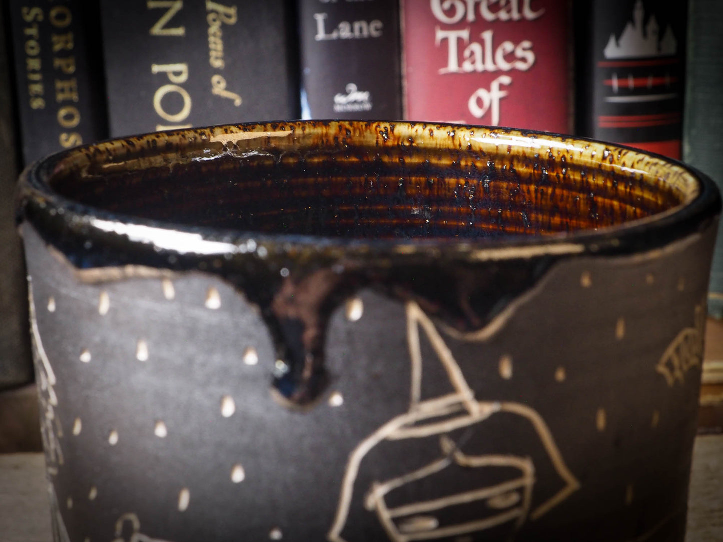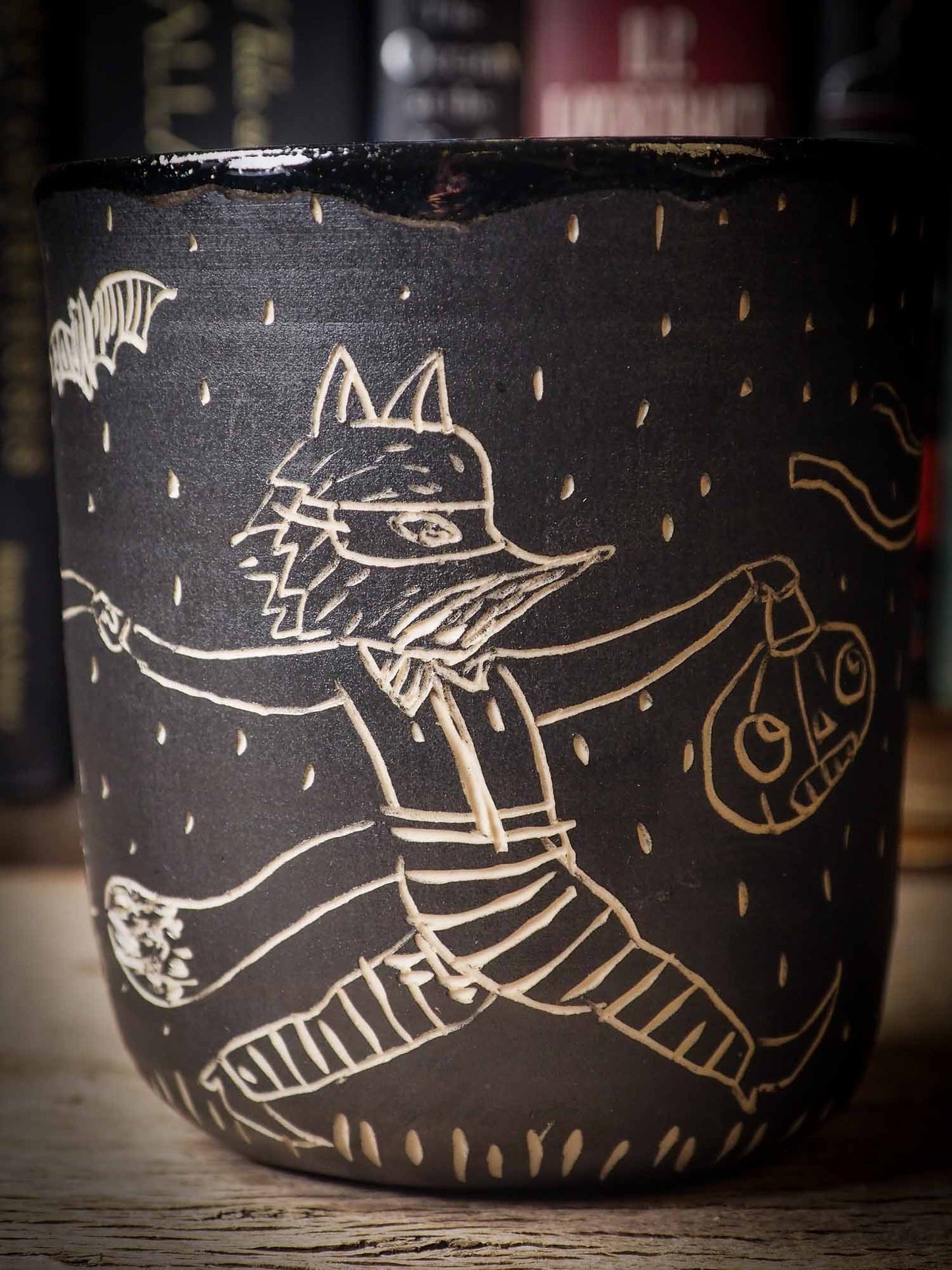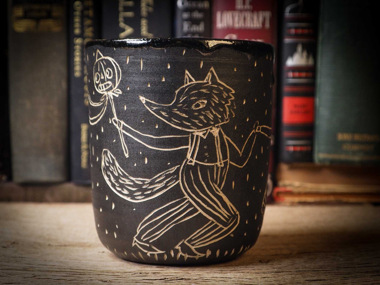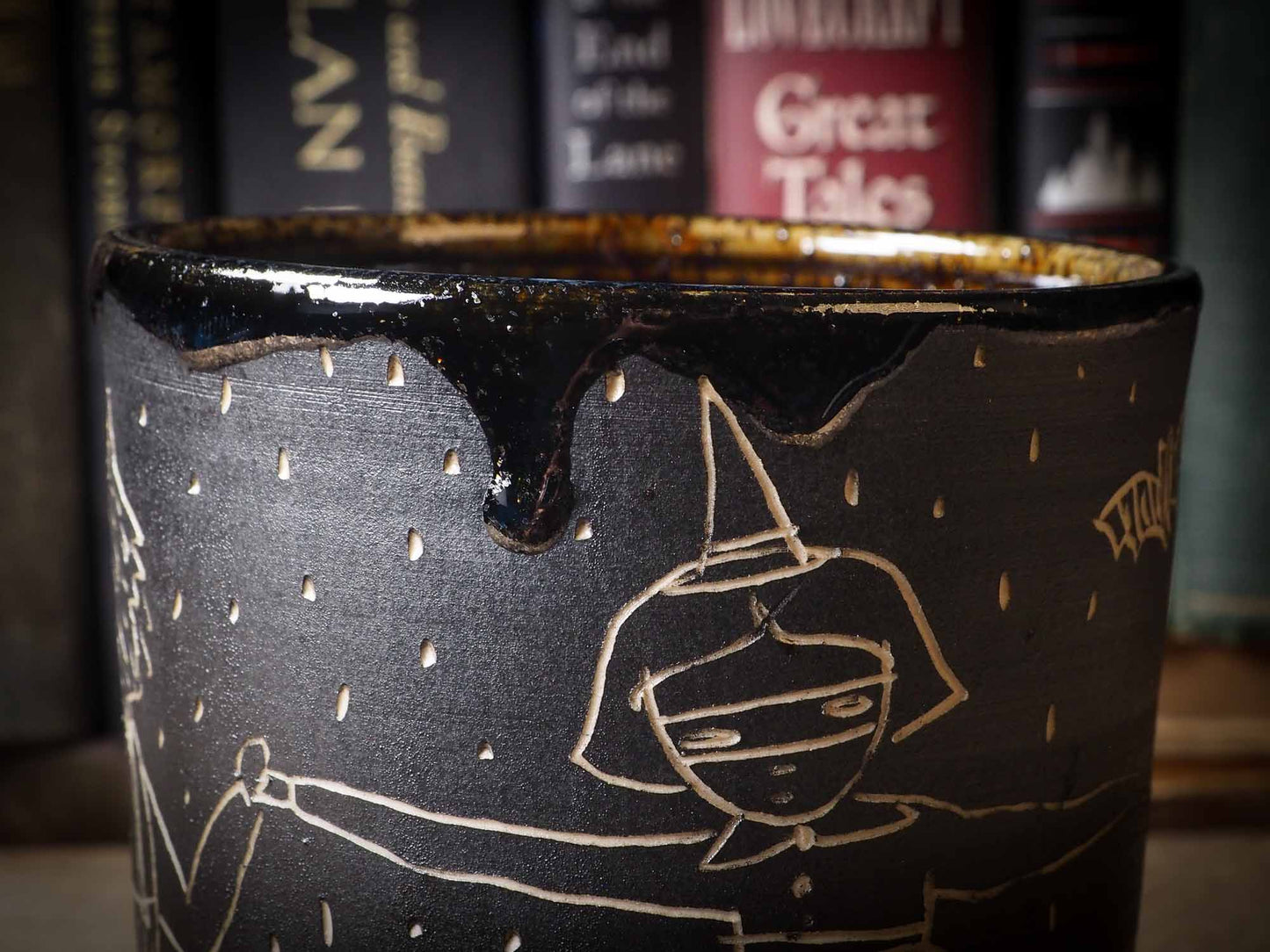 It measures 4 1/2 x 4 1/2 x 5 Inches, made with wheel thrown clay, hand carved and glazed by me with a dark, gooey glaze on the outside as well as the inside. The carved figures give it a nice, folk art primitive feel to it.