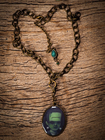 This is an interesting piece! the pendant is hanging from a chain that attaches to the main collar, so it can be a full necklace with a dangling pendant, or a choker with the pendant close to you. I love this design!