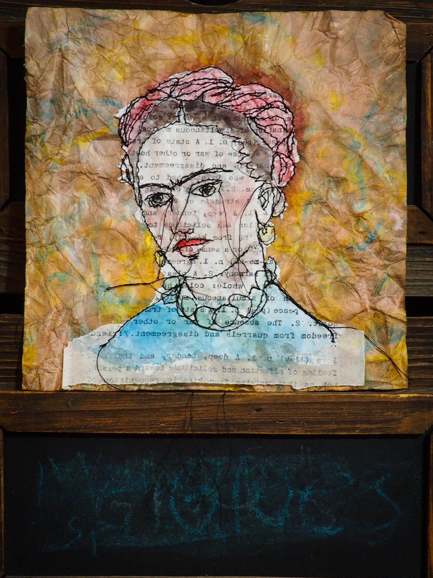 Just like Frida here. She was created on a piece of thin fabric paper. I painted her using watercolors and acrylics over pieces vintage papers I found on one of the Mexican thrifty stores I love to visit.