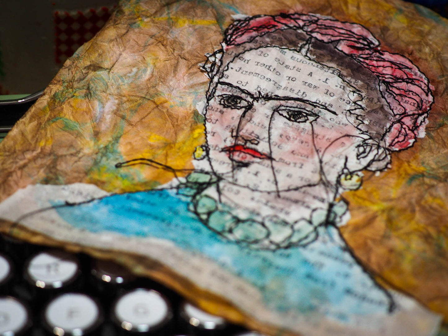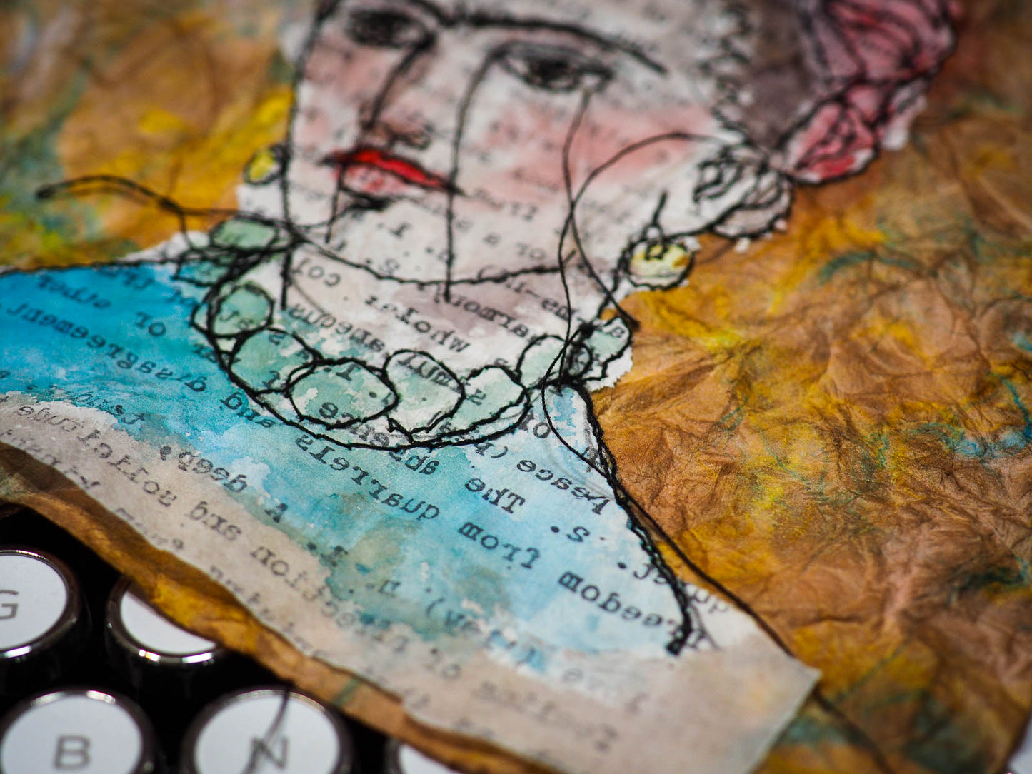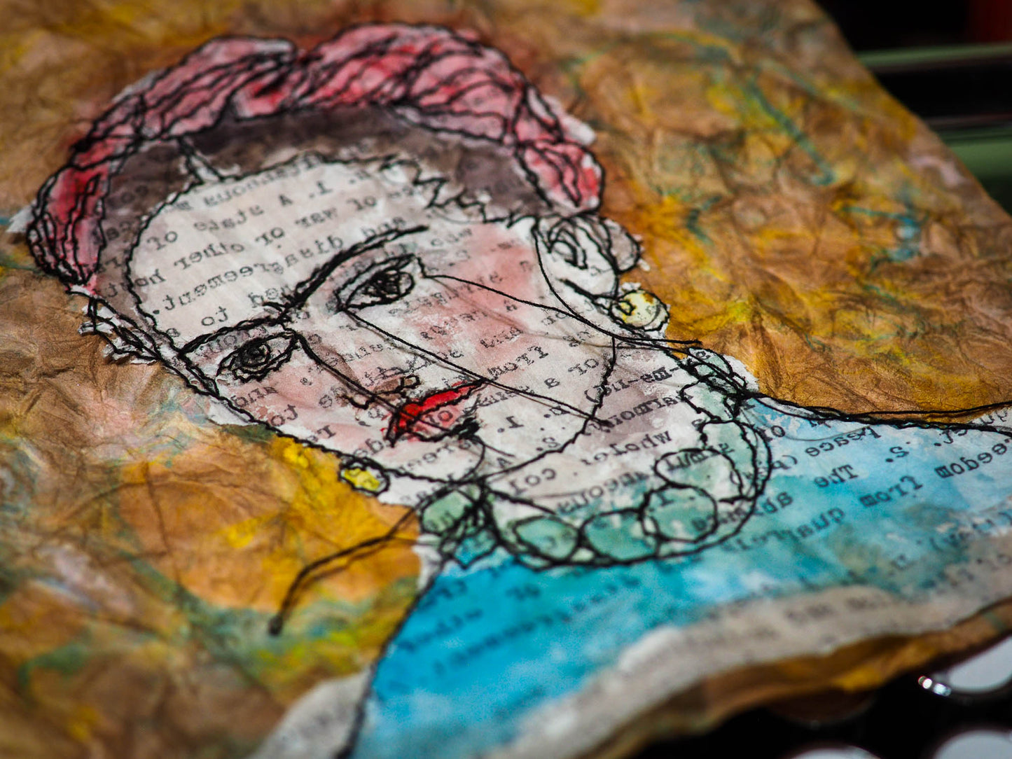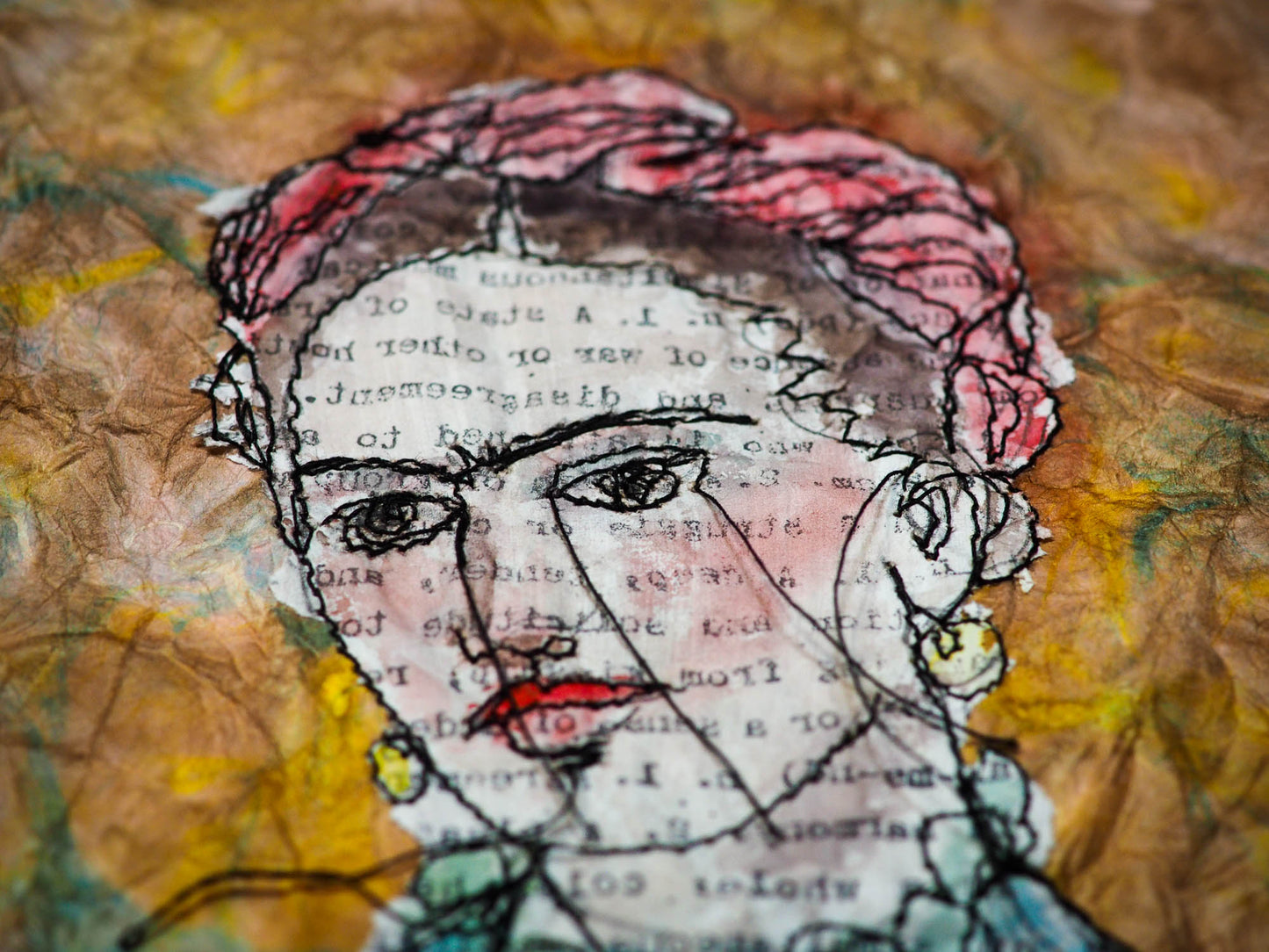 I used the typed letters of one of those papers to bring her face to life, while I used machine free stitching with black thread over her to create her amazing face and hair with a single thread.