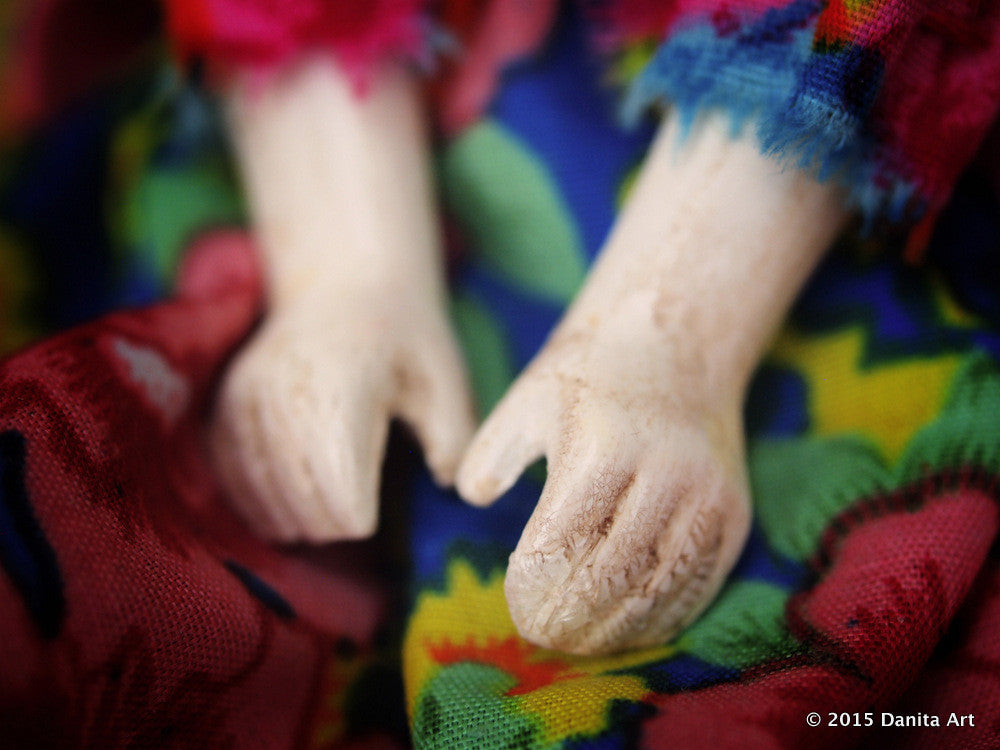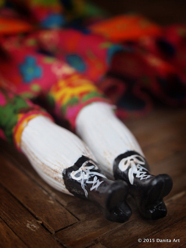 Her arms and legs are handmade ceramic, hand poured and decorated by me with beautiful details like an aged patina and stockings and laces on her boots.Her clothes are made out of a colorful flowery fabric from a pattern from my own design and completely hand made from authentic Mexican fabrics, just like the ones used by our ethnic groups on their colorful traditional outfits.
