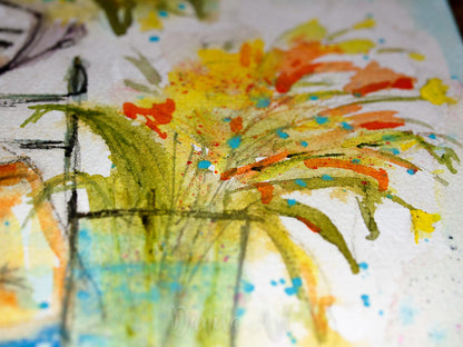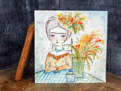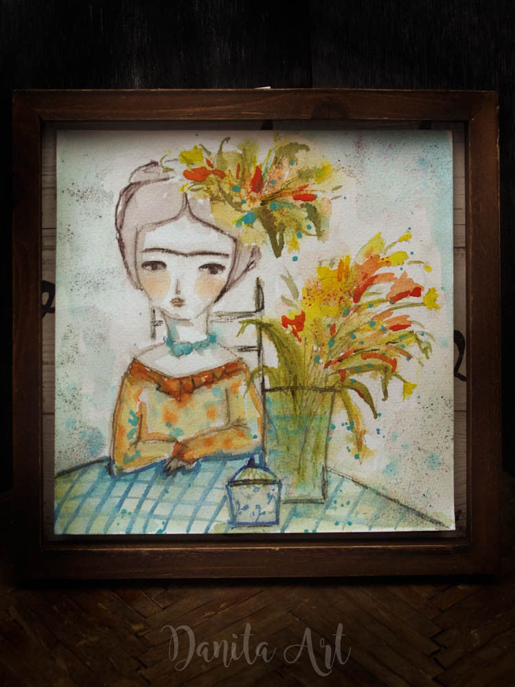 This is one of the kind of paintings I create just for the joy of painting. I did not know where I was going with this, and then suddenly from all the colors, a flower vase and Frida appeared.