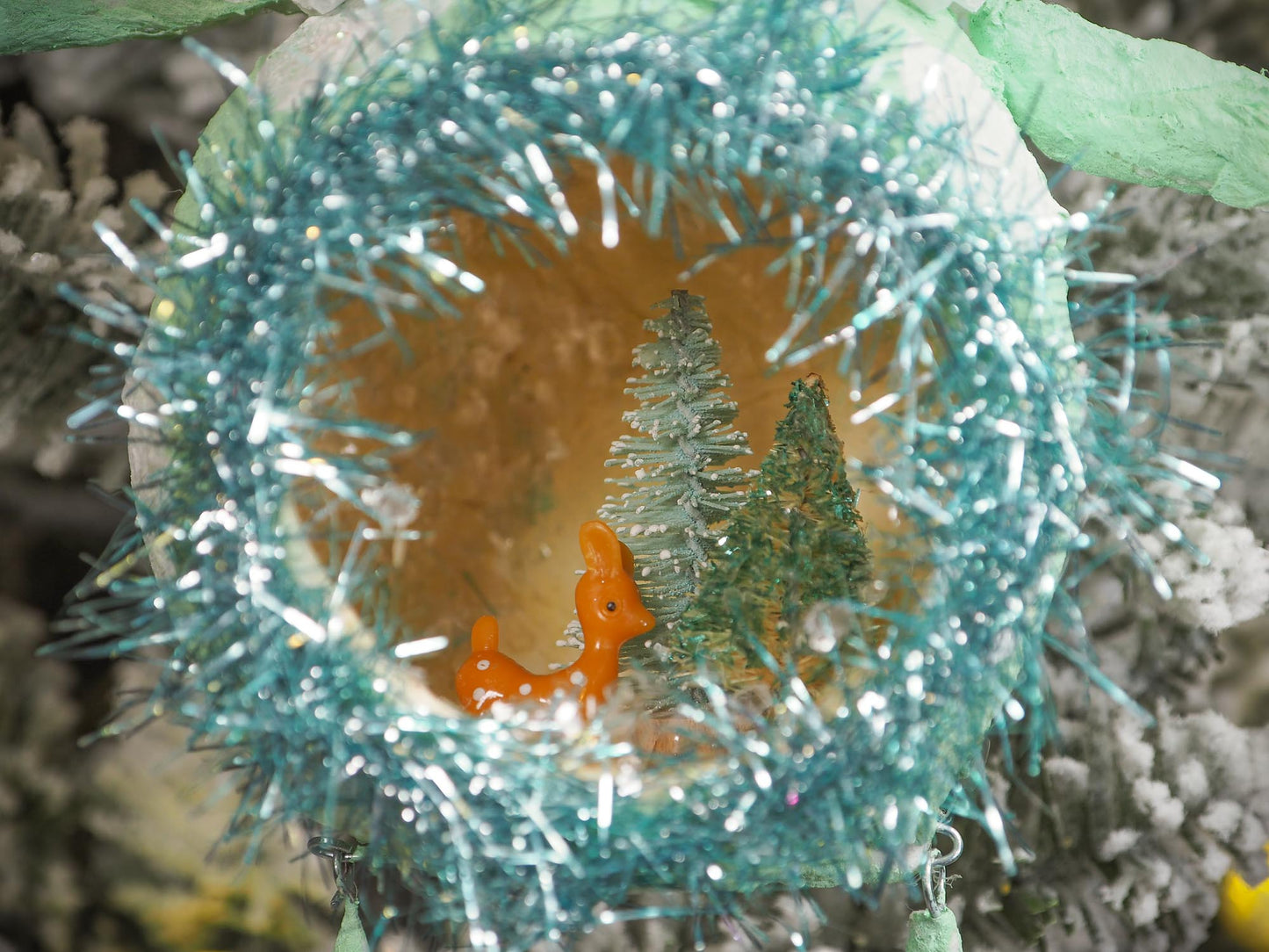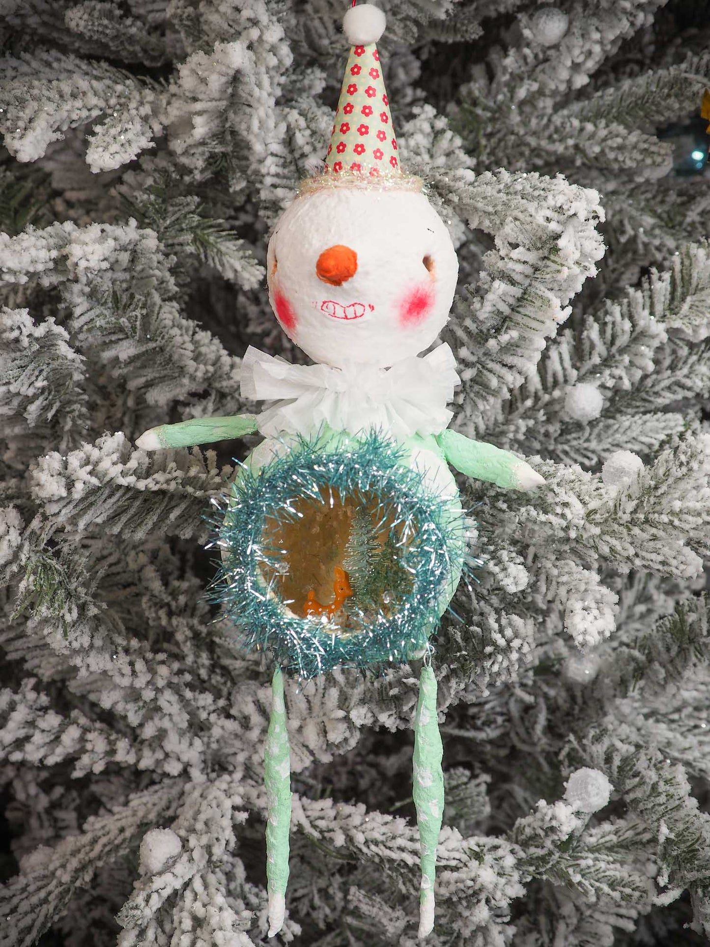 Adorable handmade spun cotton Art Doll Christmas tree ornament by Idania Salcido, the artist by Danita Art. Hand painted by the artist holiday figurine with paper hat with tinsel and vintage style garlands and a tiny Christmas tree. Hang this handmade ornament from your Christmas tree or use as Holiday decoration.