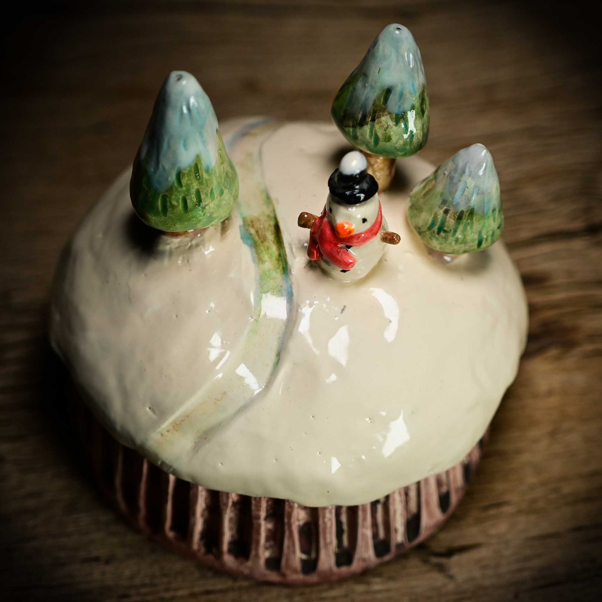 I love looking and making tiny things, and these uber cute ceramic containers were perfect to create tiny winter holiday scenes. I gave them snowmen, pine trees, tiny houses and small forest critters that build fires and roam in the ceramic snow of their tiny world.