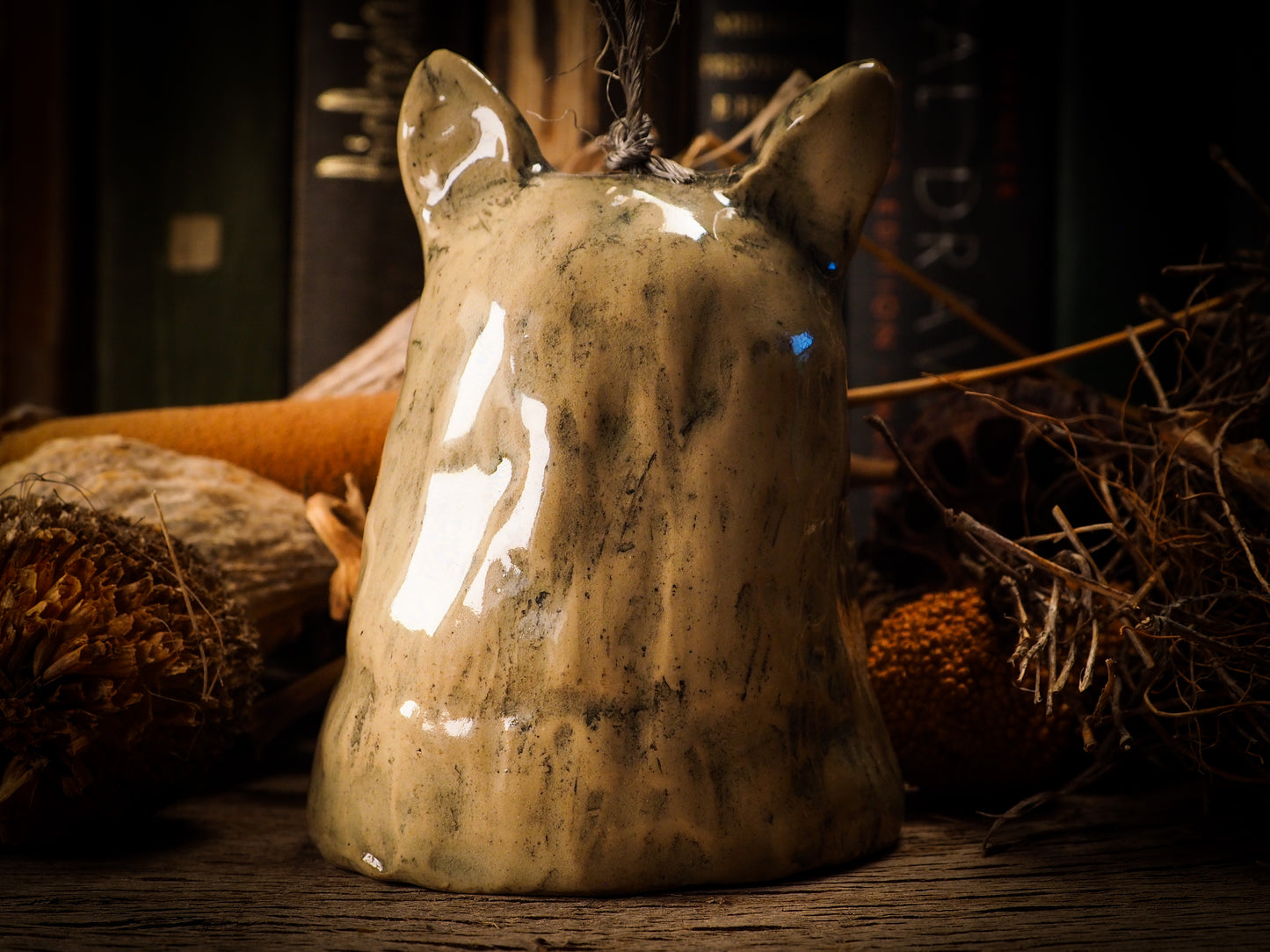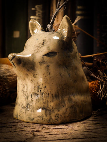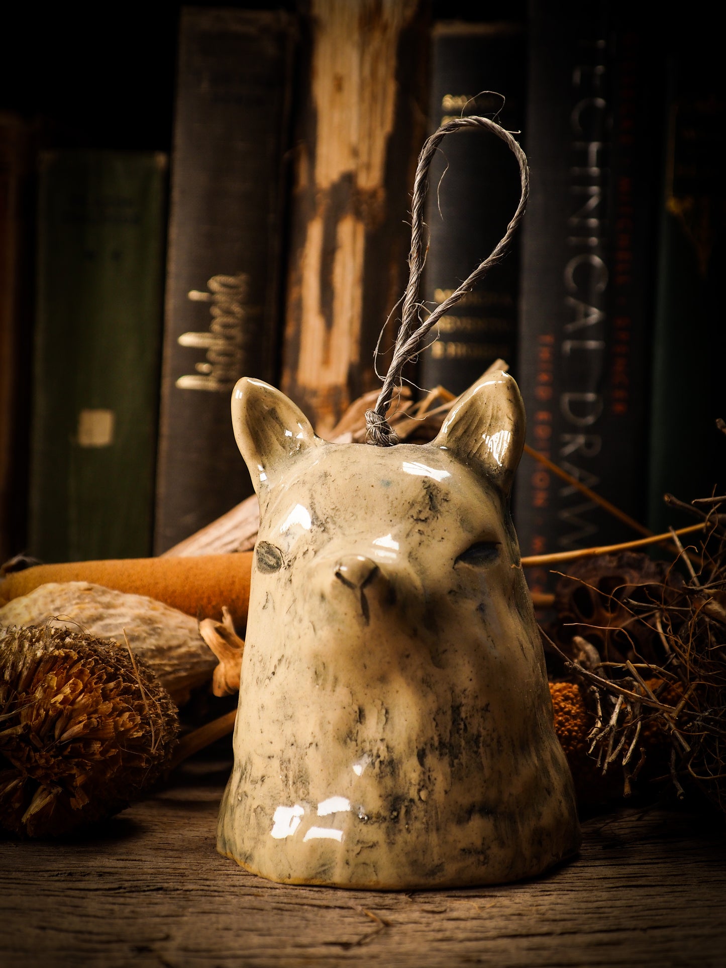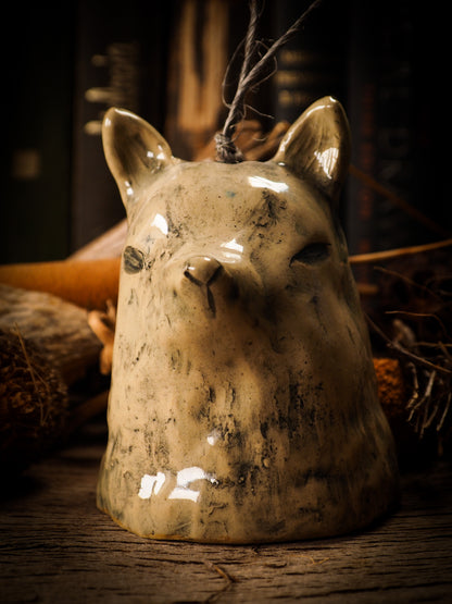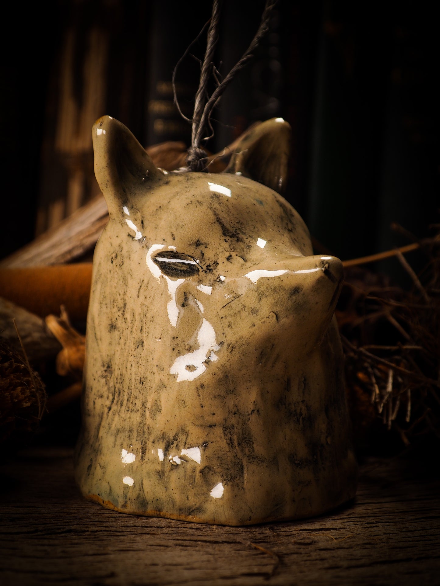 I am delighted with the results of my experiments. Using high fire ceramic clay, I hand sculpted wolf and bunny rabbit heads and then added a wooden ball to make it ring. They are glazed in beautiful earth tones and will stand weather and wind when you hang them from your favorite garden spot to enjoy their soothing musical sounds for years to come, all made with lots of love from me, Danita Art, to you.