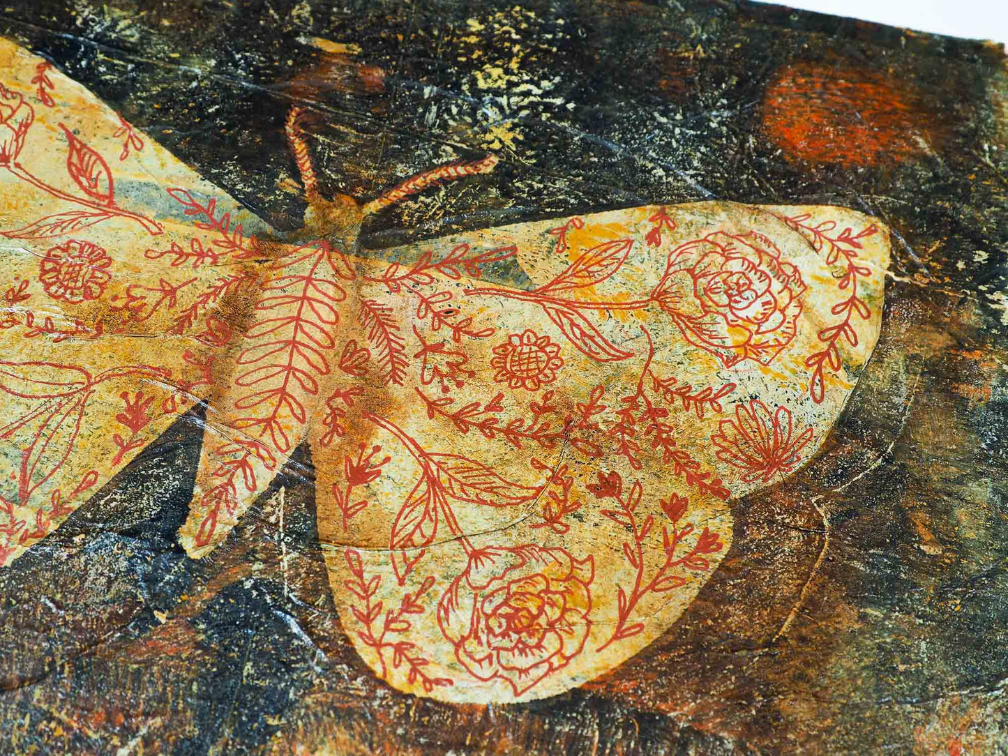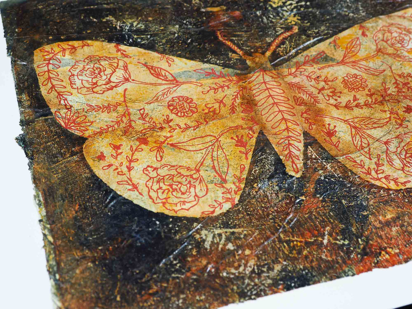 This beautiful monoprint measures 8x10 inches on a 9x12 paper, and it is ready to frame.