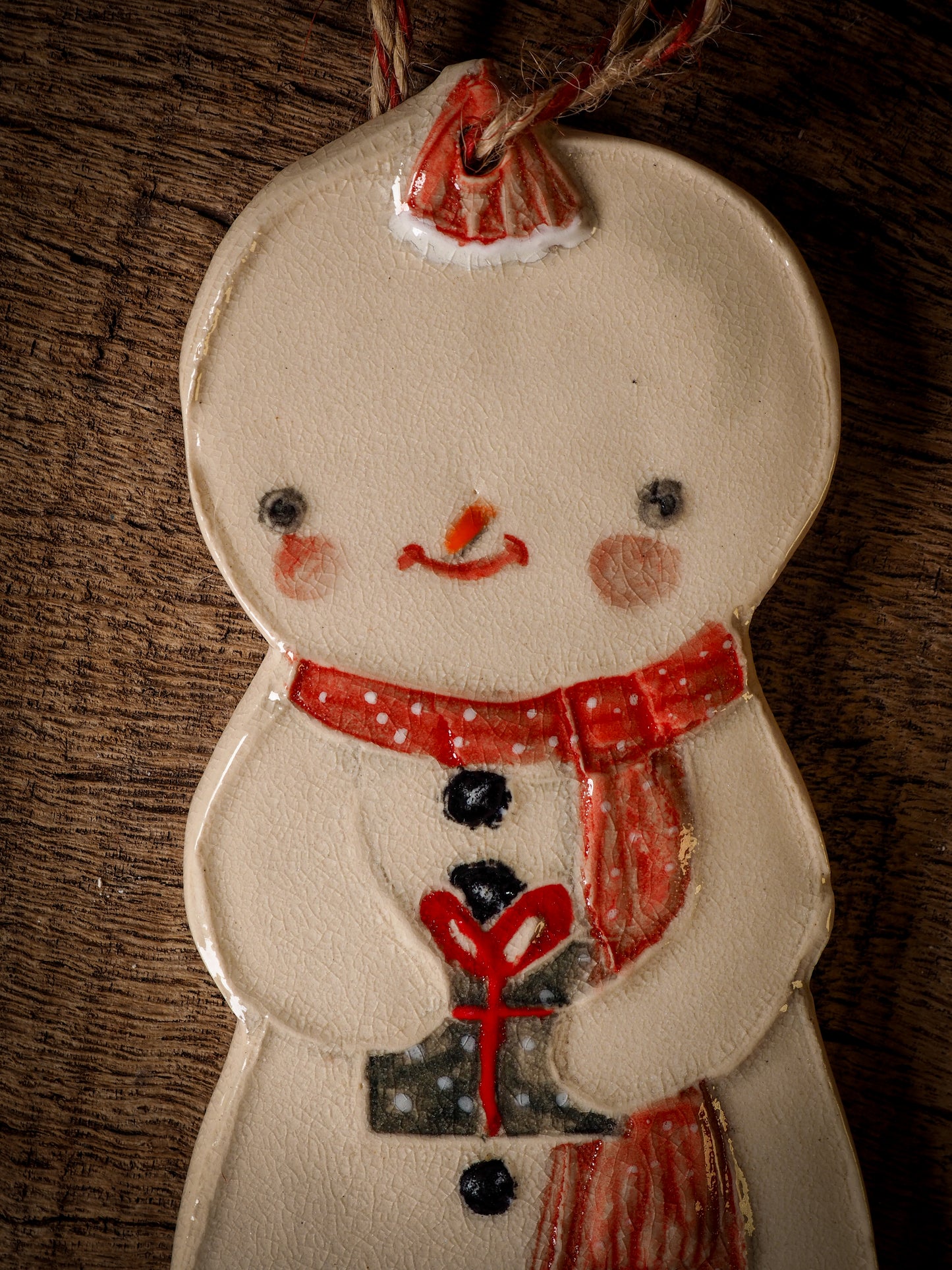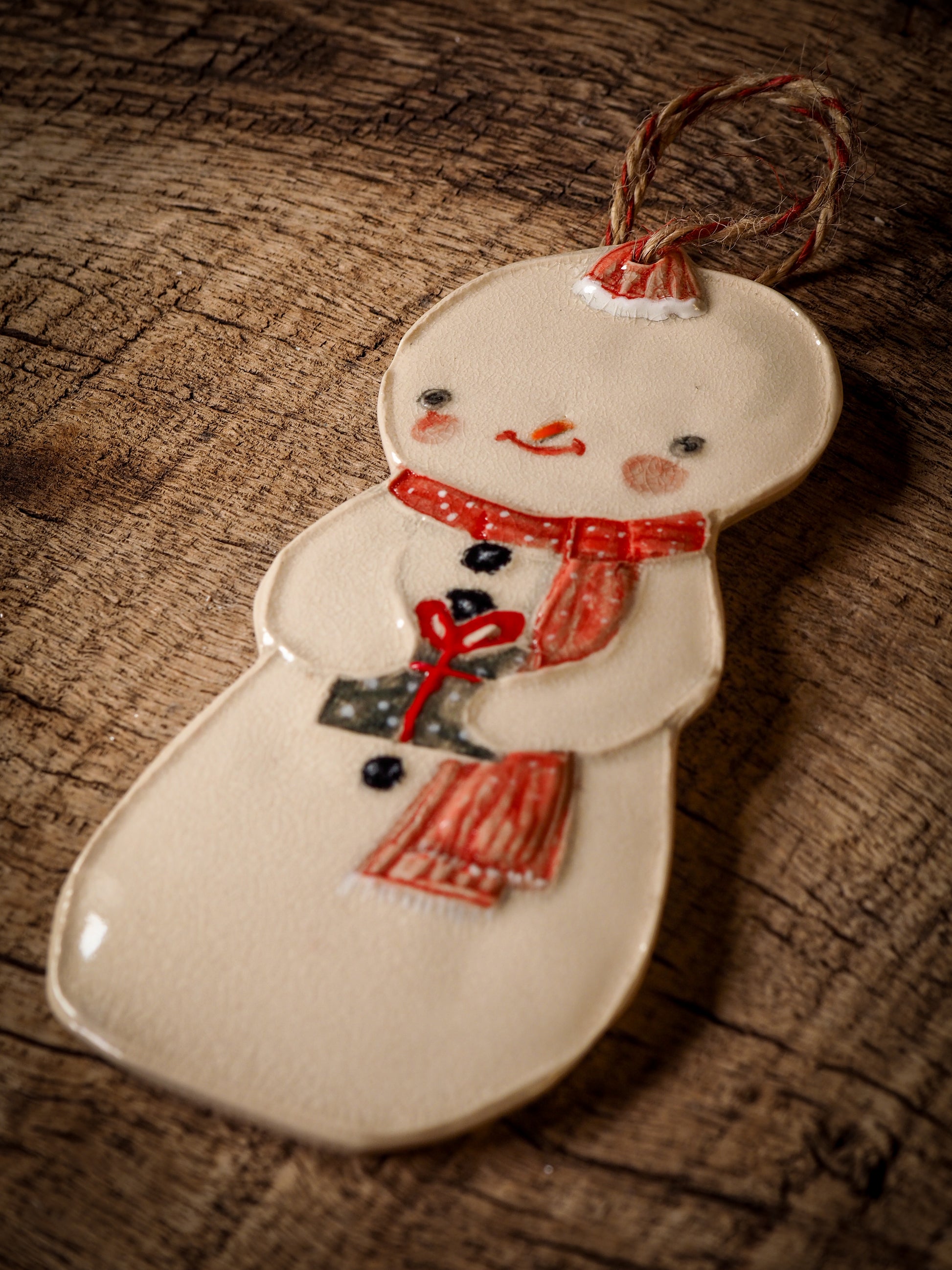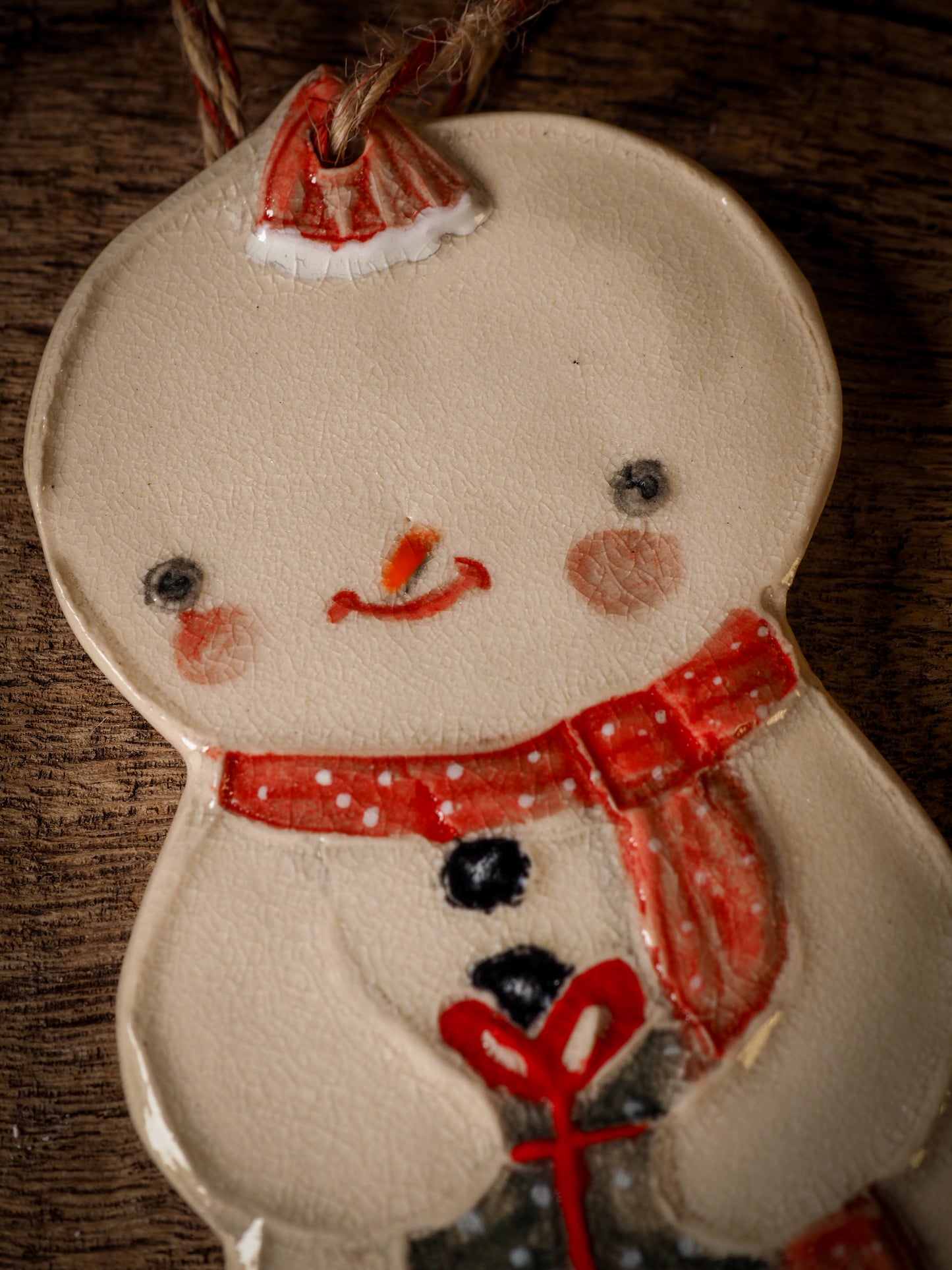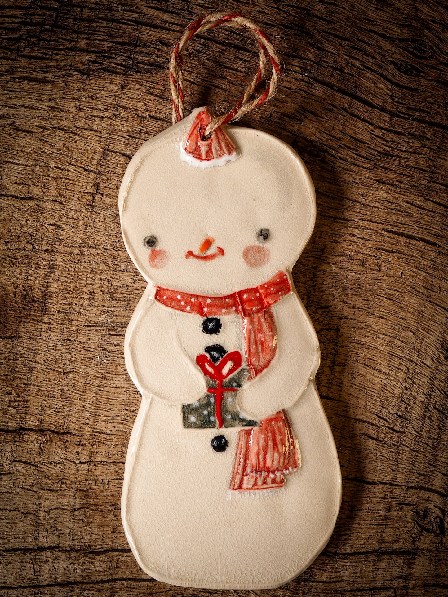 Totally hand made on my studio, each of my ornaments is hand painted, fired twice on a kiln at more than 2000 Degrees, then finished with a beautiful twine hanger.