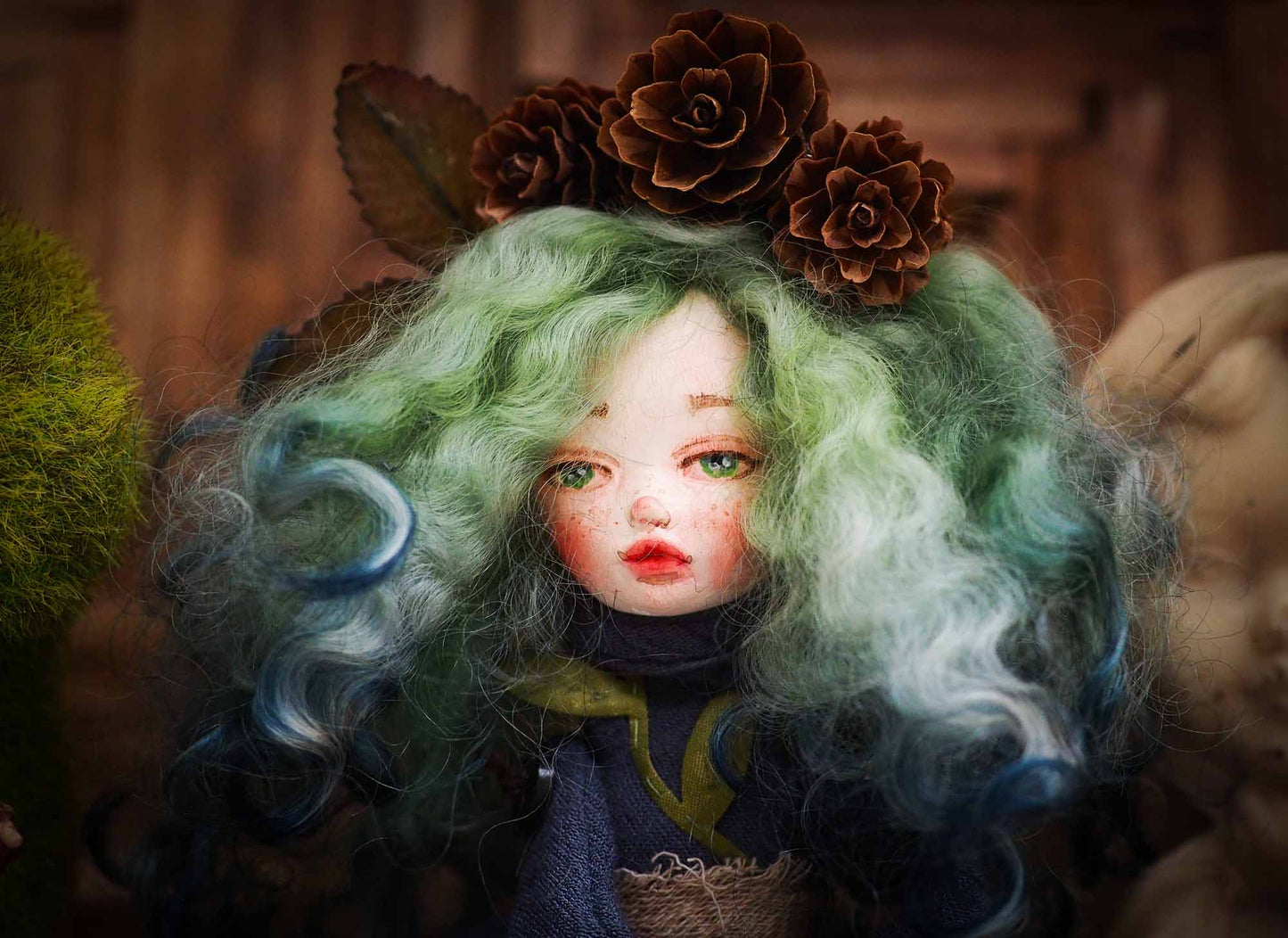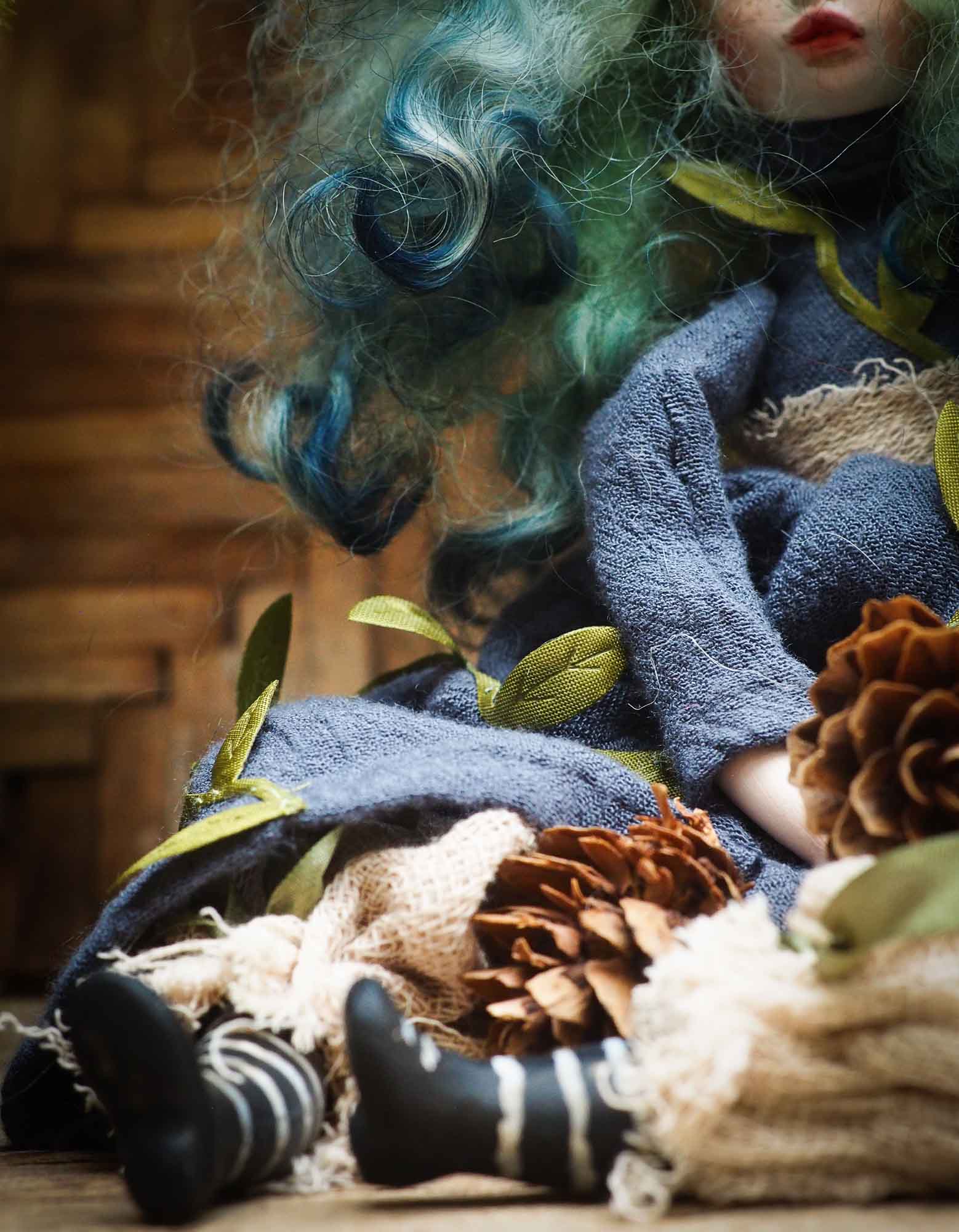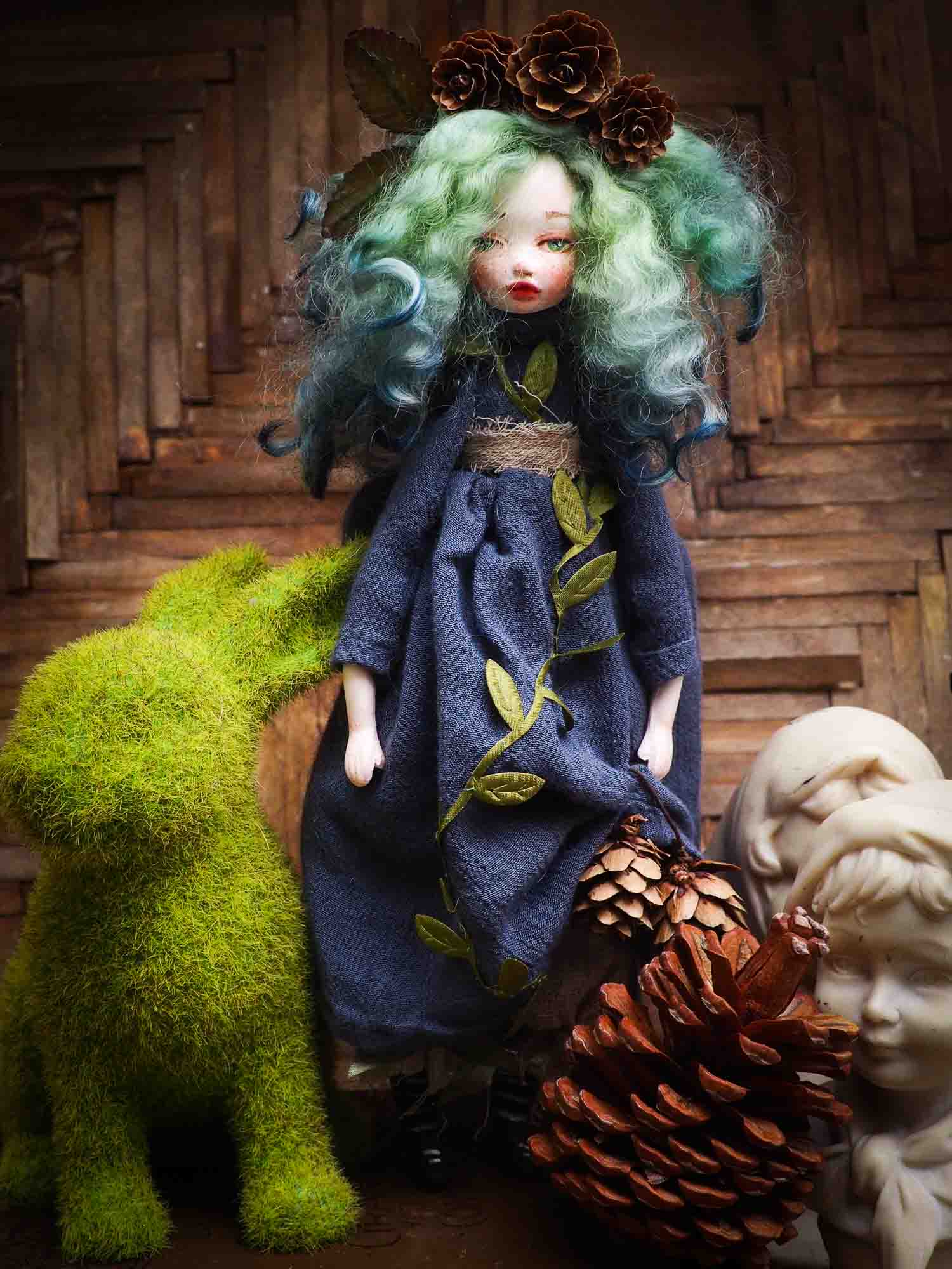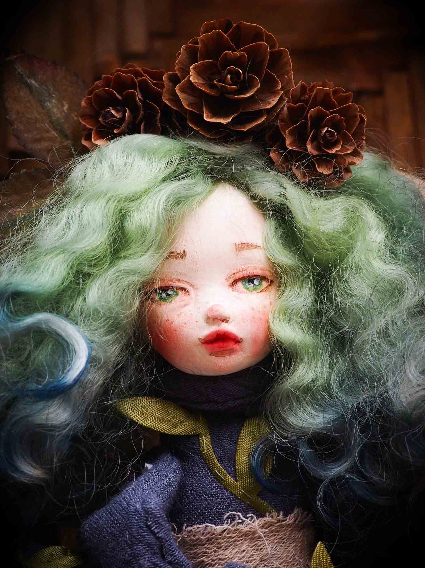 On her green hair, made from natural wool that is hand dyed, she has a crown of pine cones.