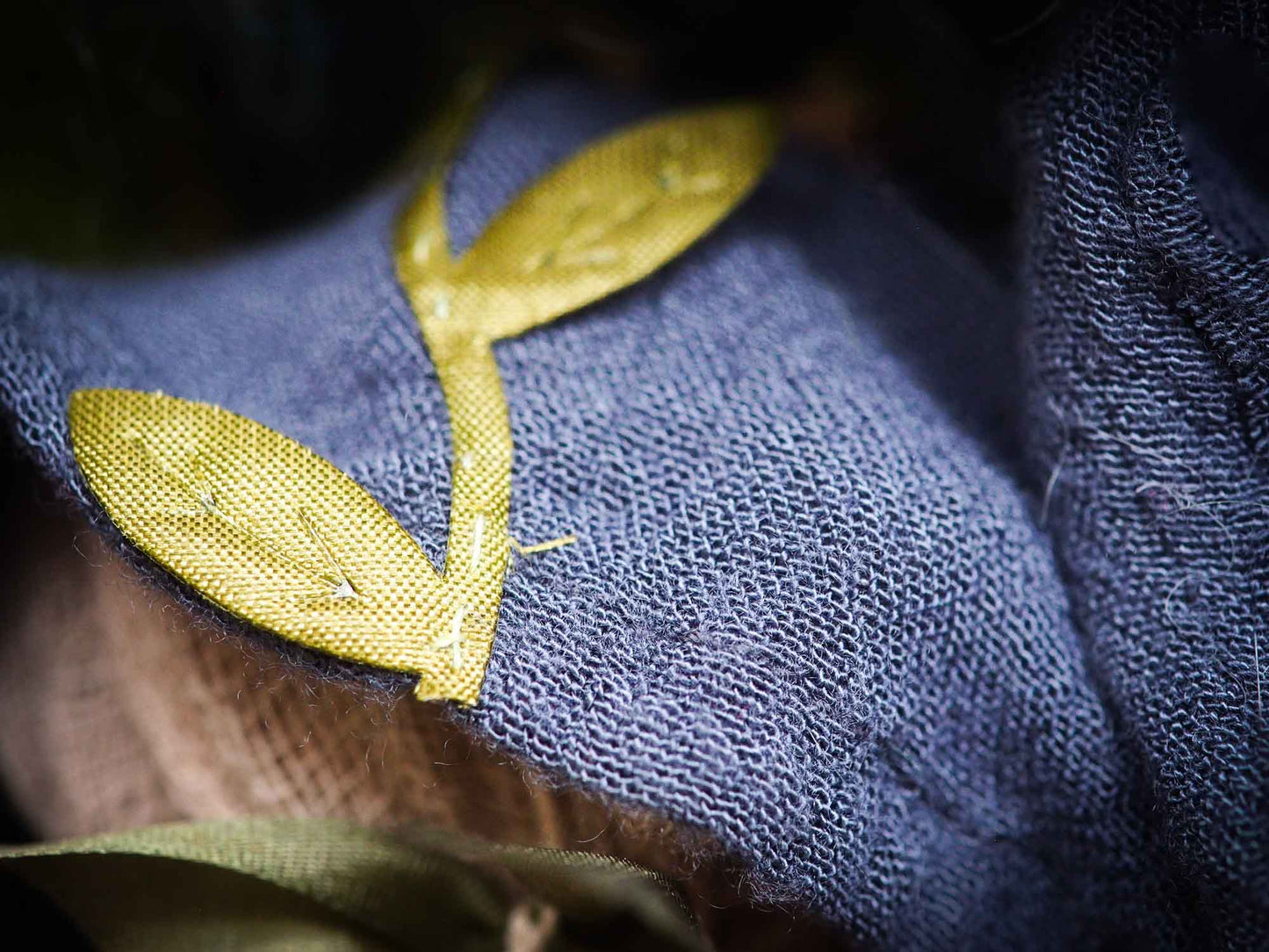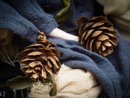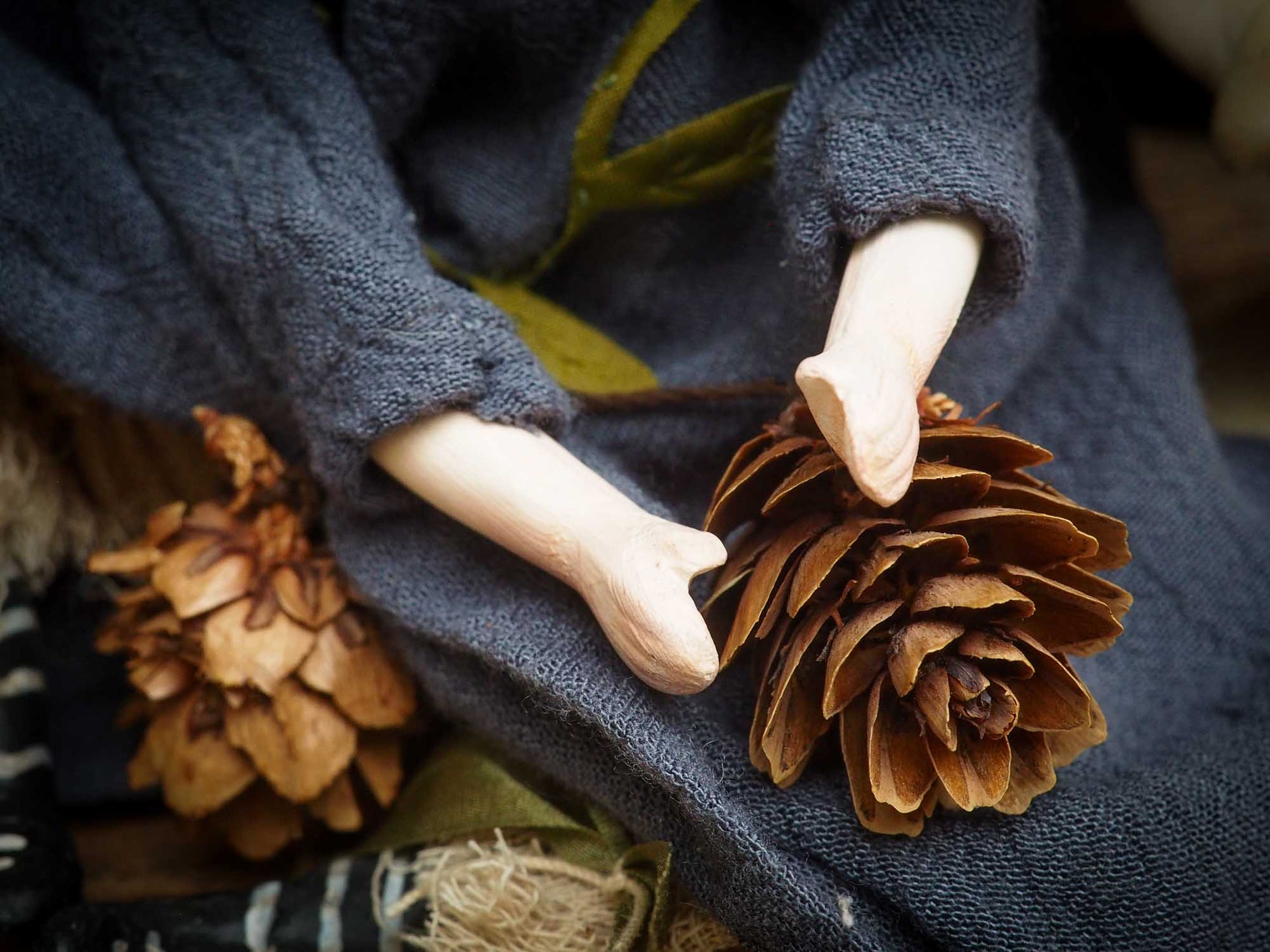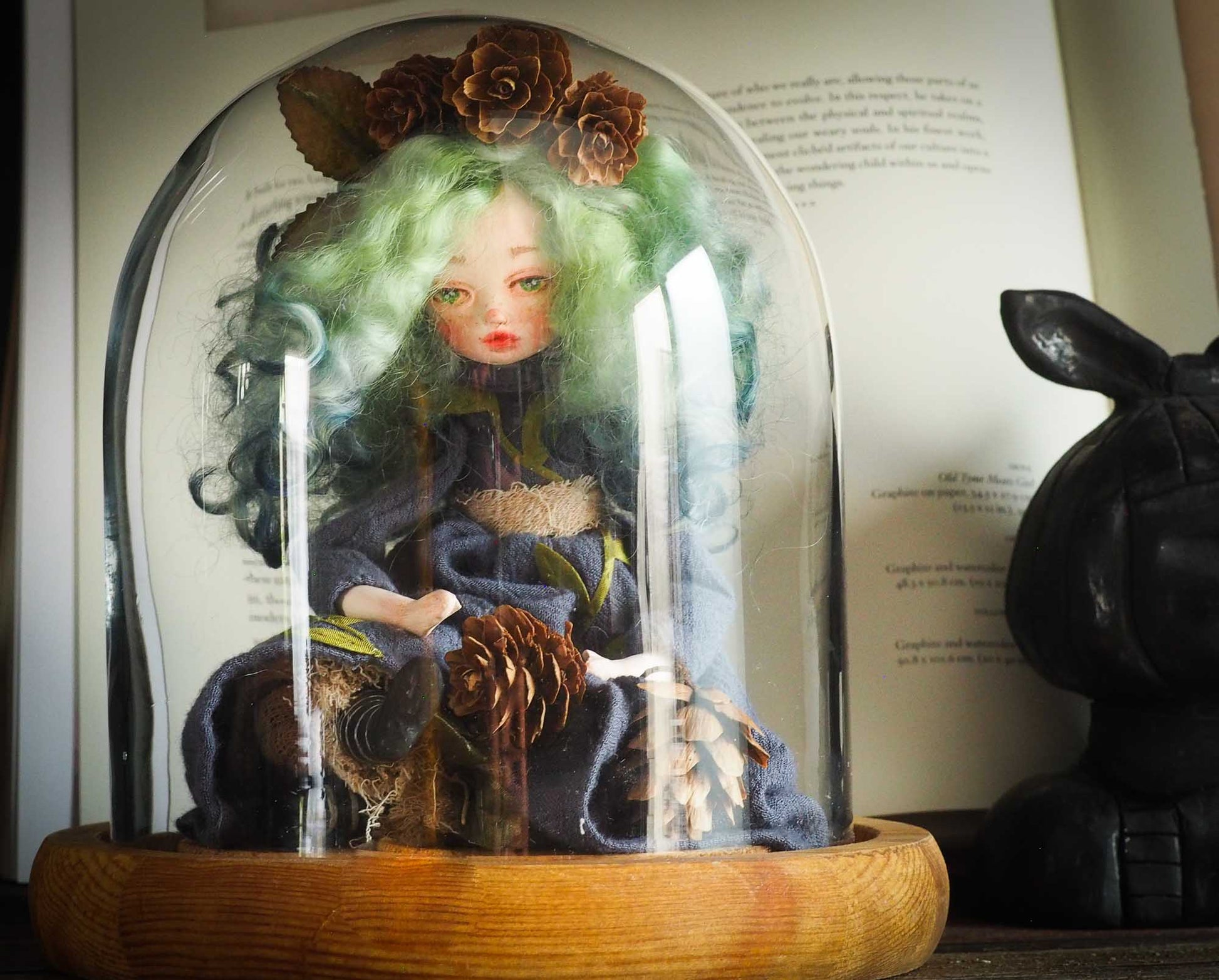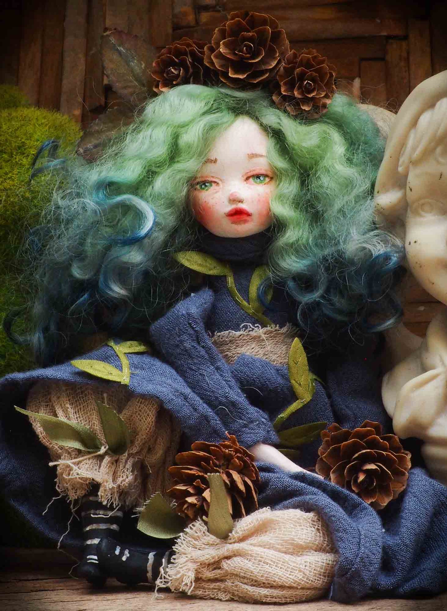 On her green hair, made from natural wool that is hand dyed, she has a crown of pine cones.