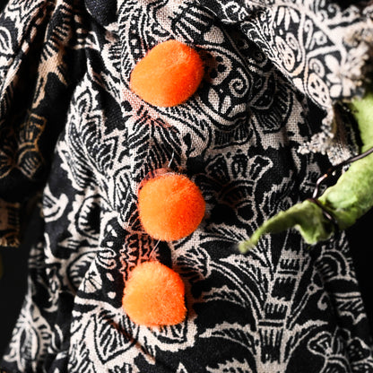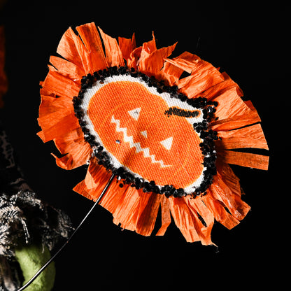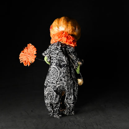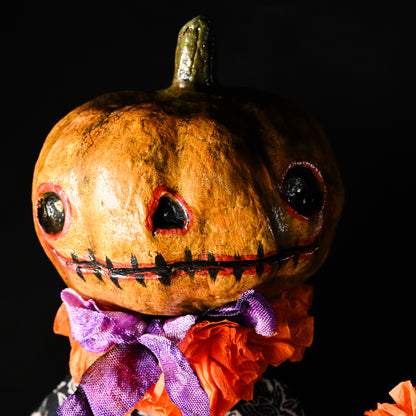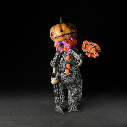 The Halloween art doll has a jack-o-lantern on its hand and it can be displayed sitting on a shelf, or hanging as an ornament from your Halloween or Christmas tree.