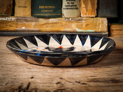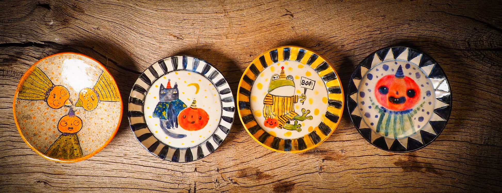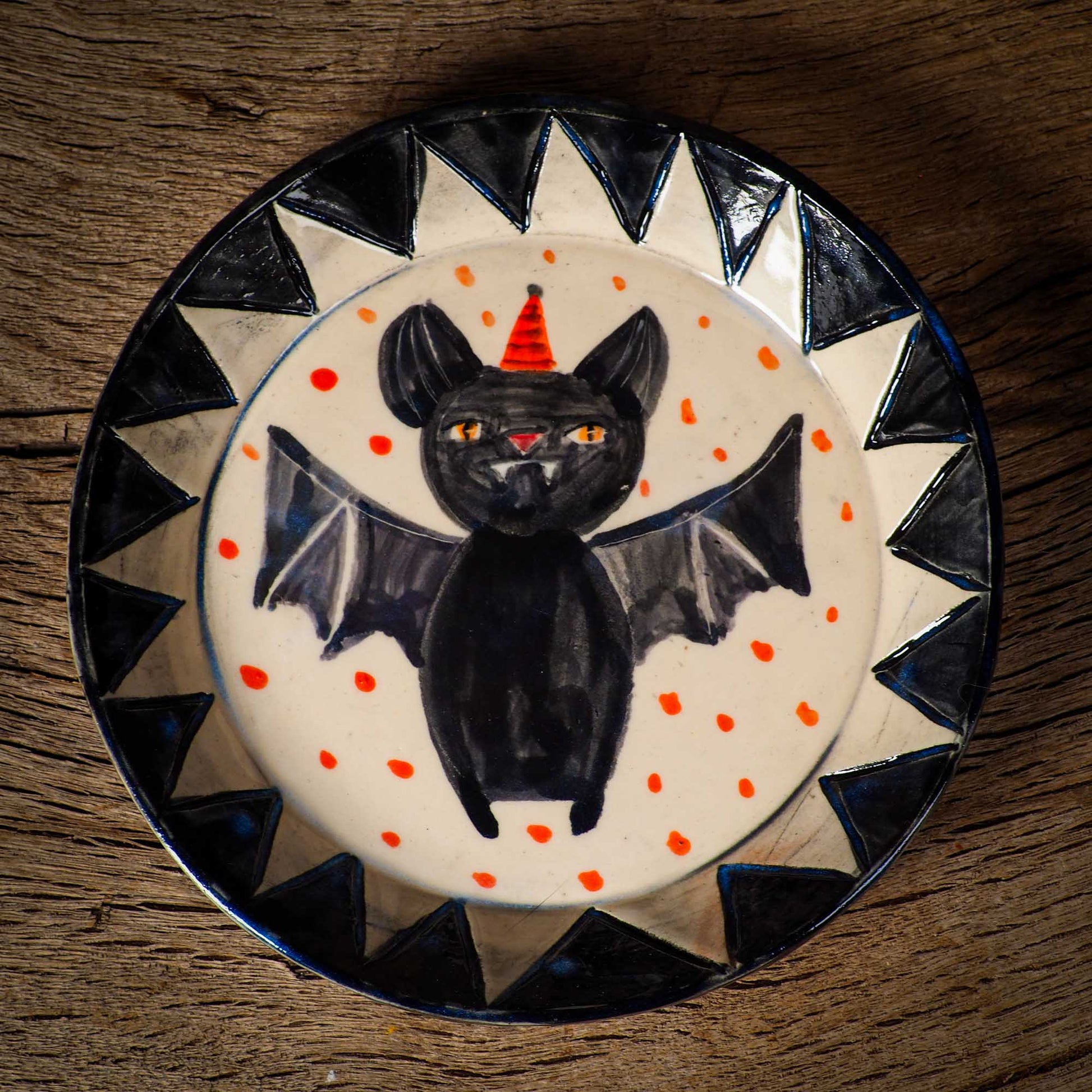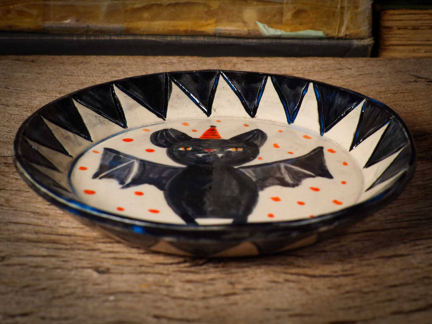 This is an original Halloween ceramic plate, handmade by Idania Salcido, the artist behind Danita Art. It measures approx. 6.5 diameter, with fire glazed ceramics with an original Halloween themed original painting by Idania Salcido (Danita Art). Food safe stoneware, hand wash only.