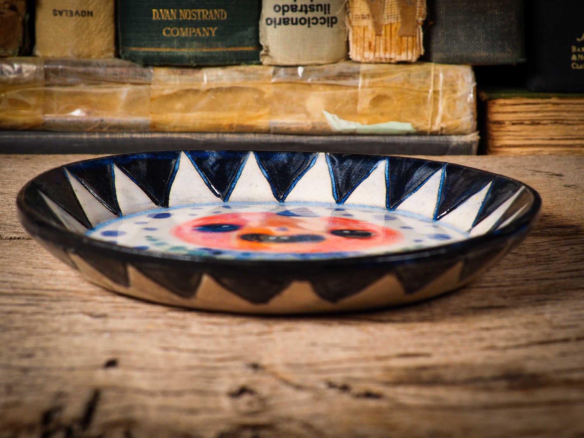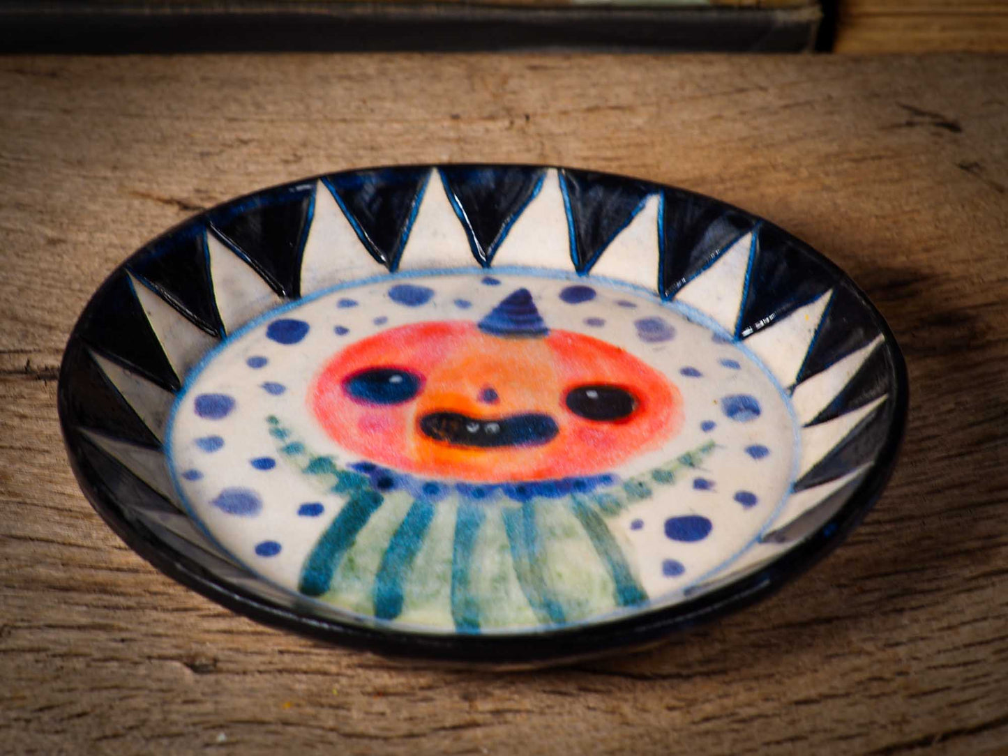 This is an original Halloween ceramic plate, handmade by Idania Salcido, the artist behind Danita Art. It measures approx. 6 diameter, with fire glazed ceramics with an original Halloween themed original painting by Idania Salcido (Danita Art). Food safe stoneware, hand wash only.