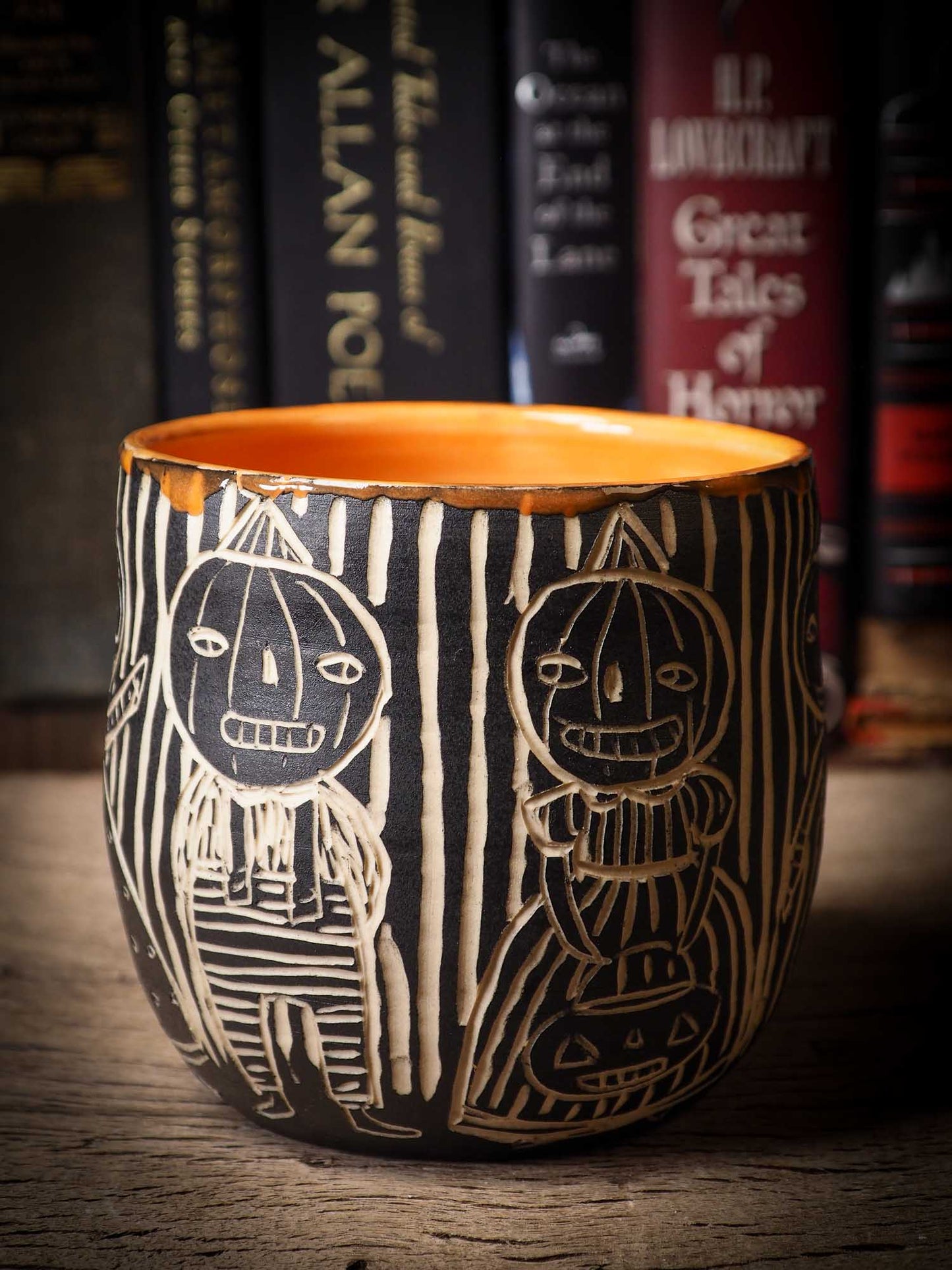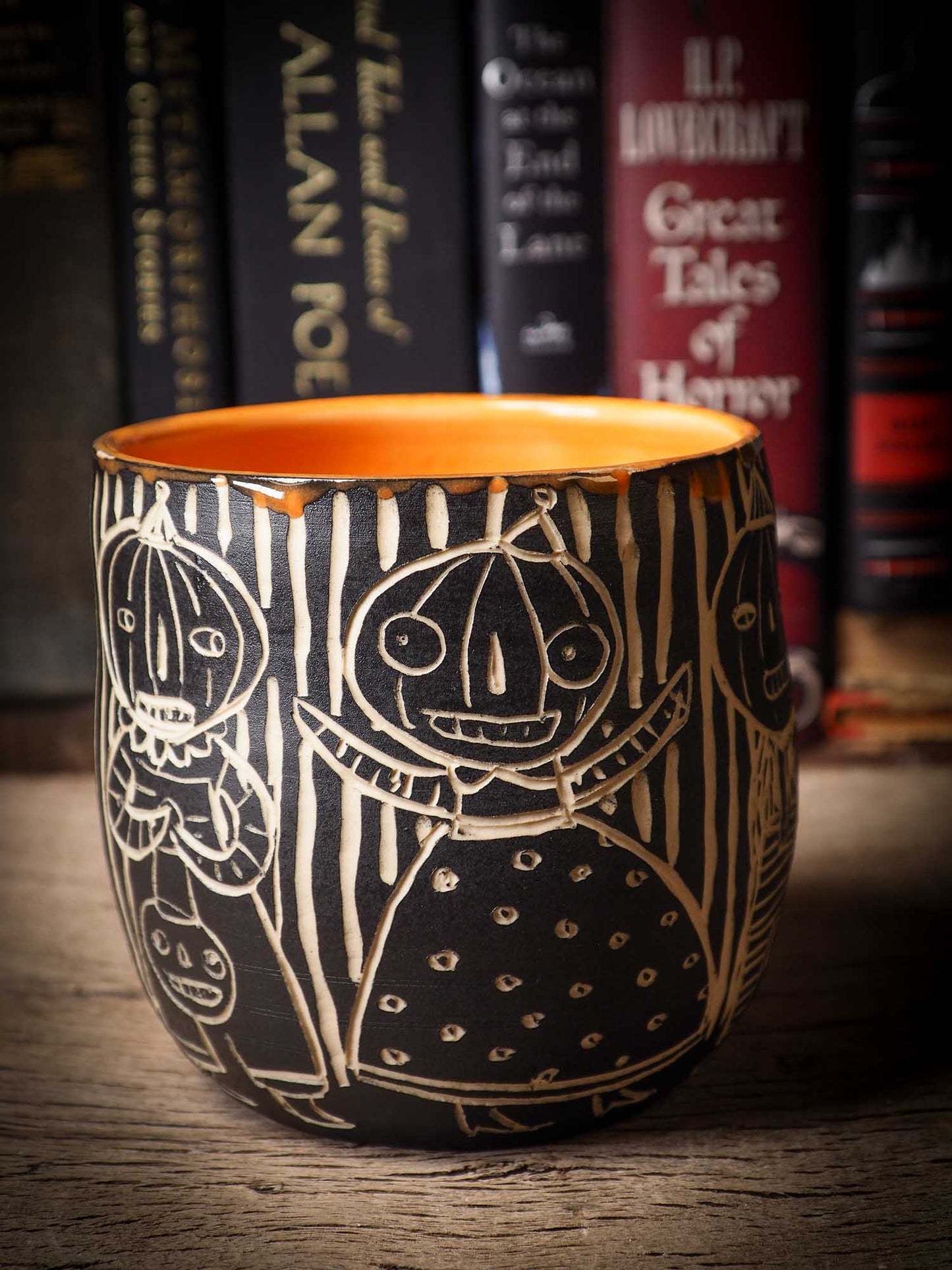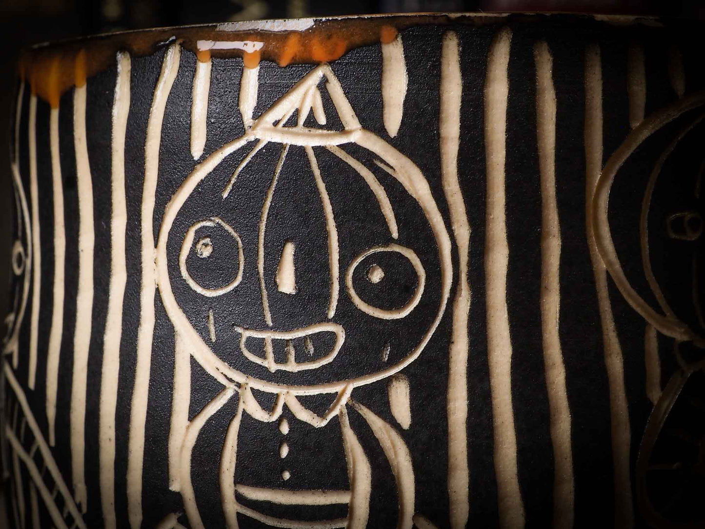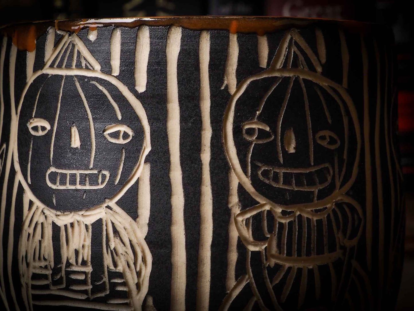 It measures 4 x 4 x 4 Inches, made with wheel thrown clay, hand carved and glazed by me with a dark, gooey glaze on the outside as well as the inside. The carved figures give it a nice, folk art primitive feel to it.