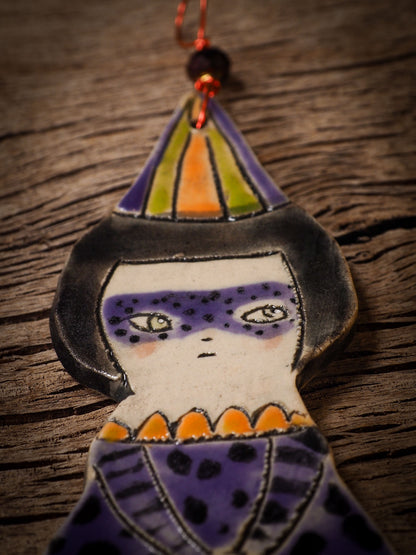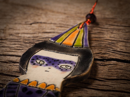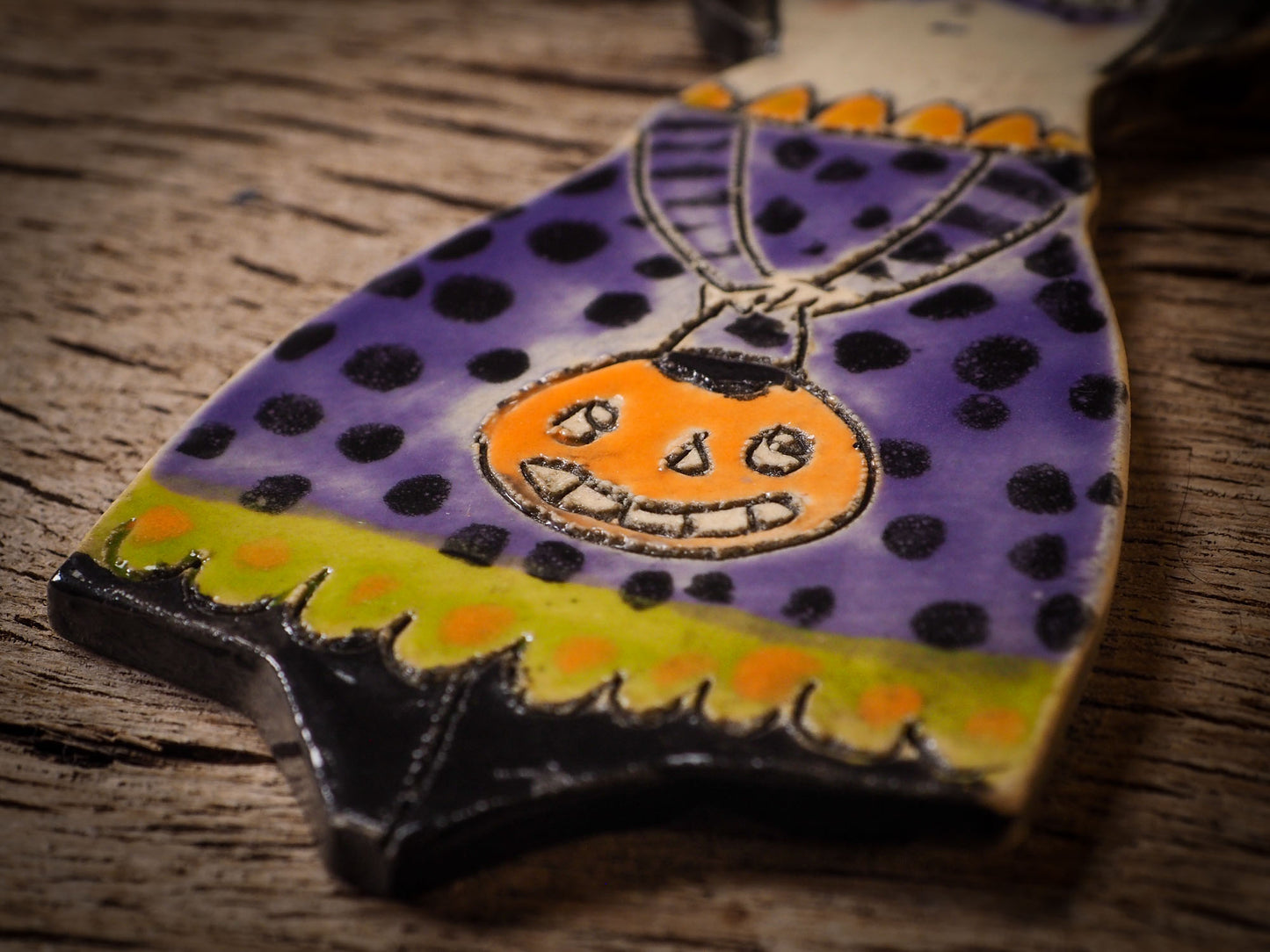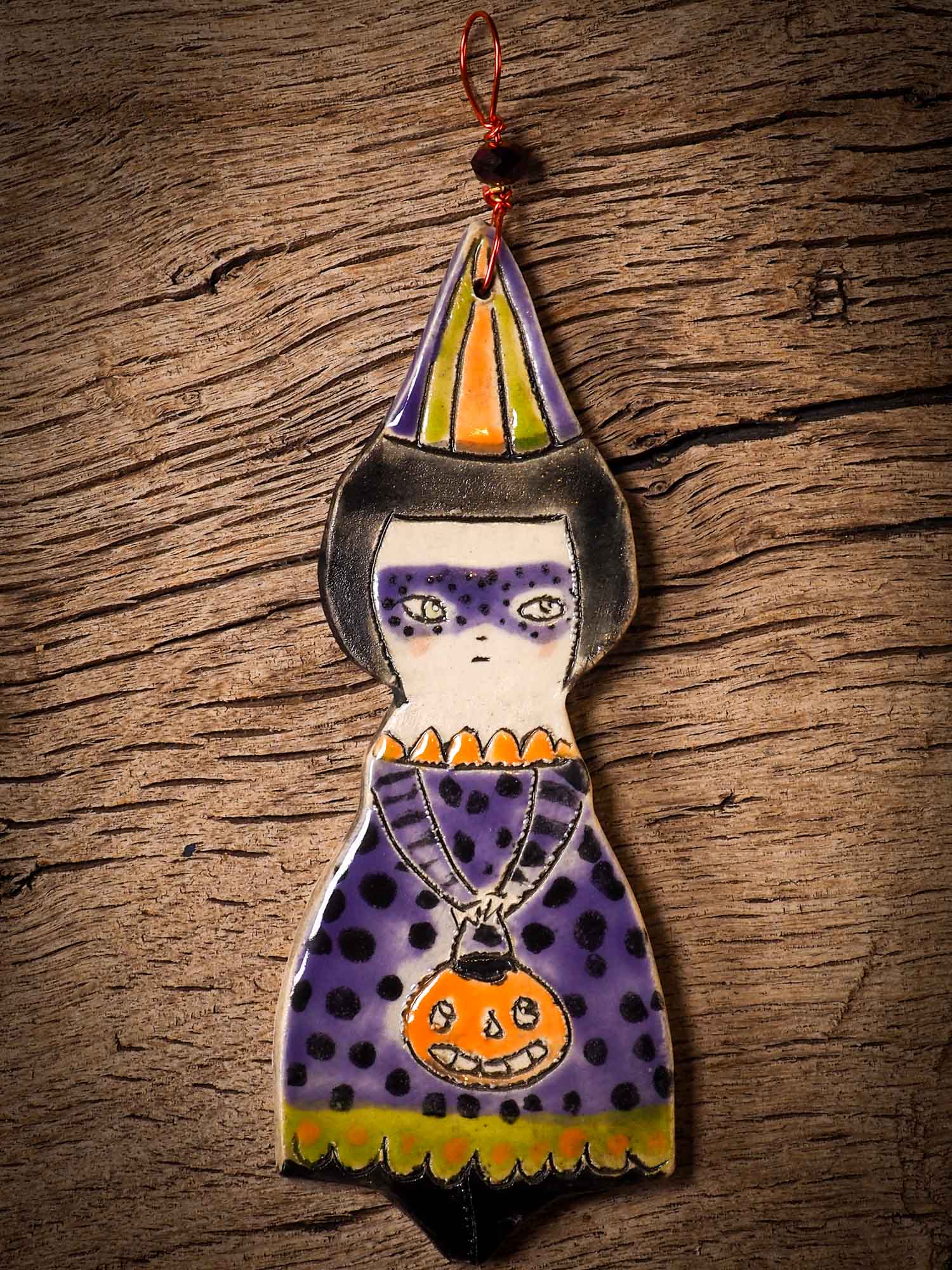 An original handmade Halloween ornament by Idania Salcido, Danita Art. Each ornament is hand carved with pumpkins, witches, cats, jack-o-lanterns and moons.