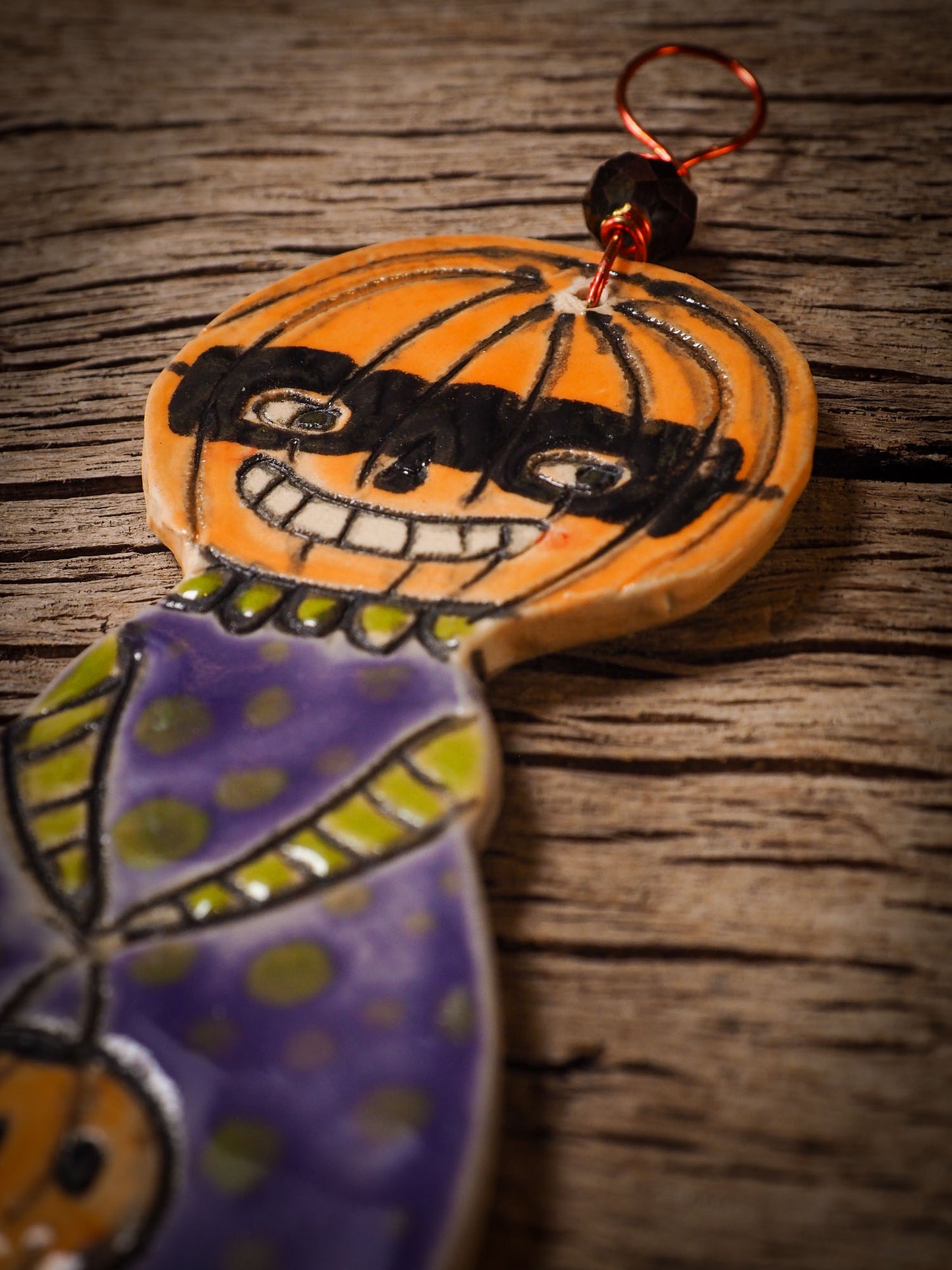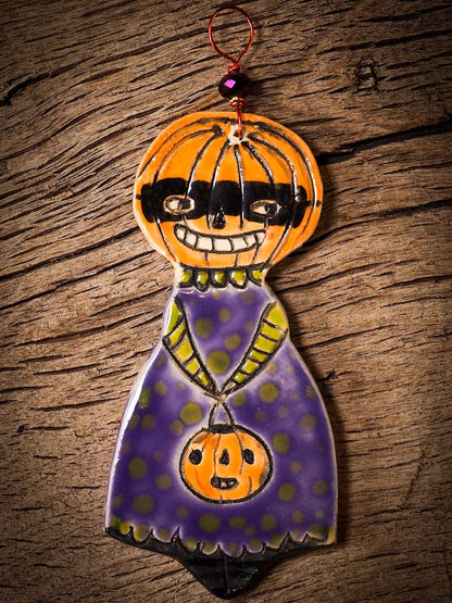 An original handmade Halloween ornament by Idania Salcido, Danita Art. Each ornament is hand carved with pumpkins, witches, cats, jack-o-lanterns and moons.