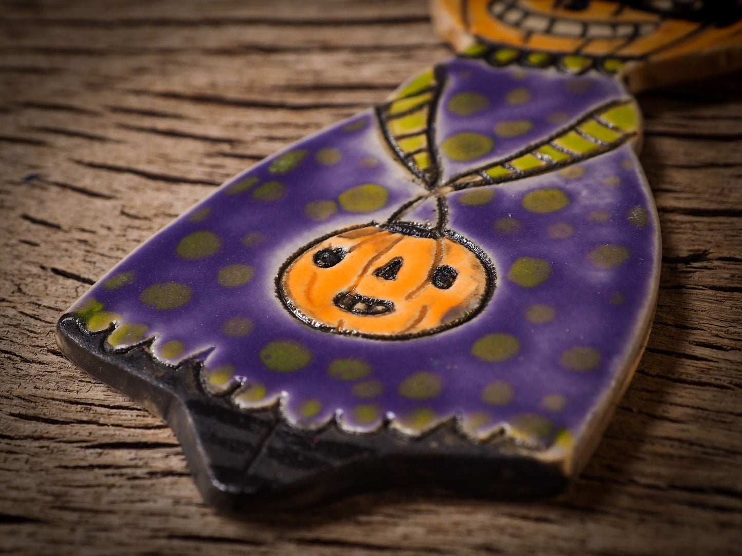 Made with fired glazed ceramics, this little witch, jack-o-lantern and cat is carved with delicate patterns that make each ornament a one of a kind work of art.