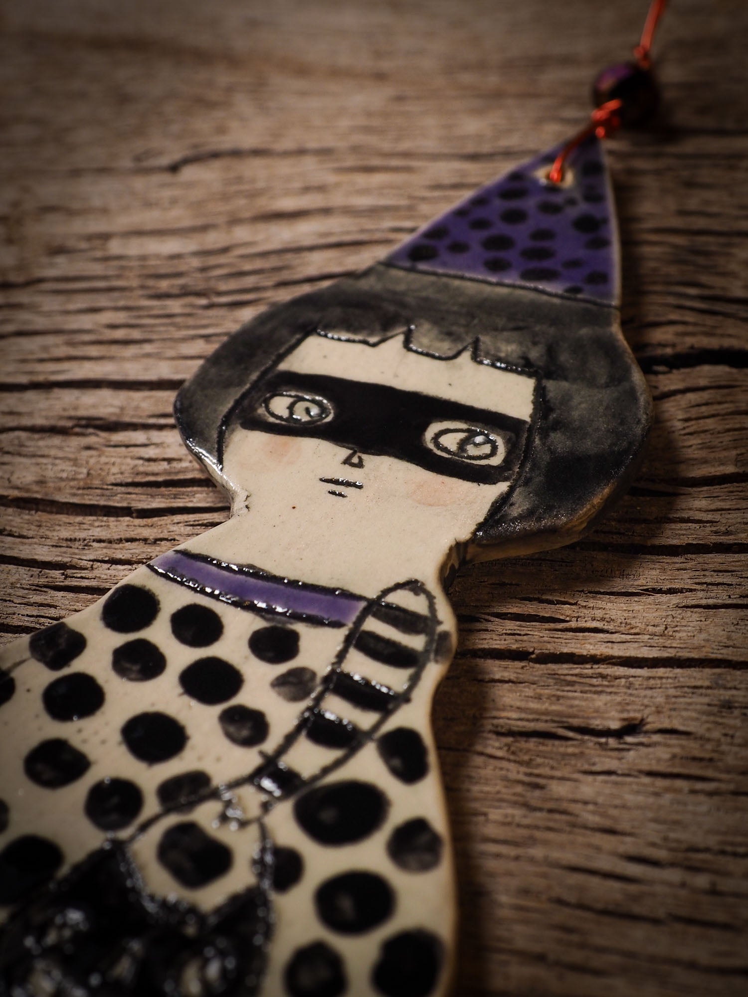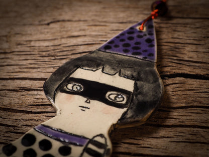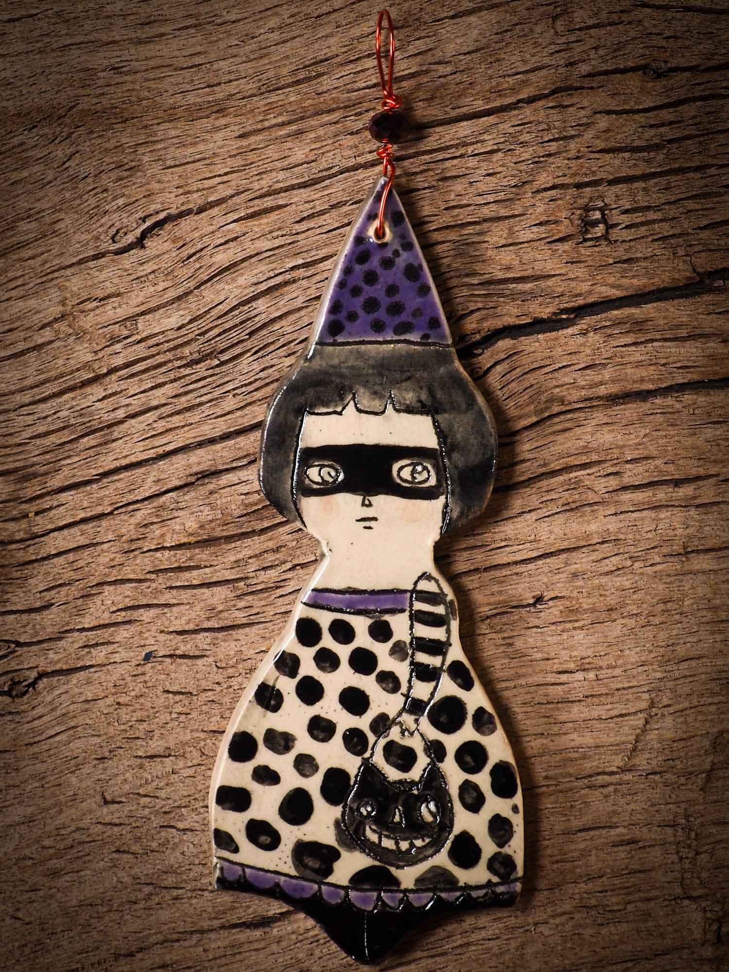 An original handmade Halloween ornament by Idania Salcido, Danita Art. Each ornament is hand carved with pumpkins, witches, cats, jack-o-lanterns and moons.