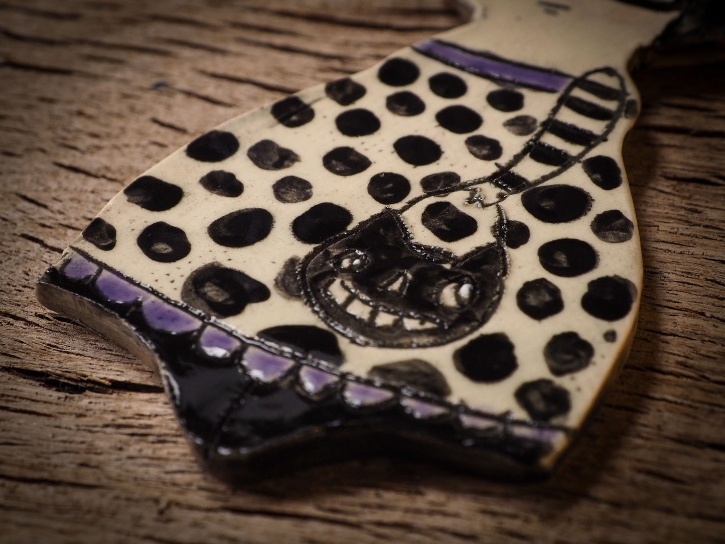 Made with fired glazed ceramics, this little witch, jack-o-lantern and cat is carved with delicate patterns that make each ornament a one of a kind work of art.