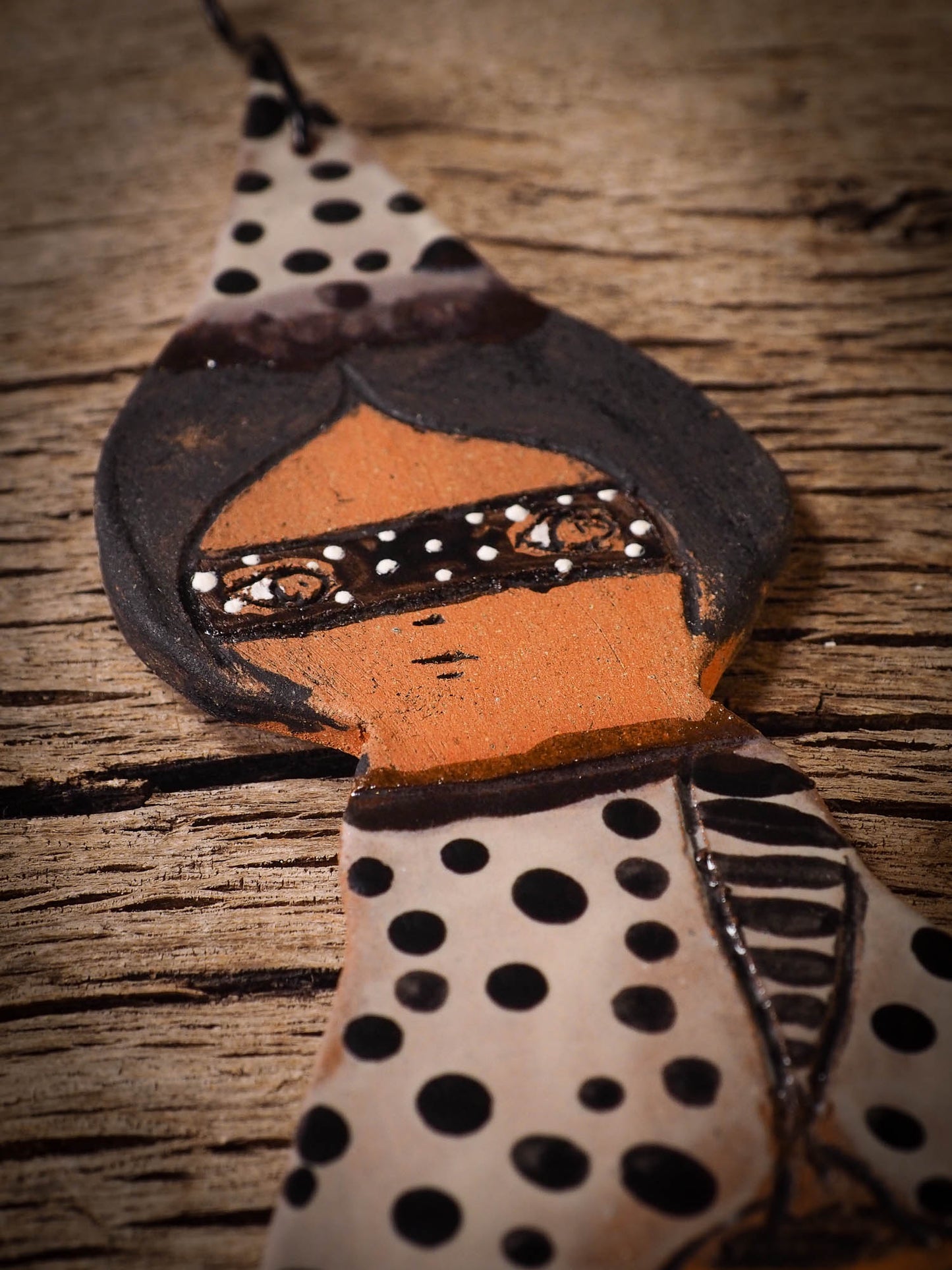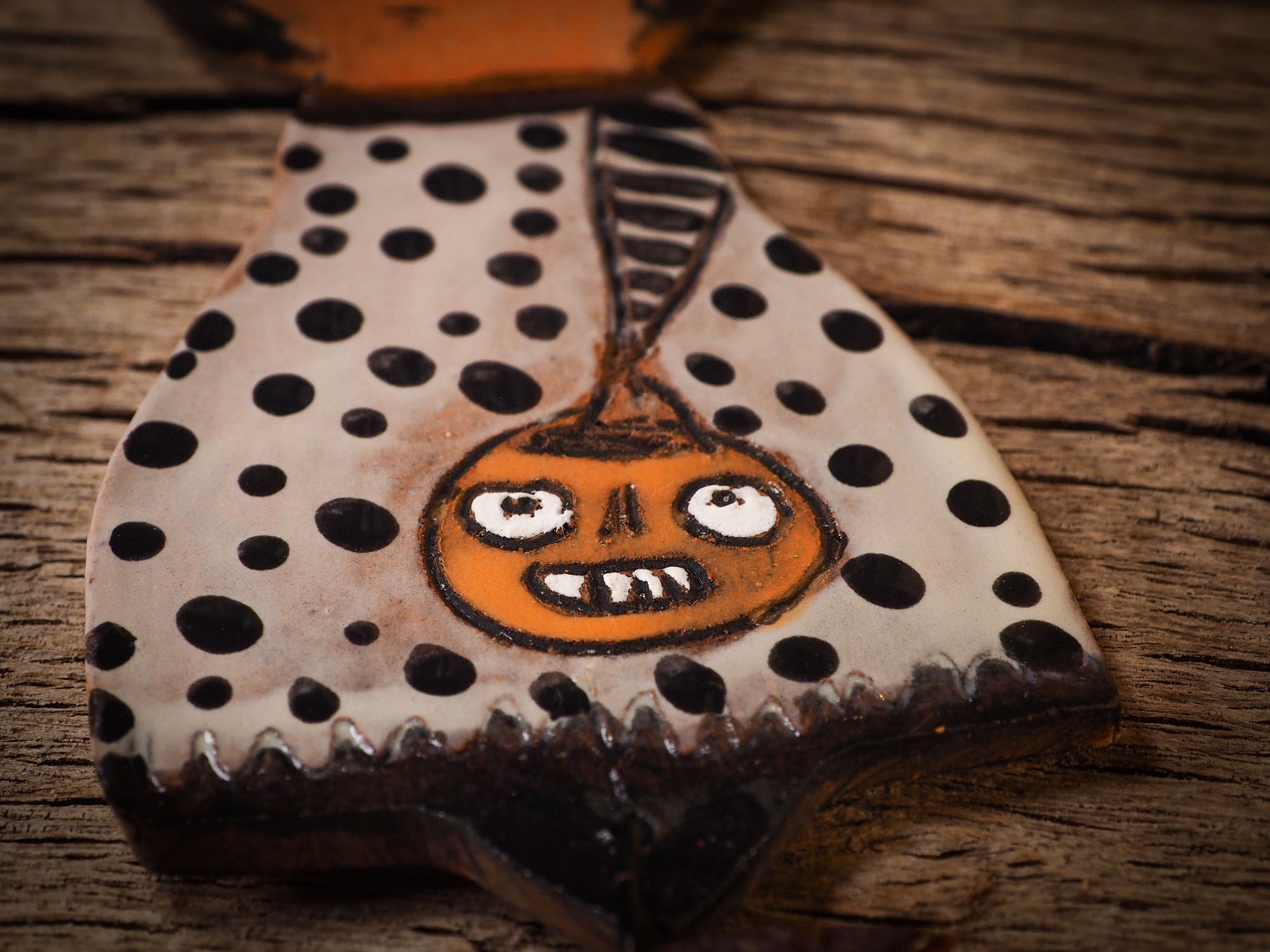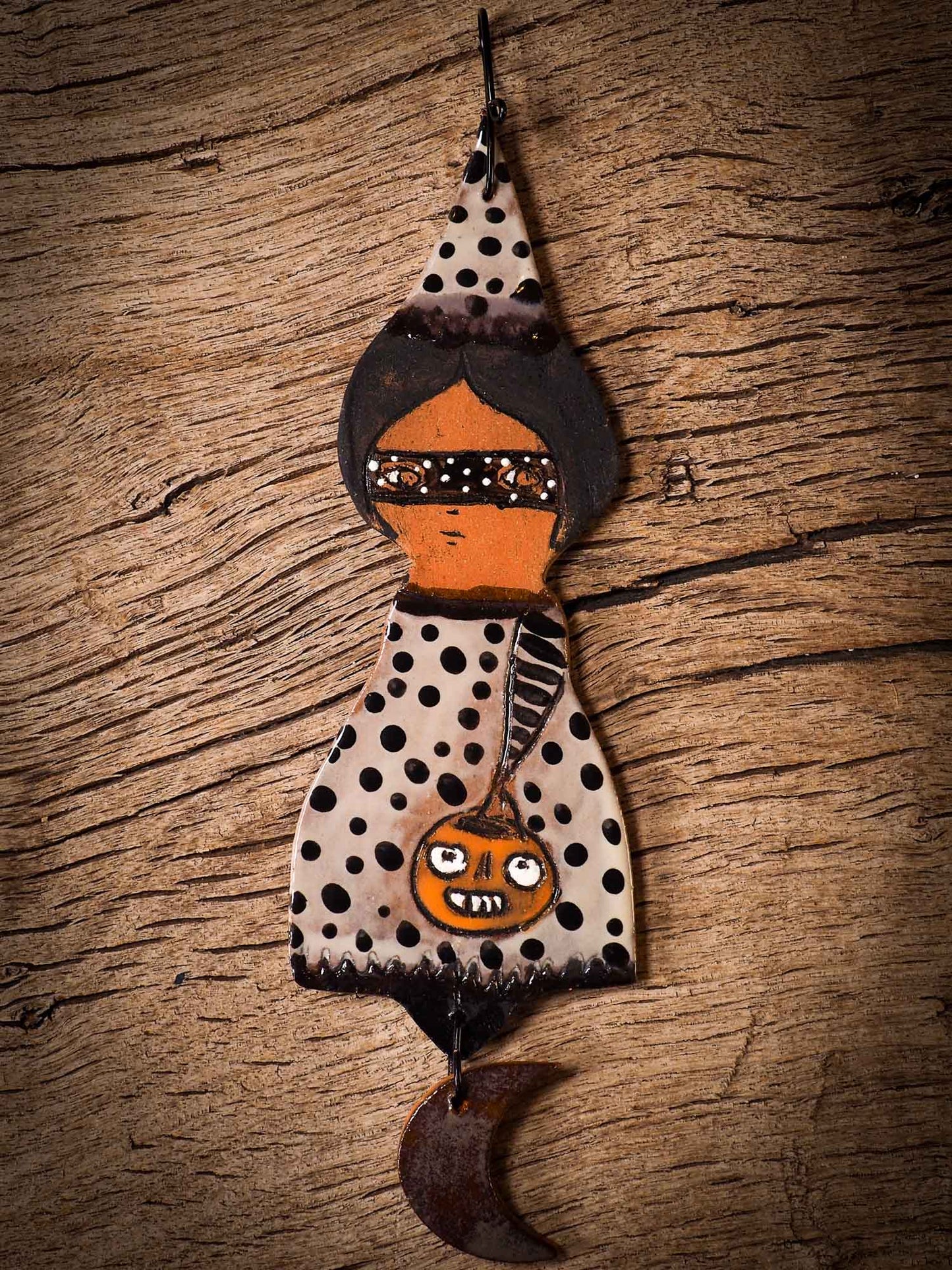 An original handmade Halloween ornament by Idania Salcido, Danita Art. Each ornament is hand carved with pumpkins, witches, cats, jack-o-lanterns and moons.