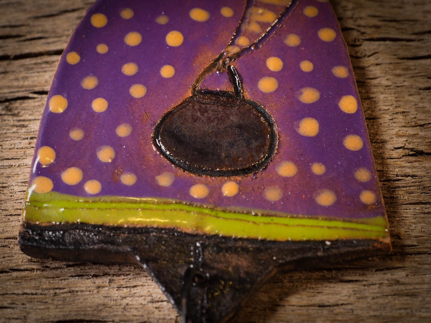 Made with fired glazed ceramics, this little witch, jack-o-lantern and cat is carved with delicate patterns that make each ornament a one of a kind work of art.