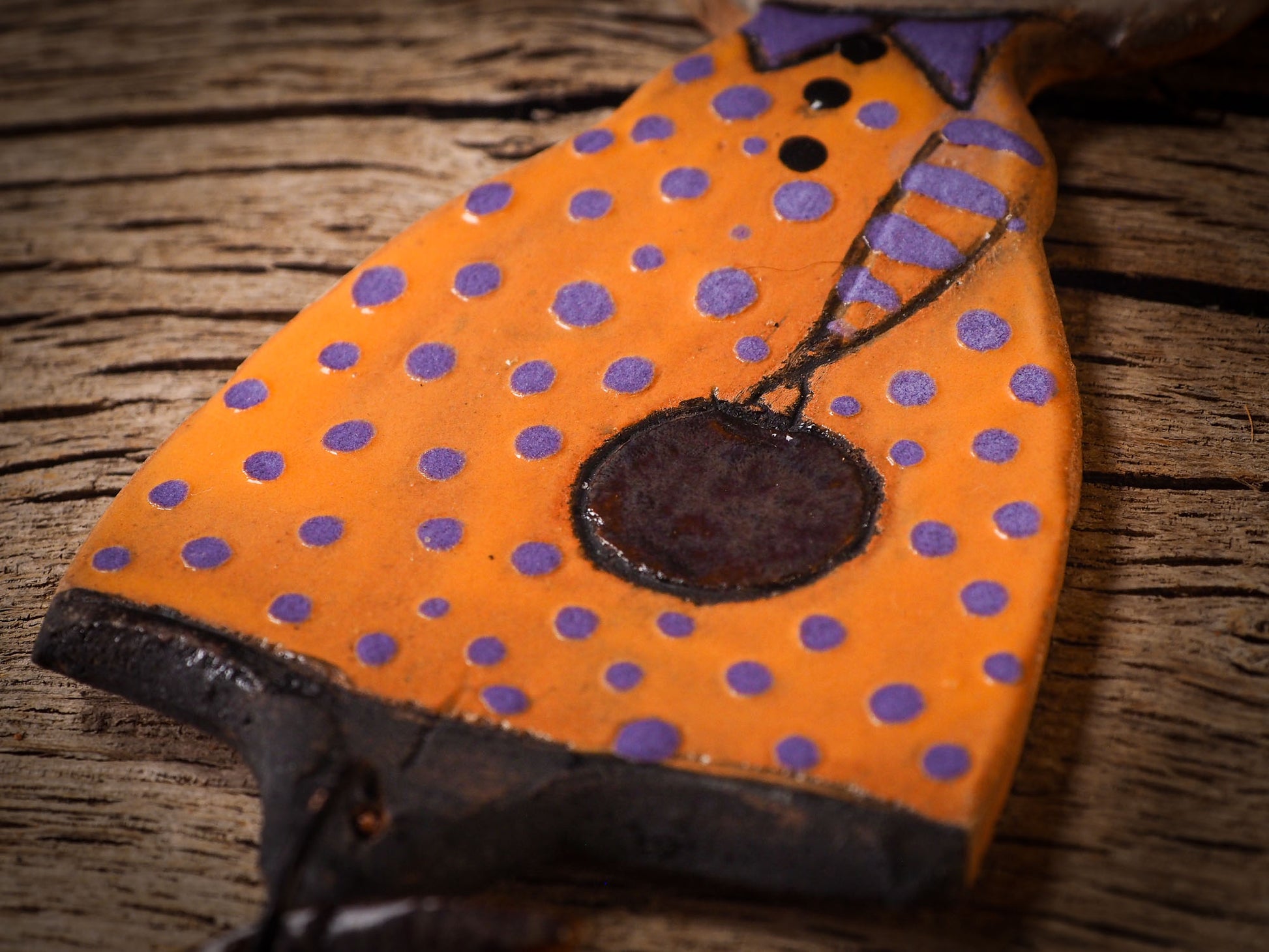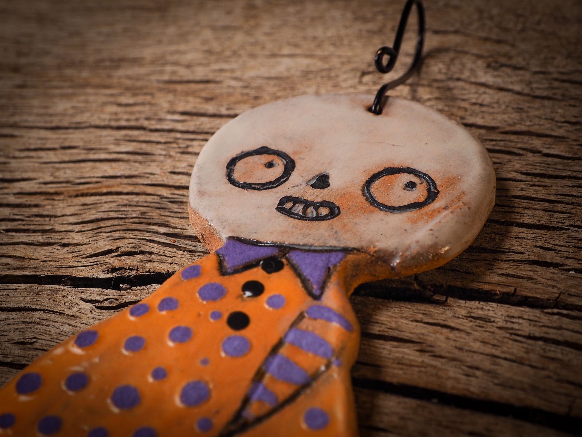 Made with fired glazed ceramics, this little witch, jack-o-lantern and cat is carved with delicate patterns that make each ornament a one of a kind work of art.