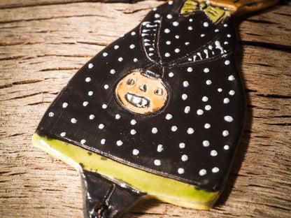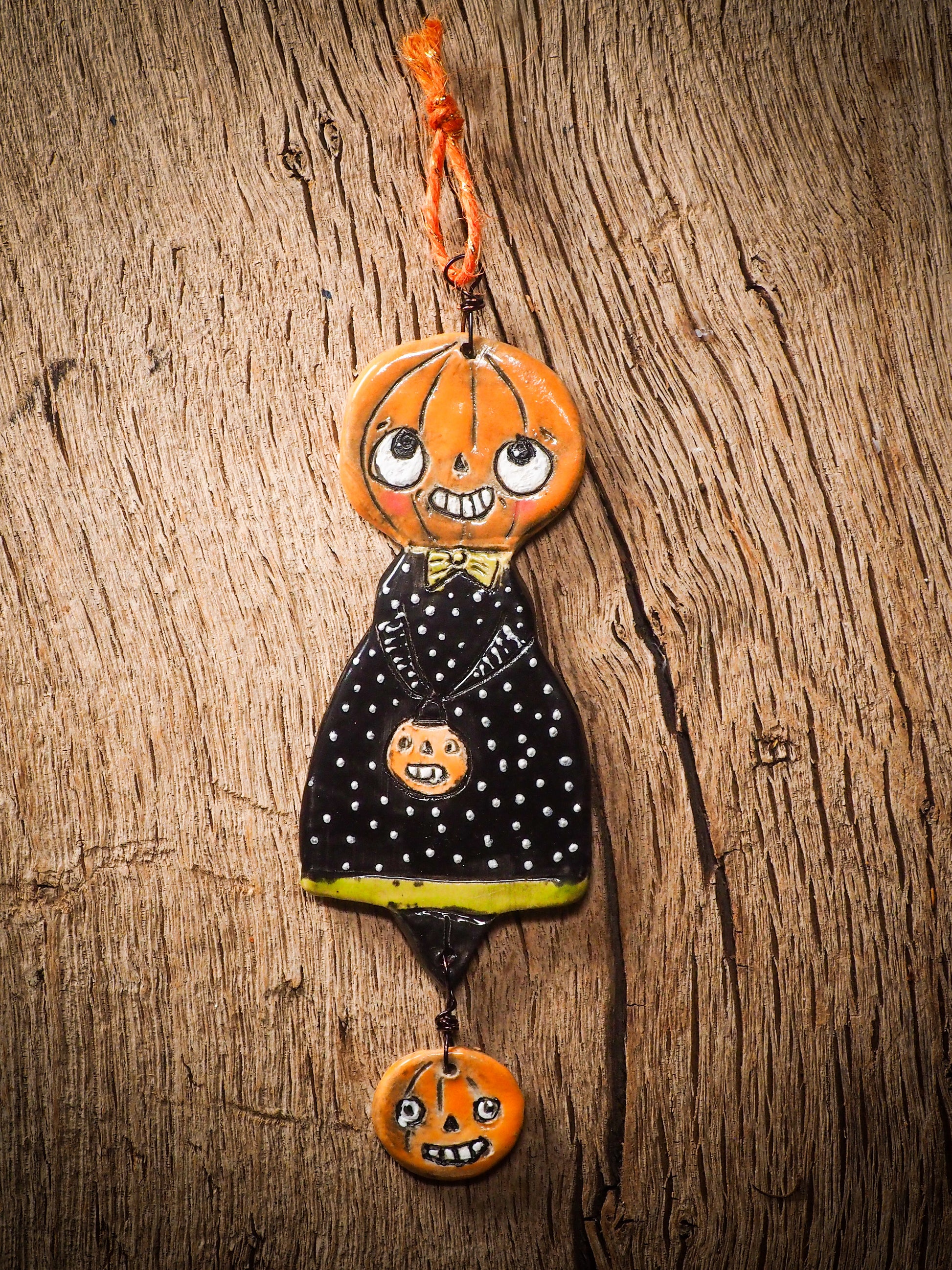 An original handmade Halloween ornament by Idania Salcido, Danita Art. Each ornament is hand carved with pumpkins, witches, cats, jack-o-lanterns and moons.
