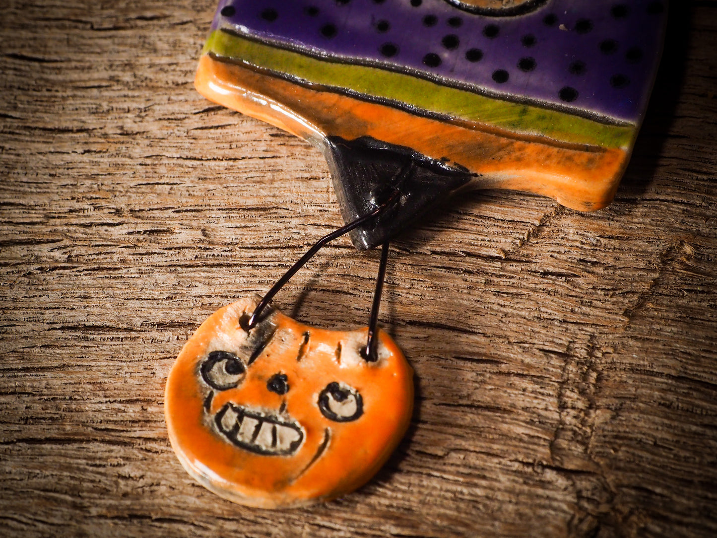 An original handmade Halloween ornament by Idania Salcido, Danita Art. Each ornament is hand carved with pumpkins, witches, cats, jack-o-lanterns and moons.