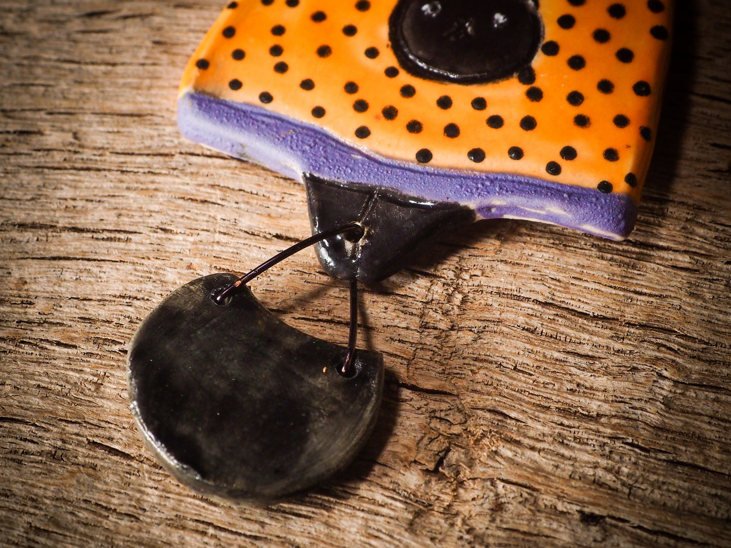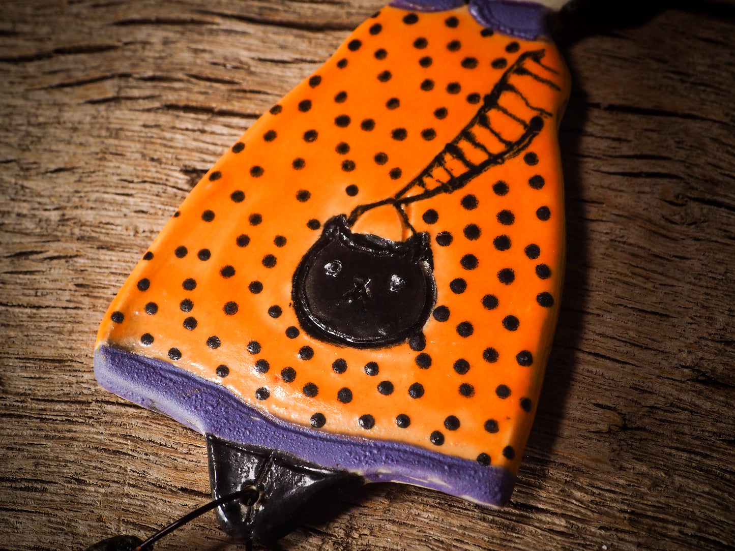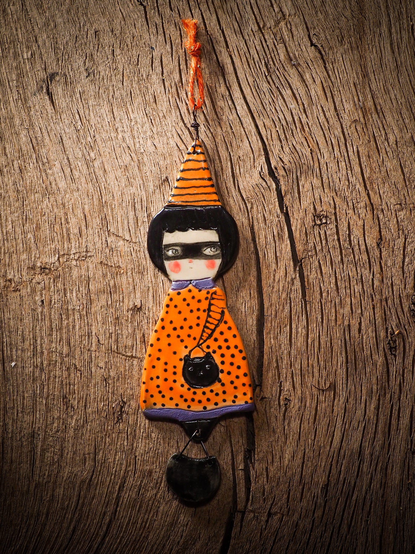 An original handmade Halloween ornament by Idania Salcido, Danita Art. Each ornament is hand carved with pumpkins, witches, cats, jack-o-lanterns and moons.