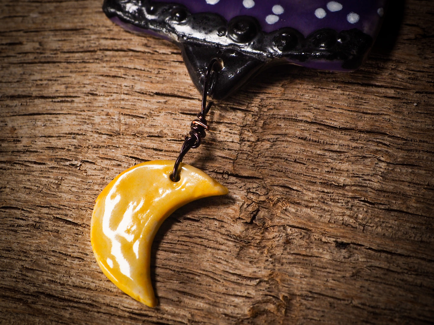 An original handmade Halloween ornament by Idania Salcido, Danita Art. Each ornament is hand carved with pumpkins, witches, cats, jack-o-lanterns and moons.
