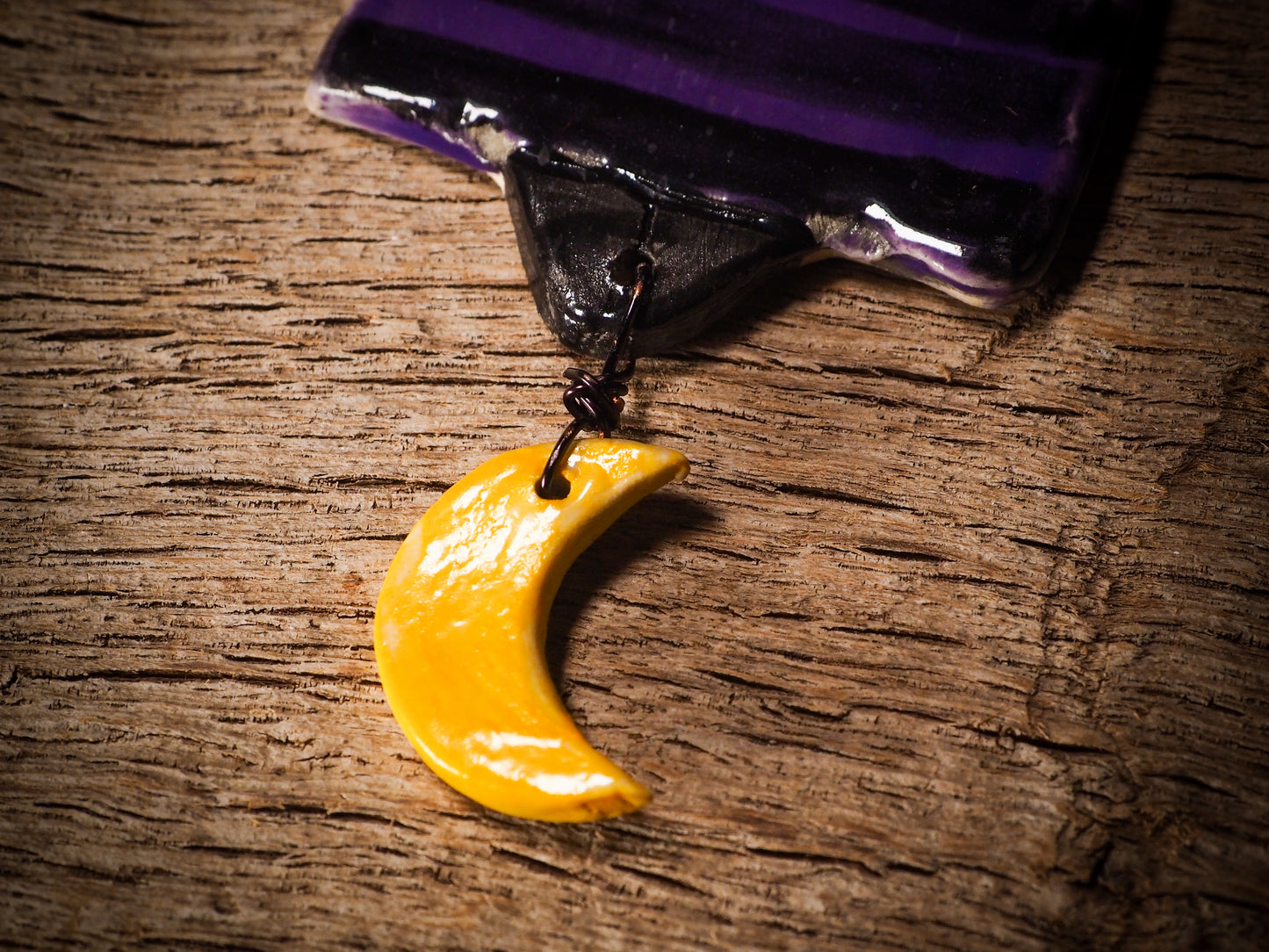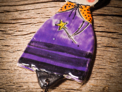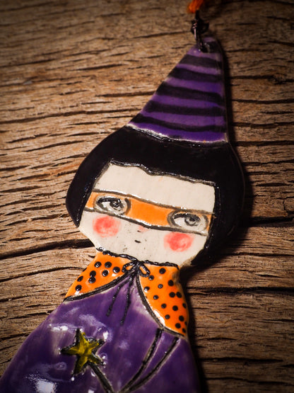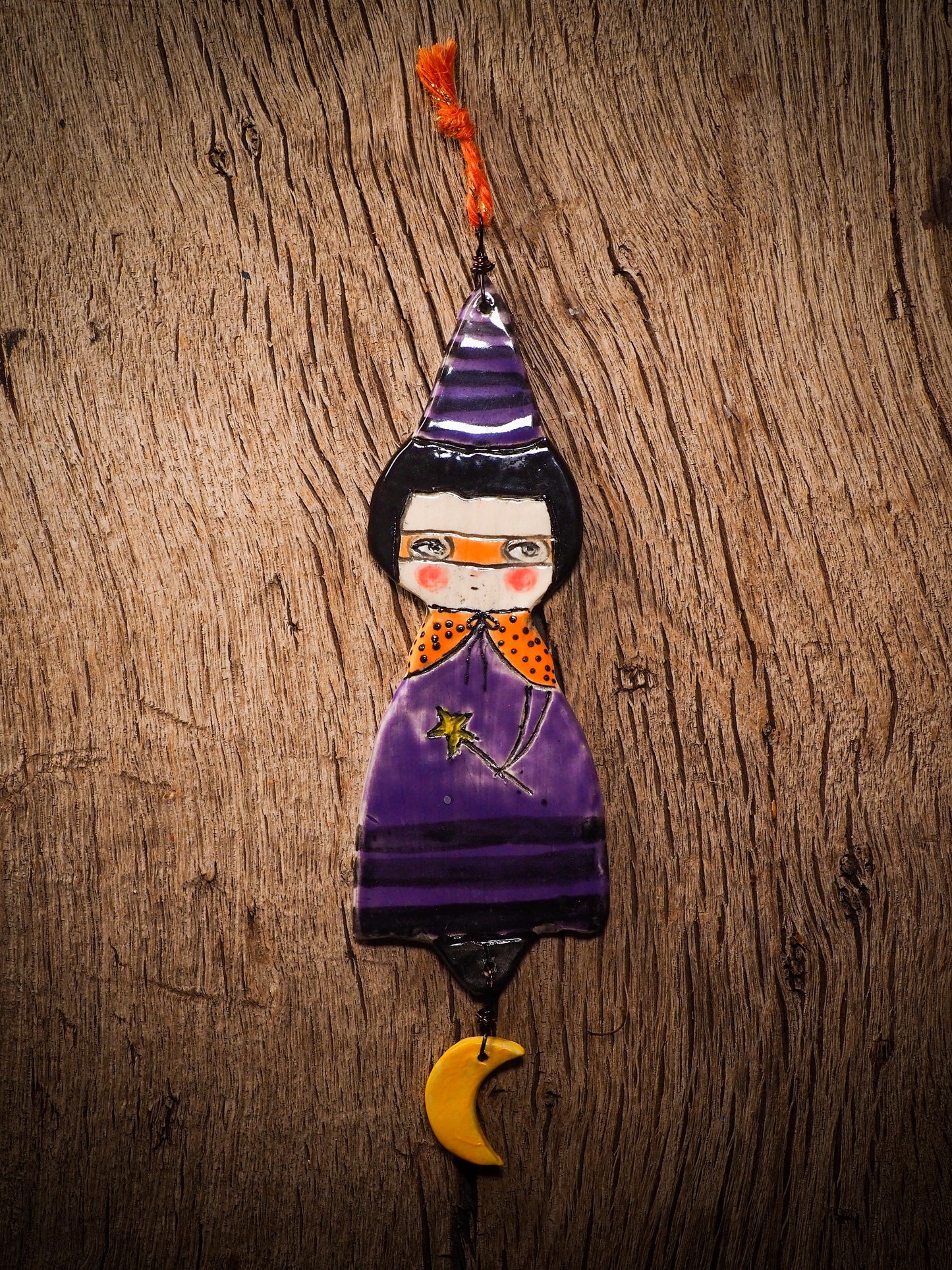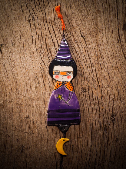 An original handmade Halloween ornament by Idania Salcido, Danita Art. Each ornament is hand carved with pumpkins, witches, cats, jack-o-lanterns and moons.