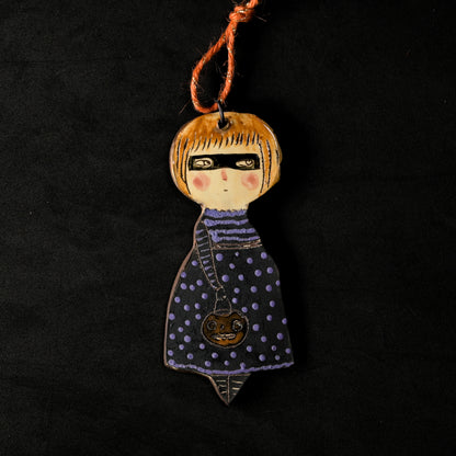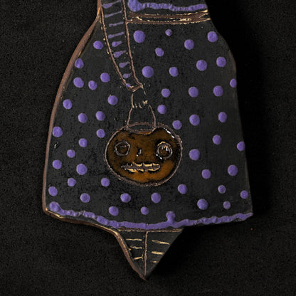 An original handmade Halloween ornament by Idania Salcido, Danita Art. Each ornament is hand carved with pumpkins, witches, cats, jack-o-lanterns and moons.