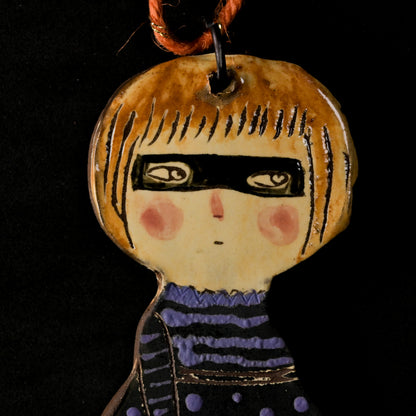 Made with fired glazed ceramics, this little witch, jack-o-lantern and cat is carved with delicate patterns that make each ornament a one of a kind work of art.