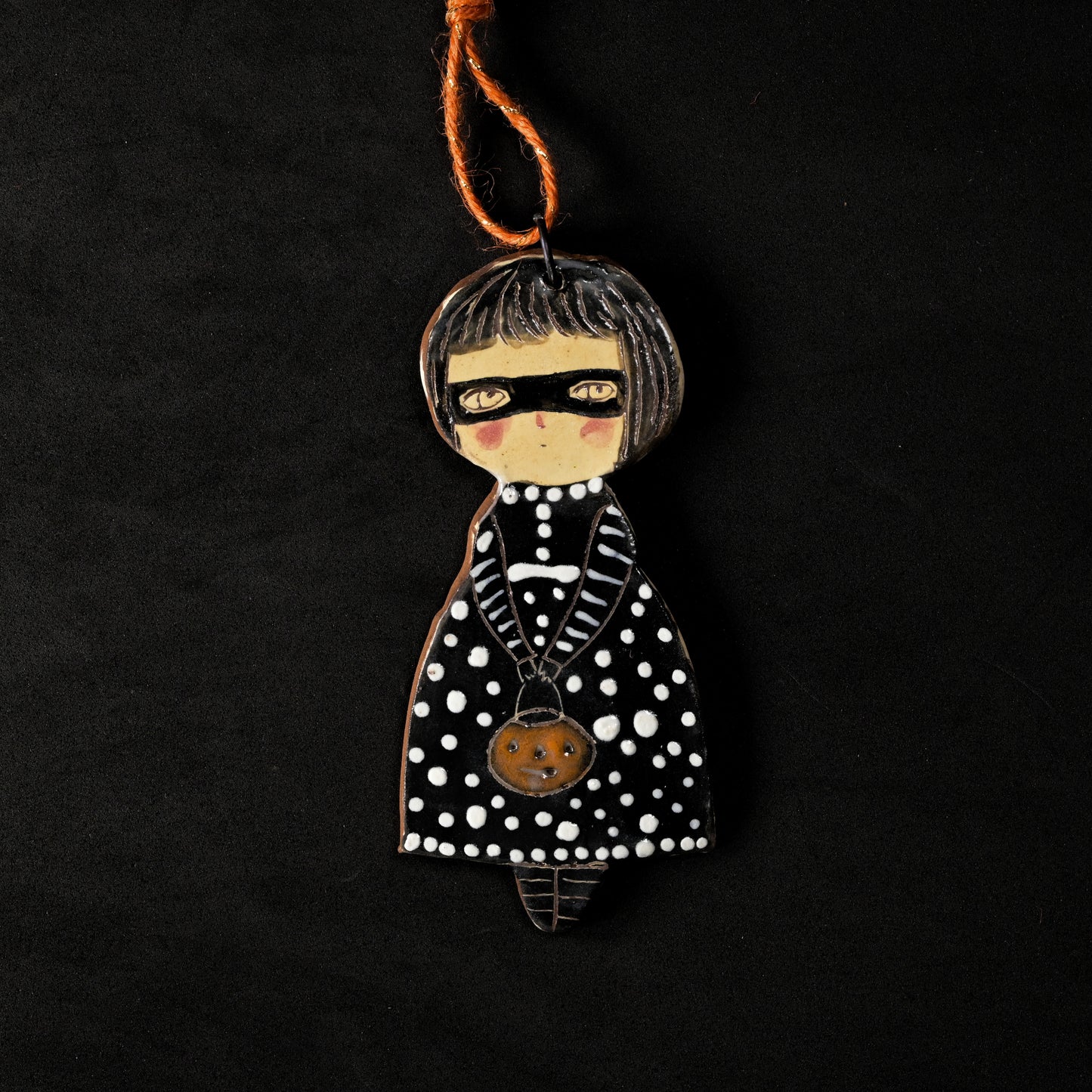 An original handmade Halloween ornament by Idania Salcido, Danita Art. Each ornament is hand carved with pumpkins, witches, cats, jack-o-lanterns and moons.