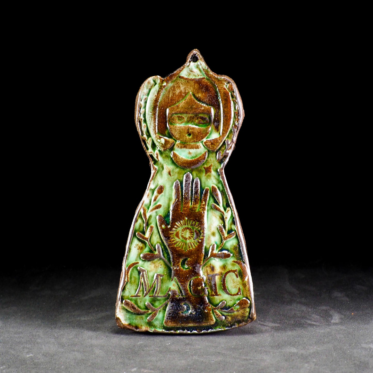 Made with fired glazed ceramics, this little witch, jack-o-lantern and cat is carved with delicate patterns that make each ornament a one of a kind work of art.