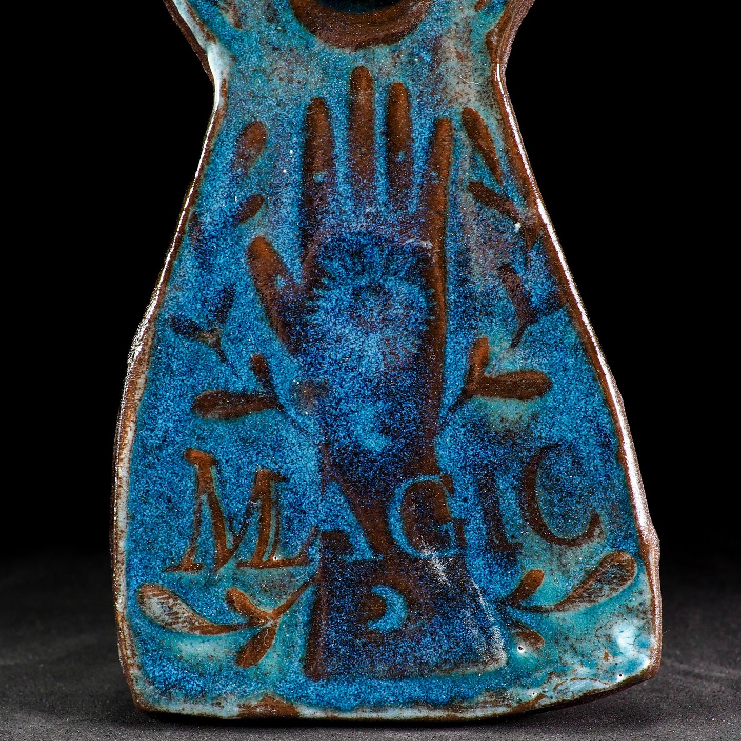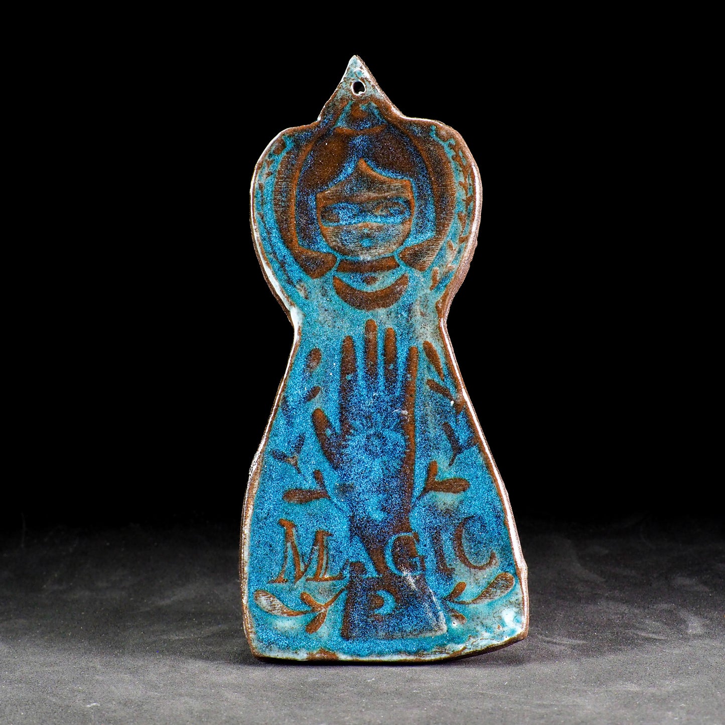 Made with fired glazed ceramics, this little witch, jack-o-lantern and cat is carved with delicate patterns that make each ornament a one of a kind work of art.