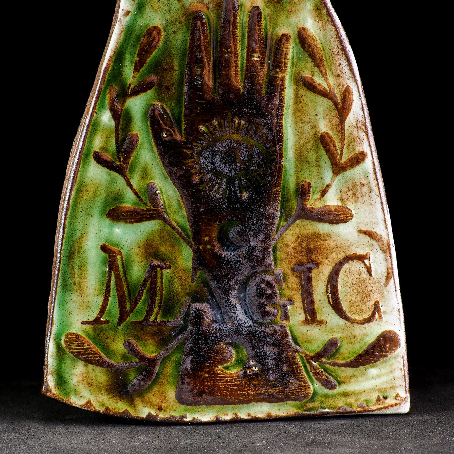 Made with fired glazed ceramics, this little witch, jack-o-lantern and cat is carved with delicate patterns that make each ornament a one of a kind work of art.