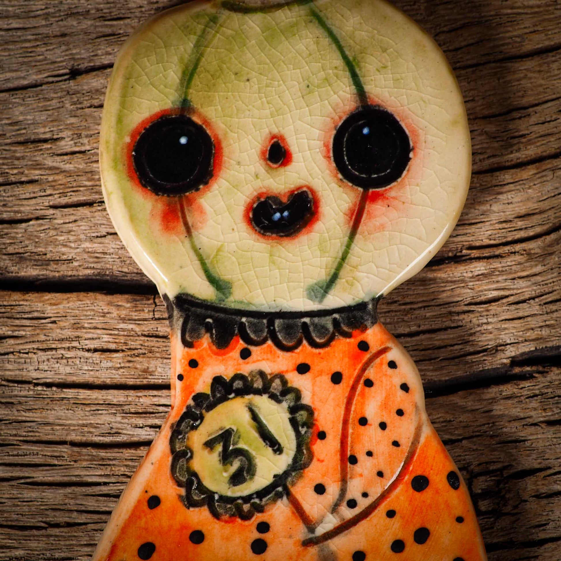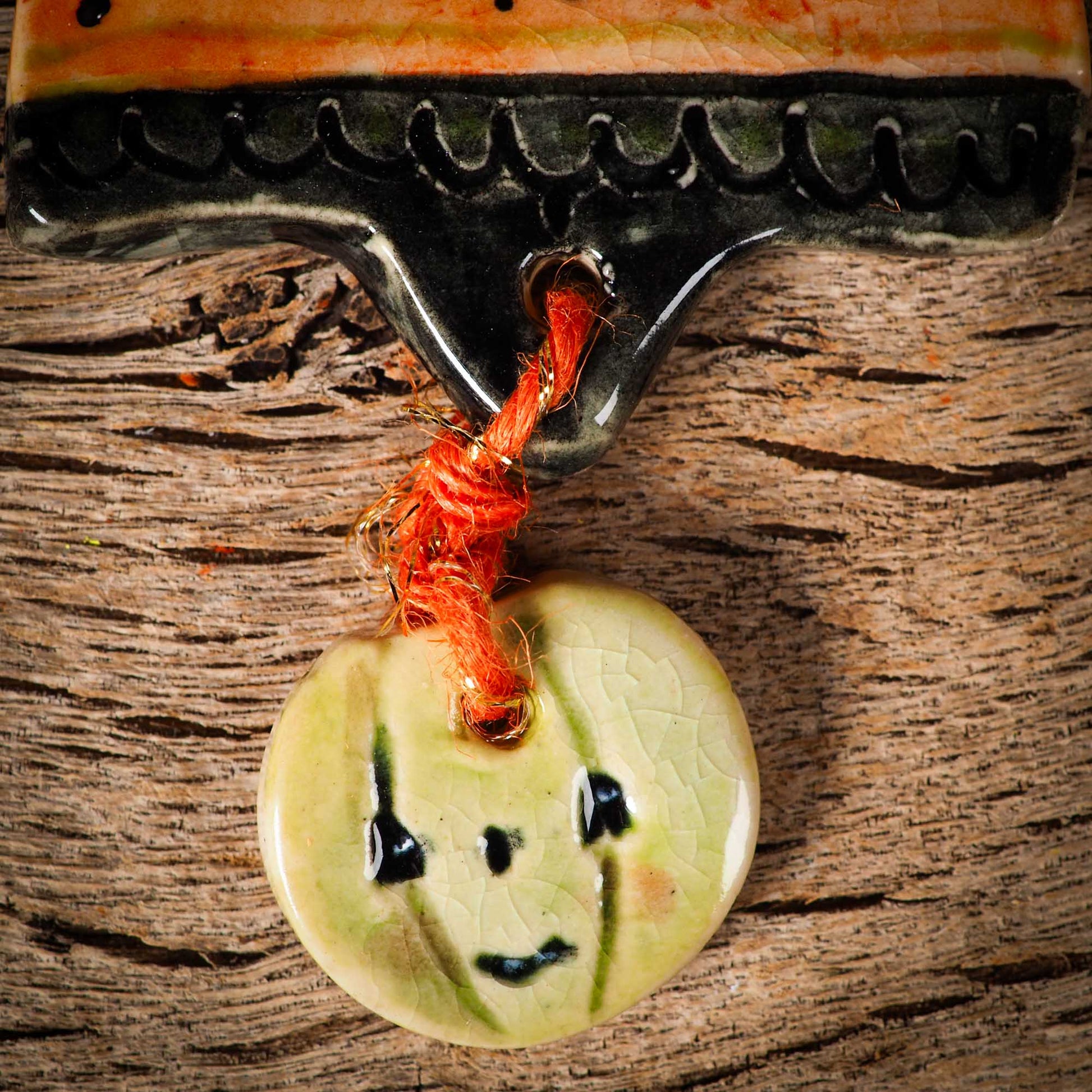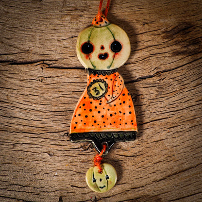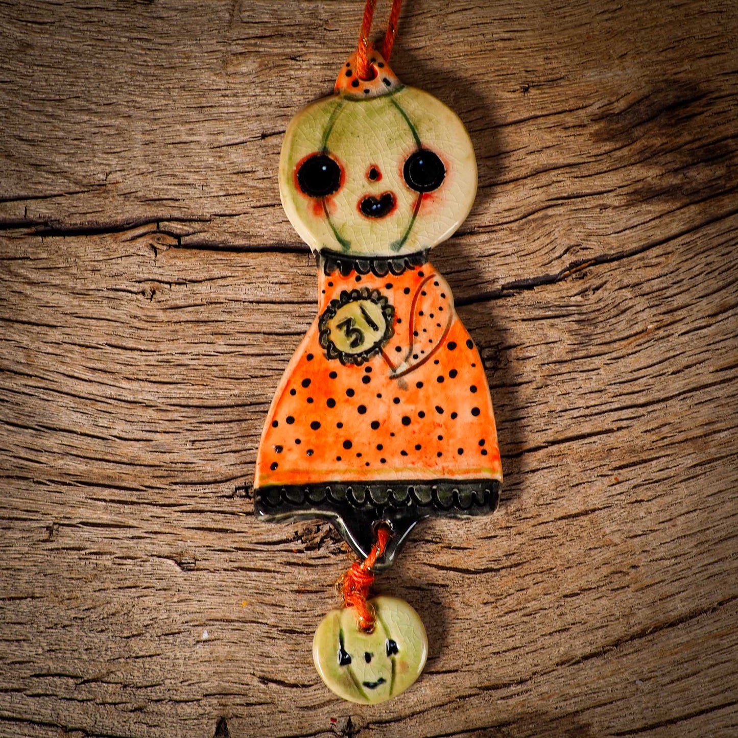 An original handmade Halloween ornament by Idania Salcido, Danita Art. Each ornament is hand carved with pumpkins, witches, cats, jack-o-lanterns and moons.