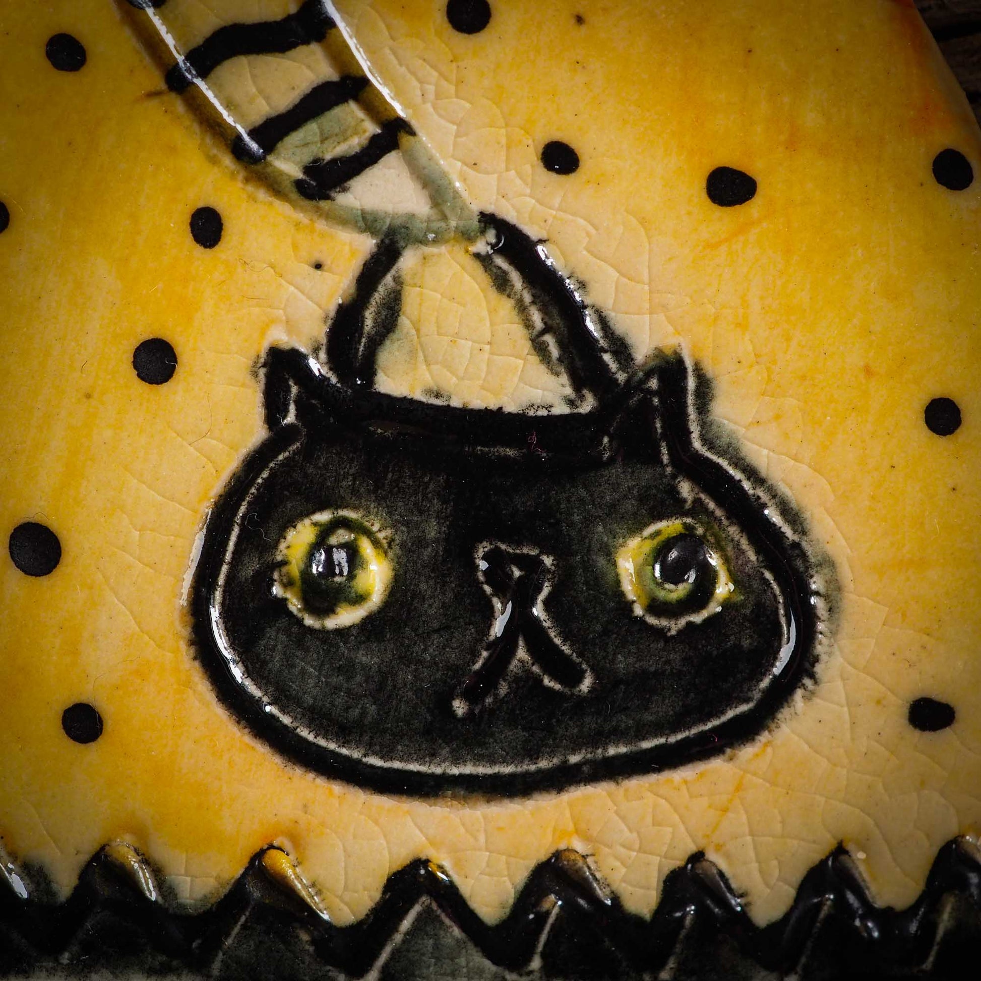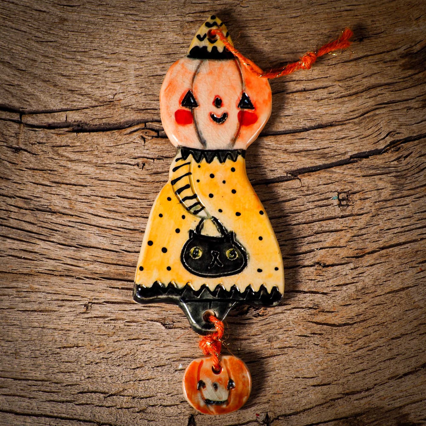 An original handmade Halloween ornament by Idania Salcido, Danita Art. Each ornament is hand carved with pumpkins, witches, cats, jack-o-lanterns and moons.