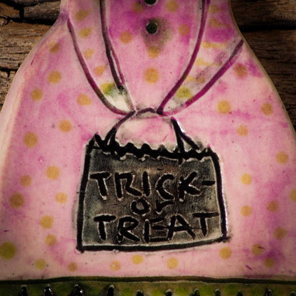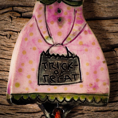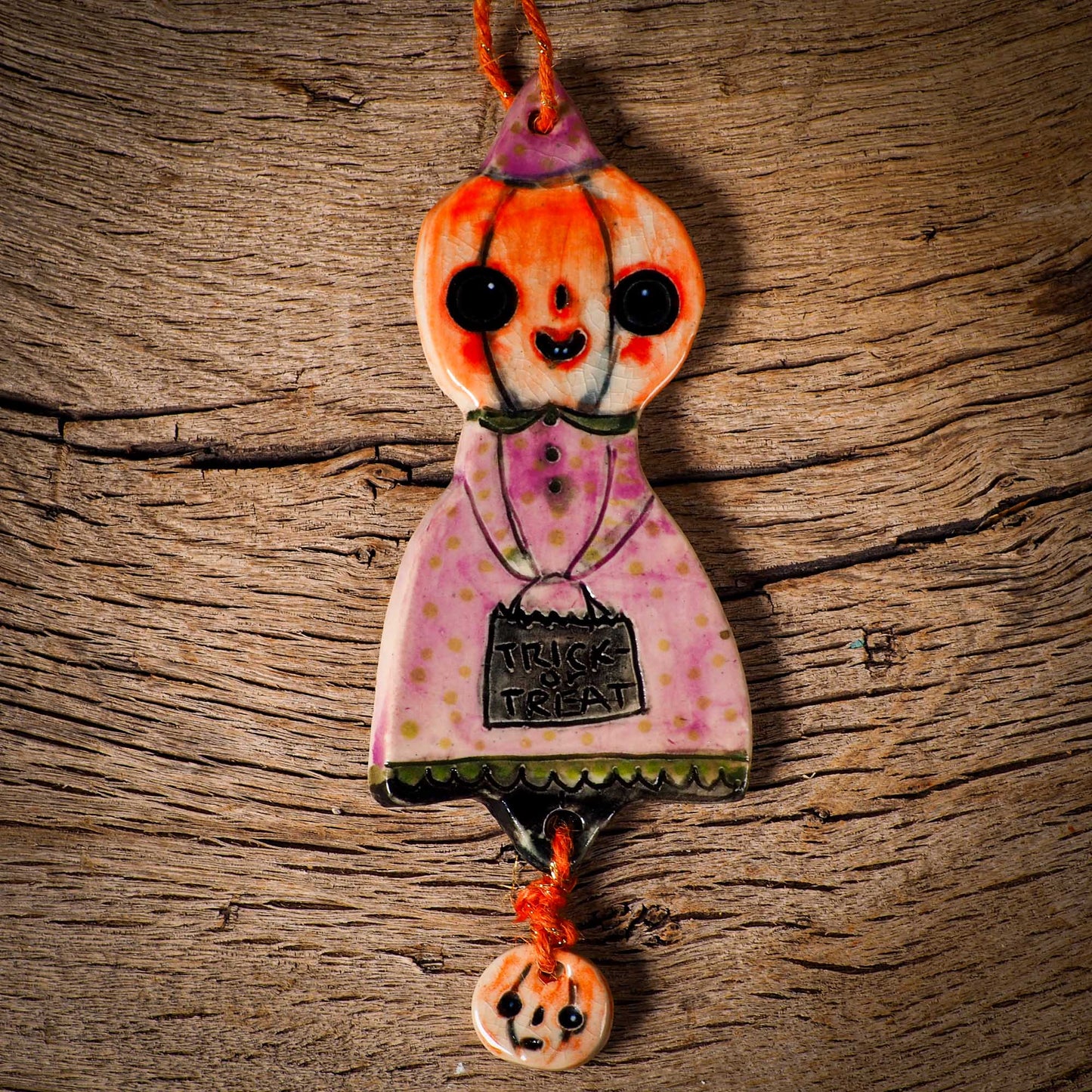 An original handmade Halloween ornament by Idania Salcido, Danita Art. Each ornament is hand carved with pumpkins, witches, cats, jack-o-lanterns and moons.