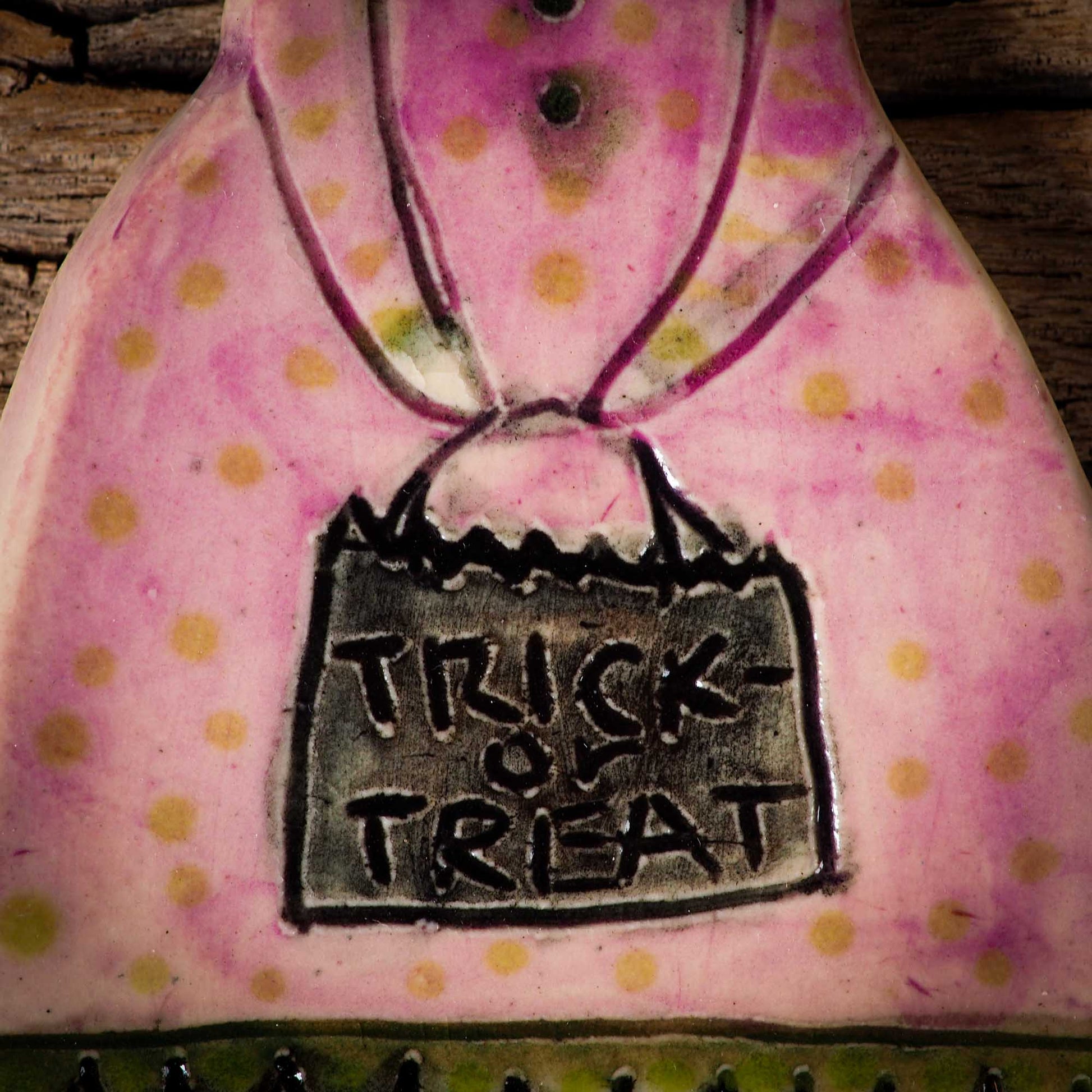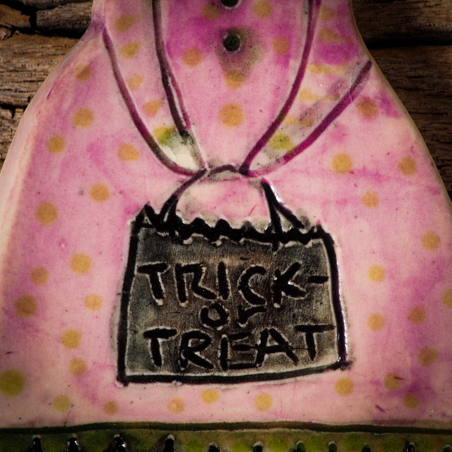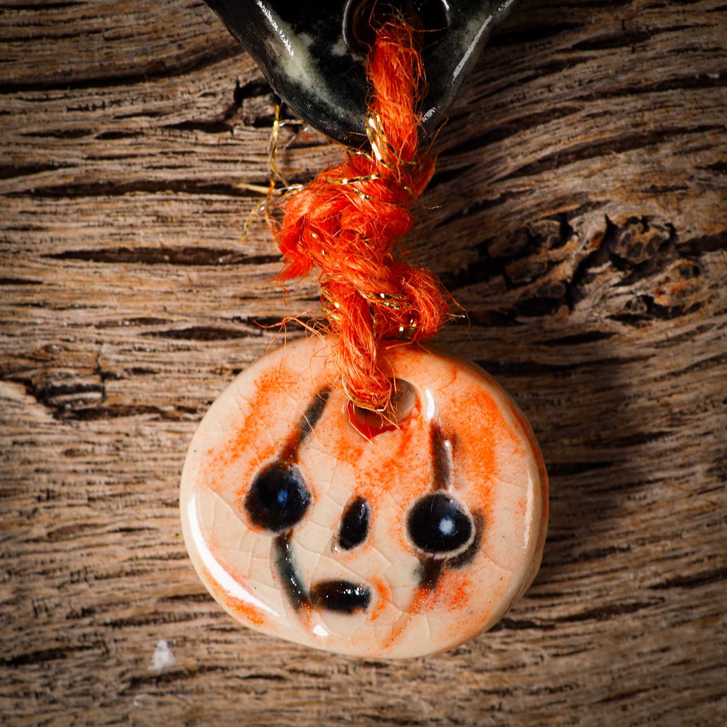 Made with fired glazed ceramics, this little witch, jack-o-lantern and cat is carved with delicate patterns that make each ornament a one of a kind work of art.
