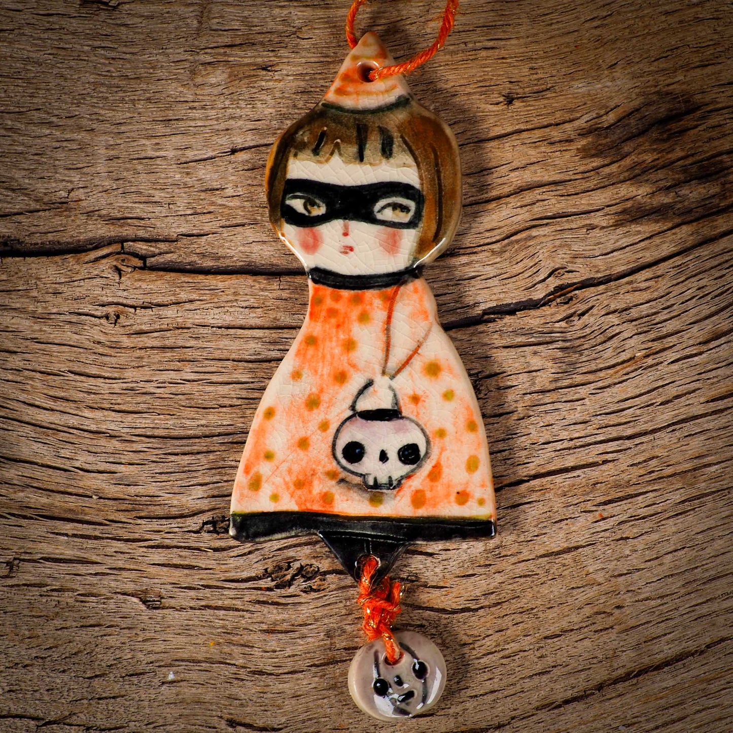 An original handmade Halloween ornament by Idania Salcido, Danita Art. Each ornament is hand carved with pumpkins, witches, cats, jack-o-lanterns and moons.