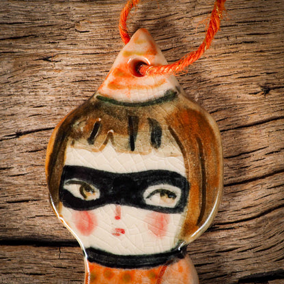 Made with fired glazed ceramics, this little witch, jack-o-lantern and cat is carved with delicate patterns that make each ornament a one of a kind work of art.