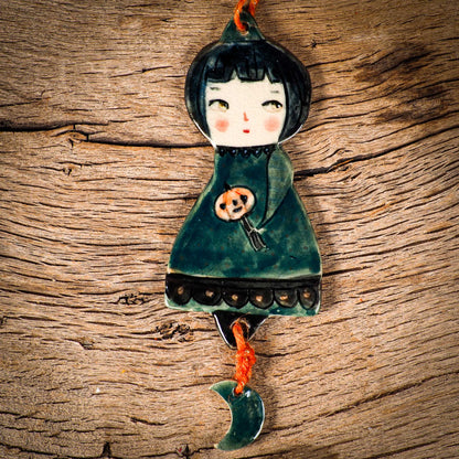 An original handmade Halloween ornament by Idania Salcido, Danita Art. Each ornament is hand carved with pumpkins, witches, cats, jack-o-lanterns and moons.